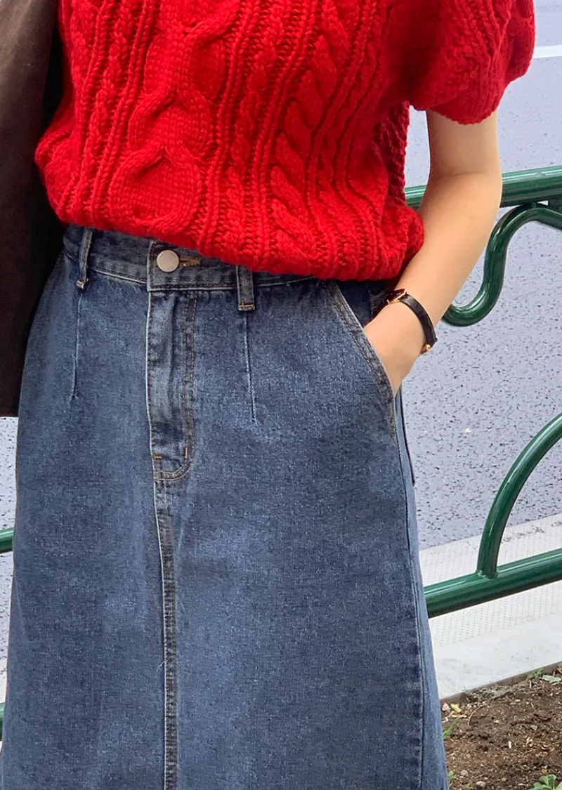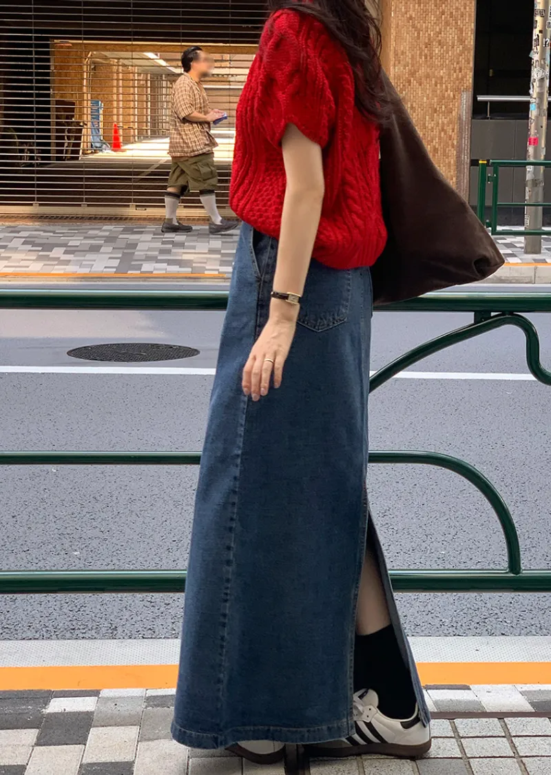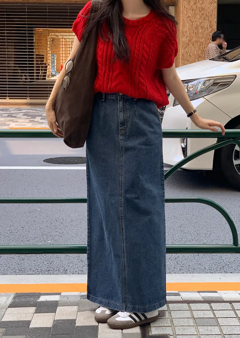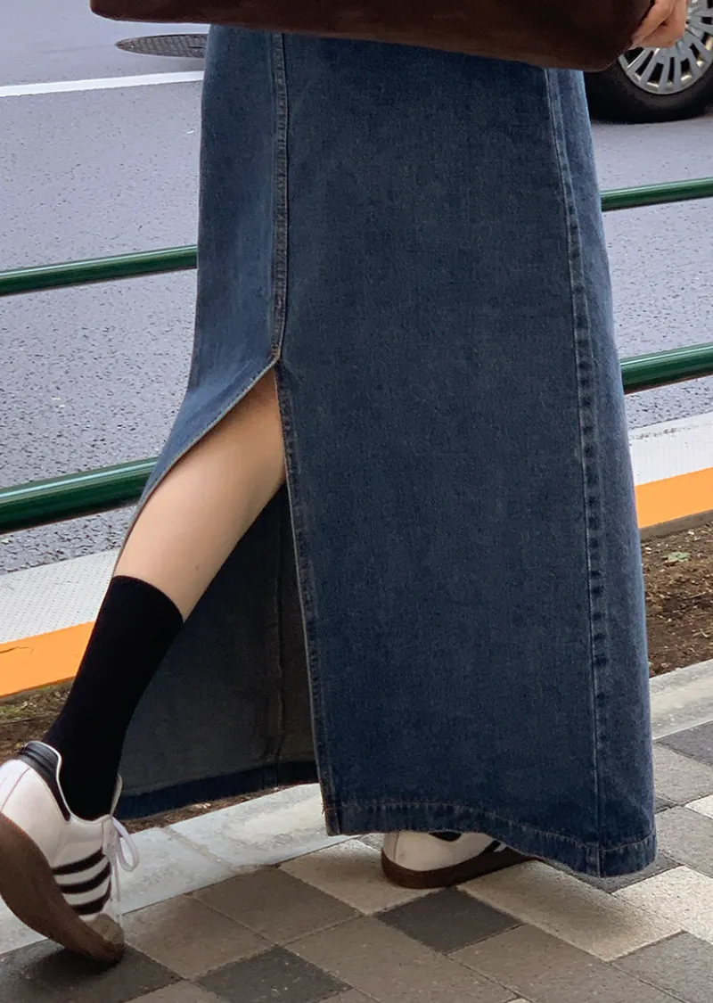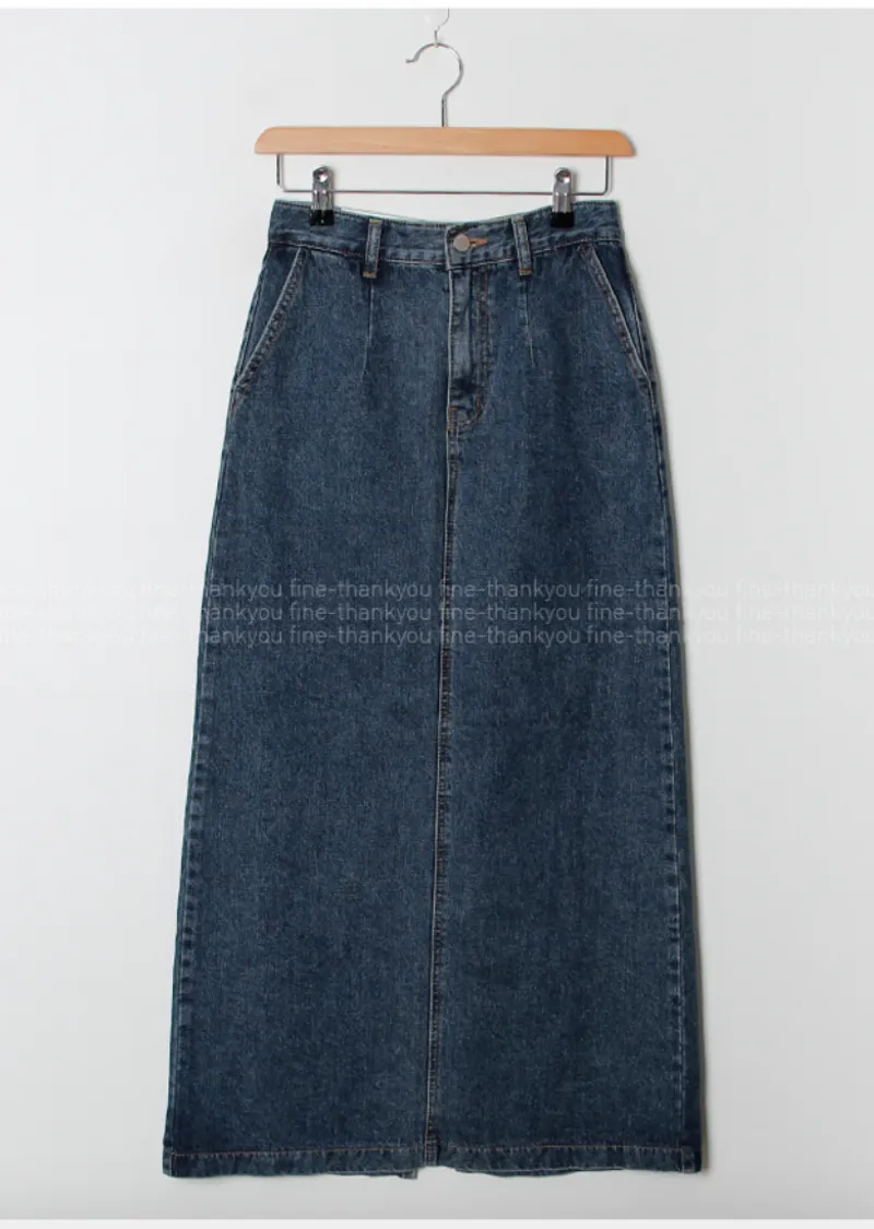 微A字輪廓腰部褶襉及踝長版後開衩牛仔裙