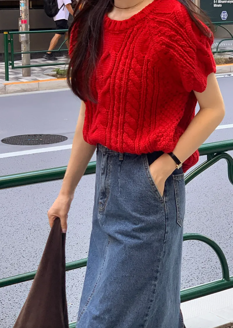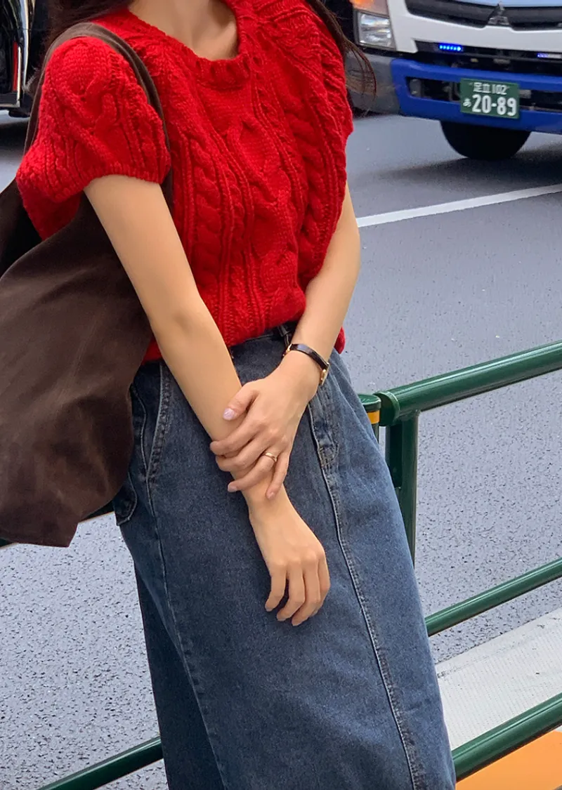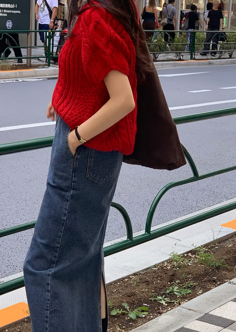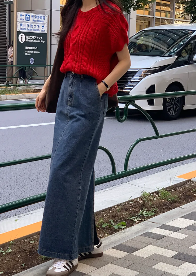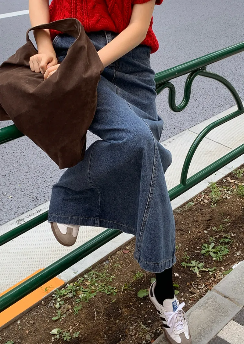 微A字輪廓腰部褶襉及踝長版後開衩牛仔裙