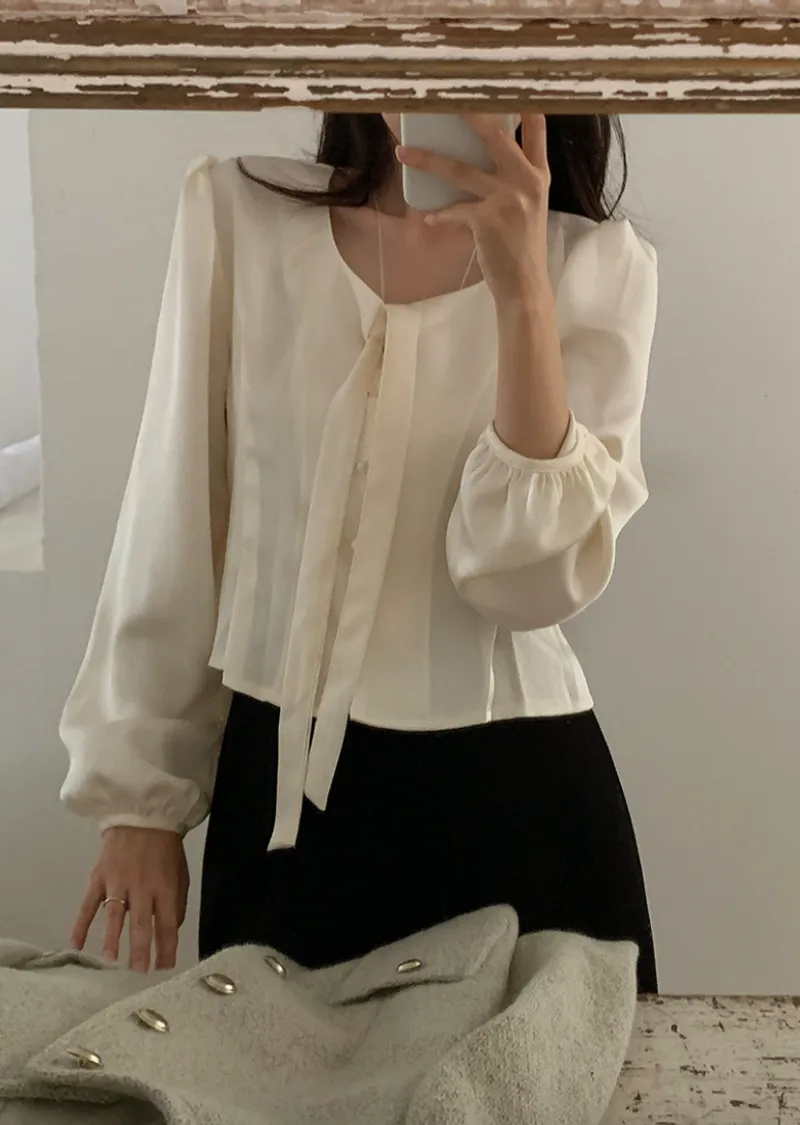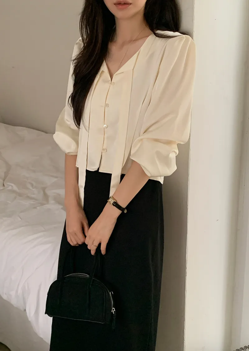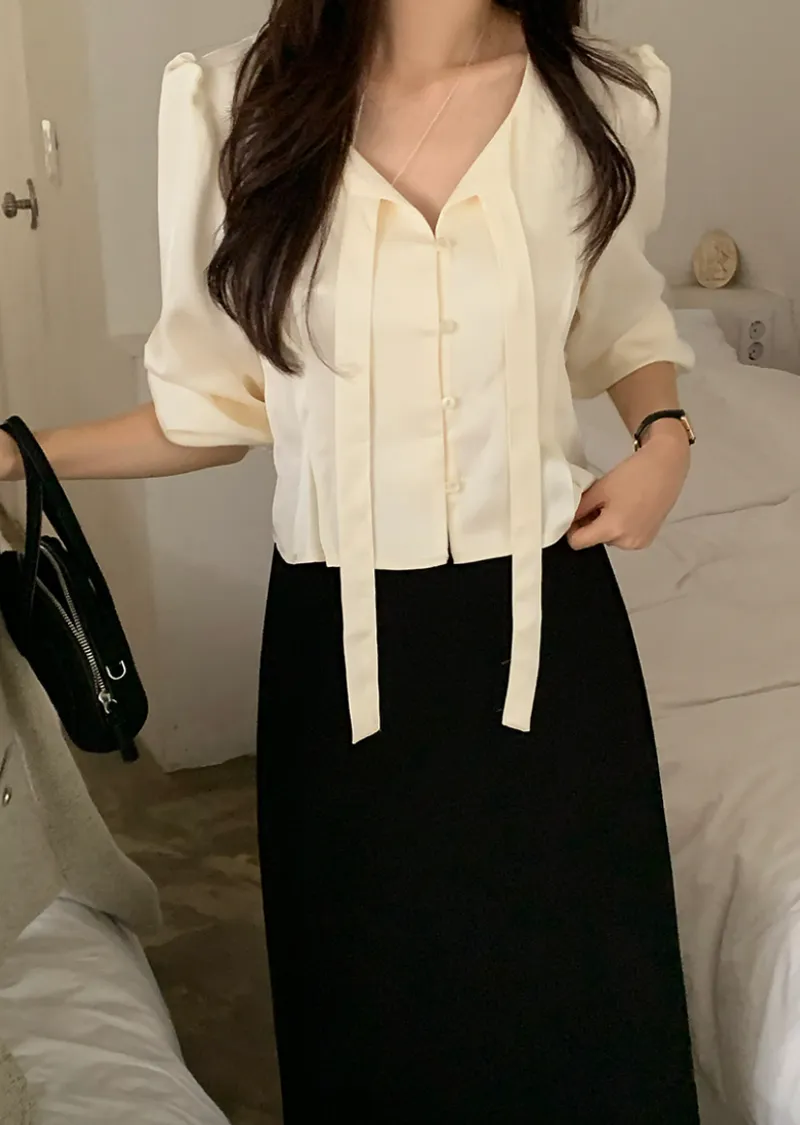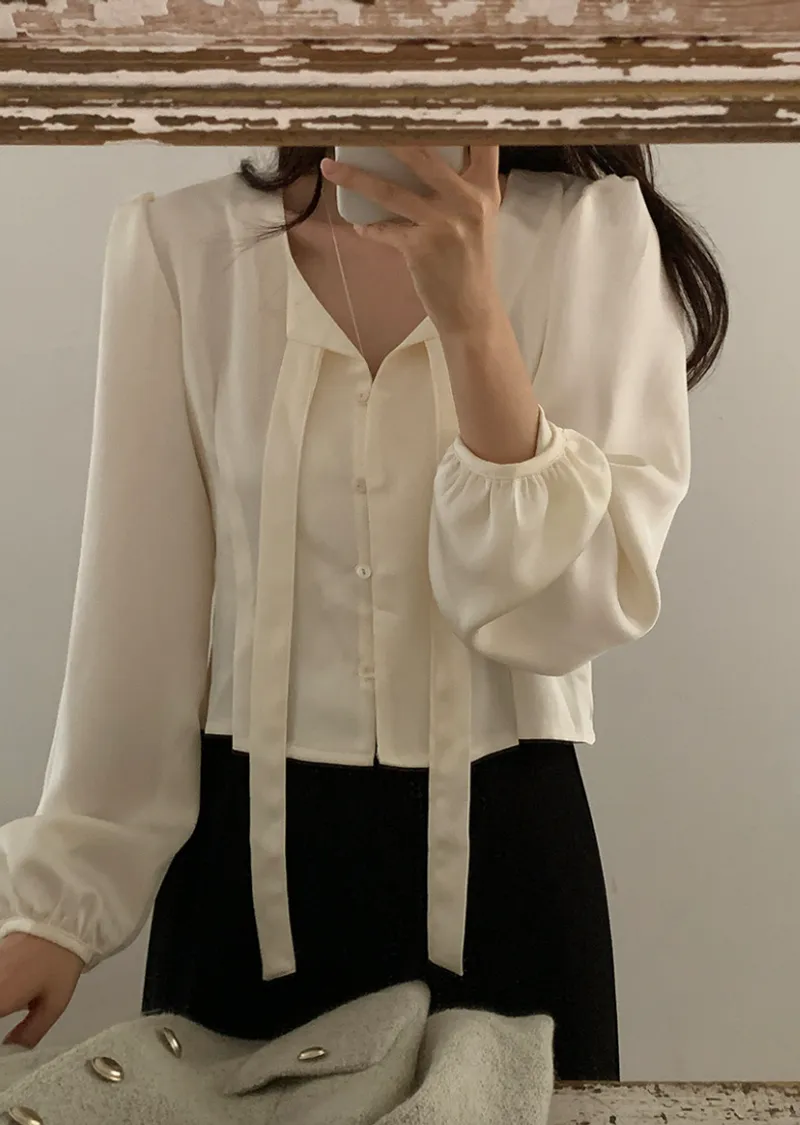 優雅迷人領綁帶腰線褶襉修身排扣上衣