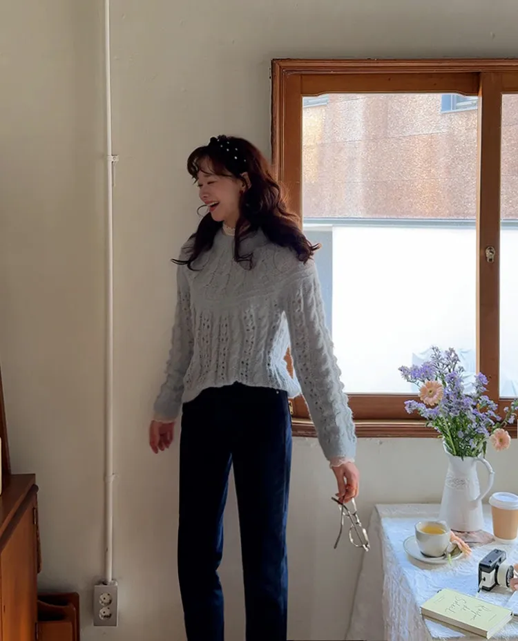 可愛微妙蕾絲線條波浪邊半高領內搭透膚上衣