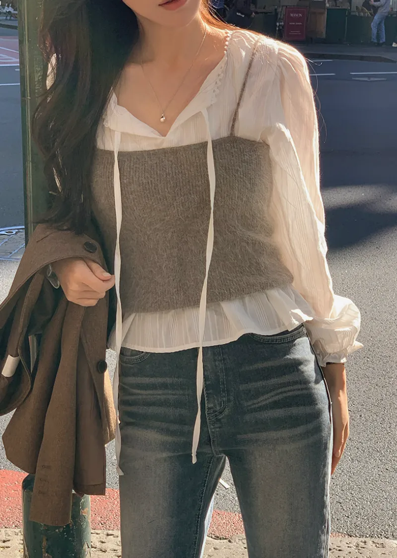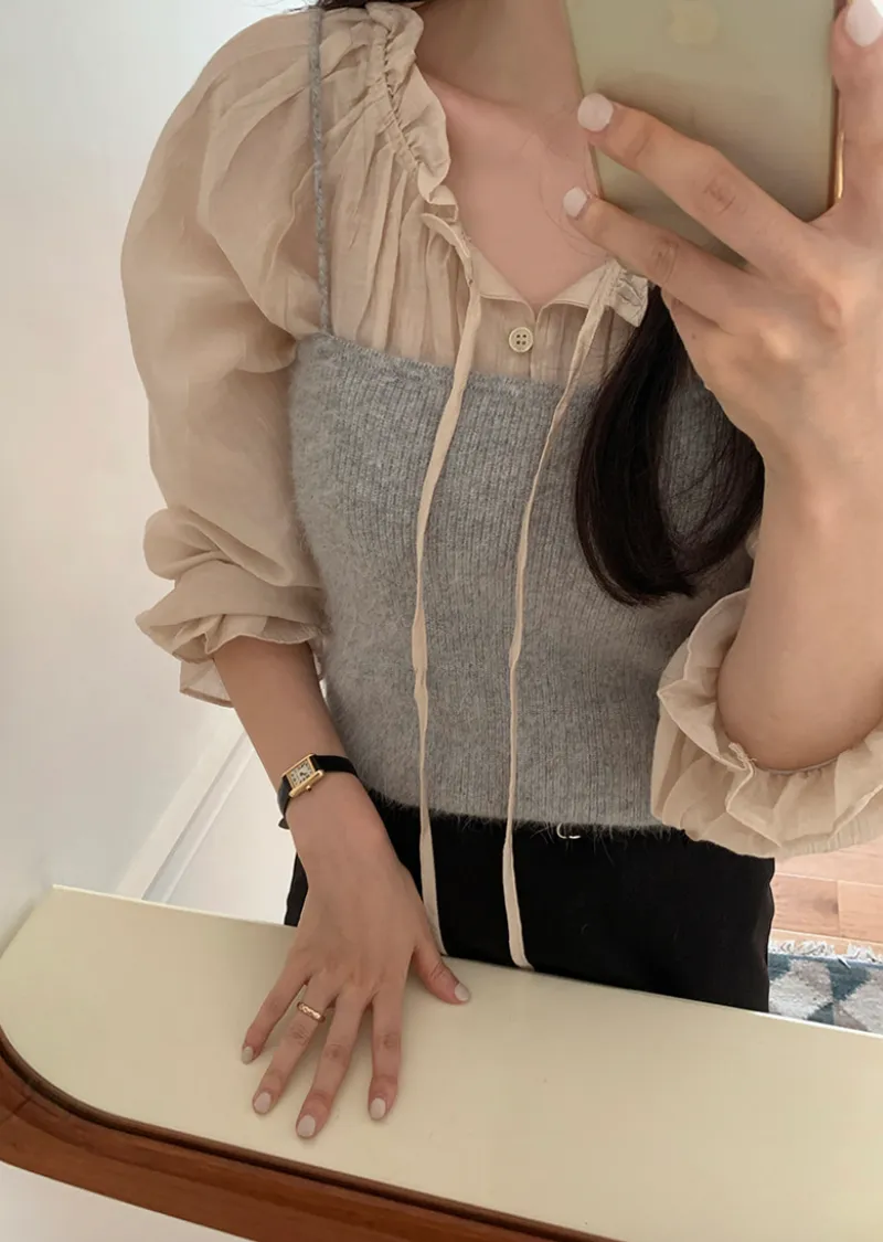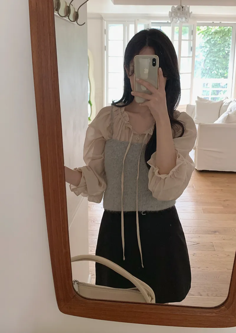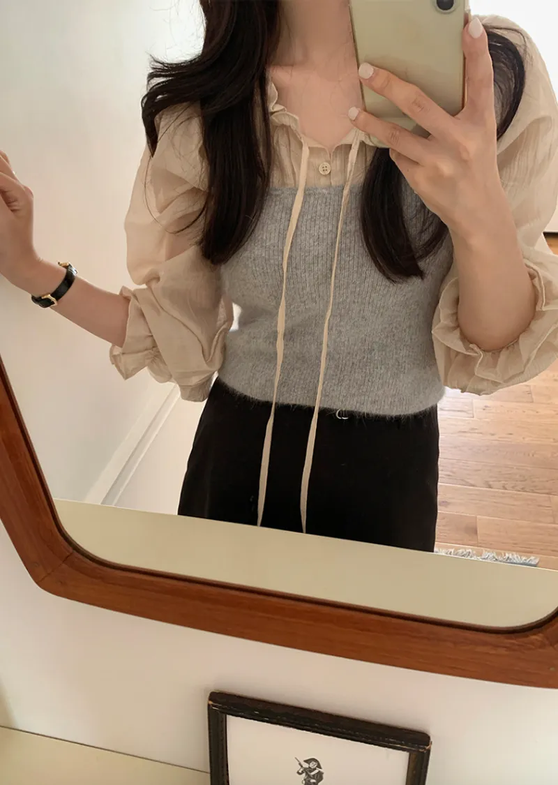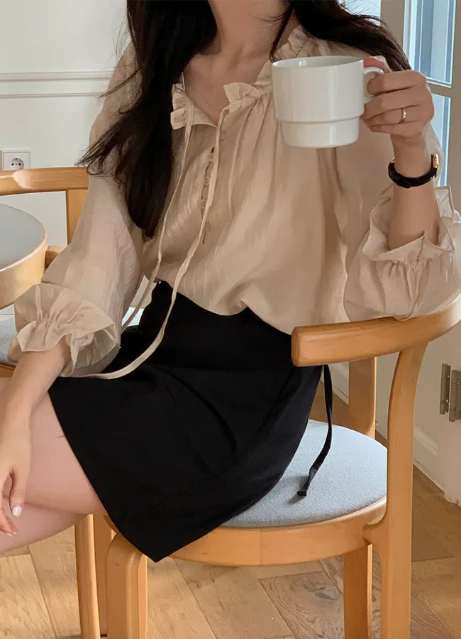 柔美可愛荷葉摺邊領口綁帶線條上衣