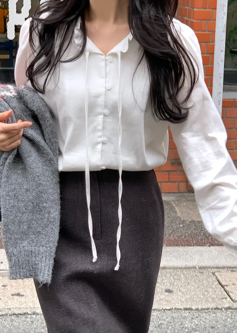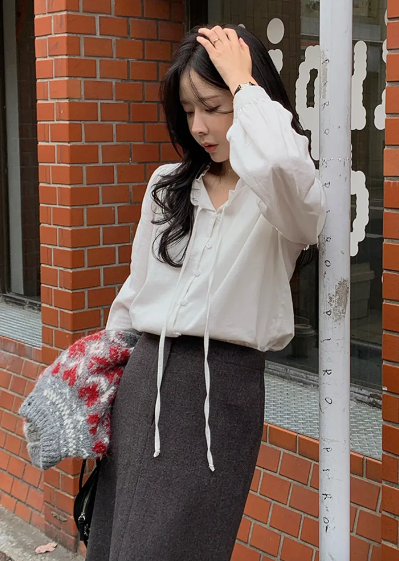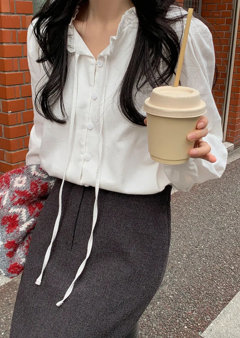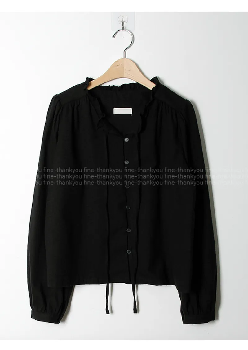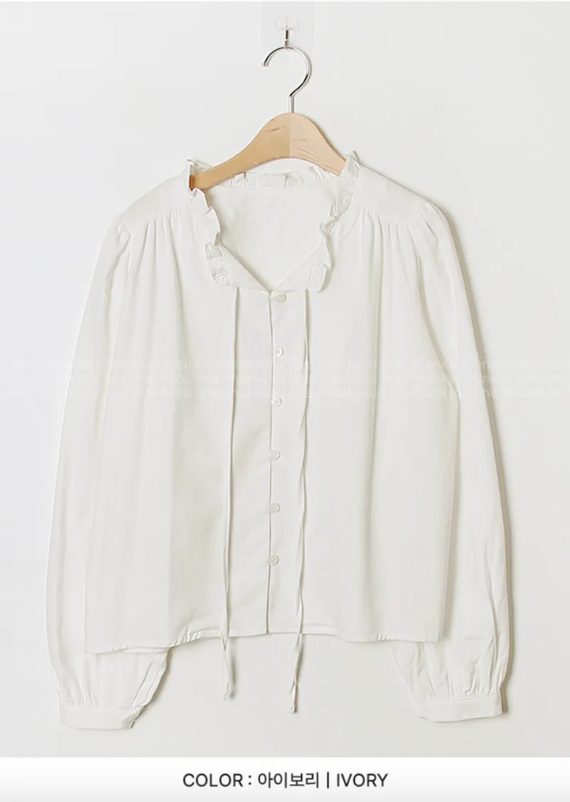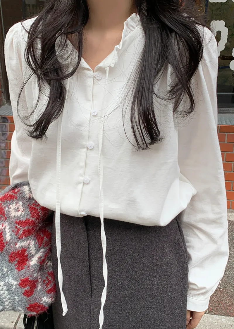 柔美摺邊領口自然隨性綁帶排扣上衣