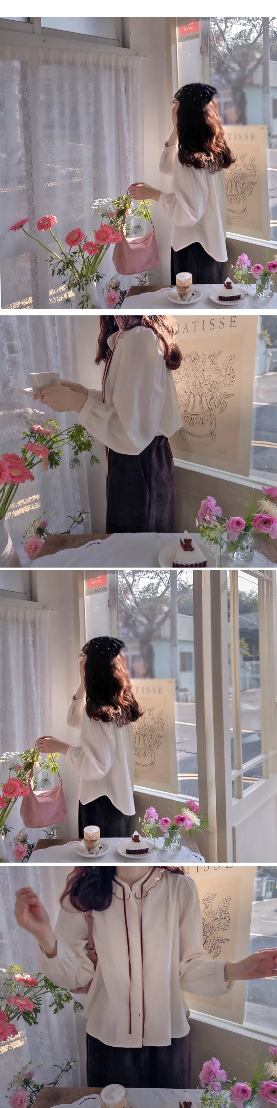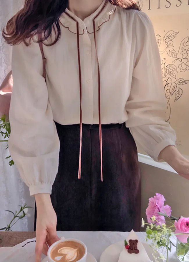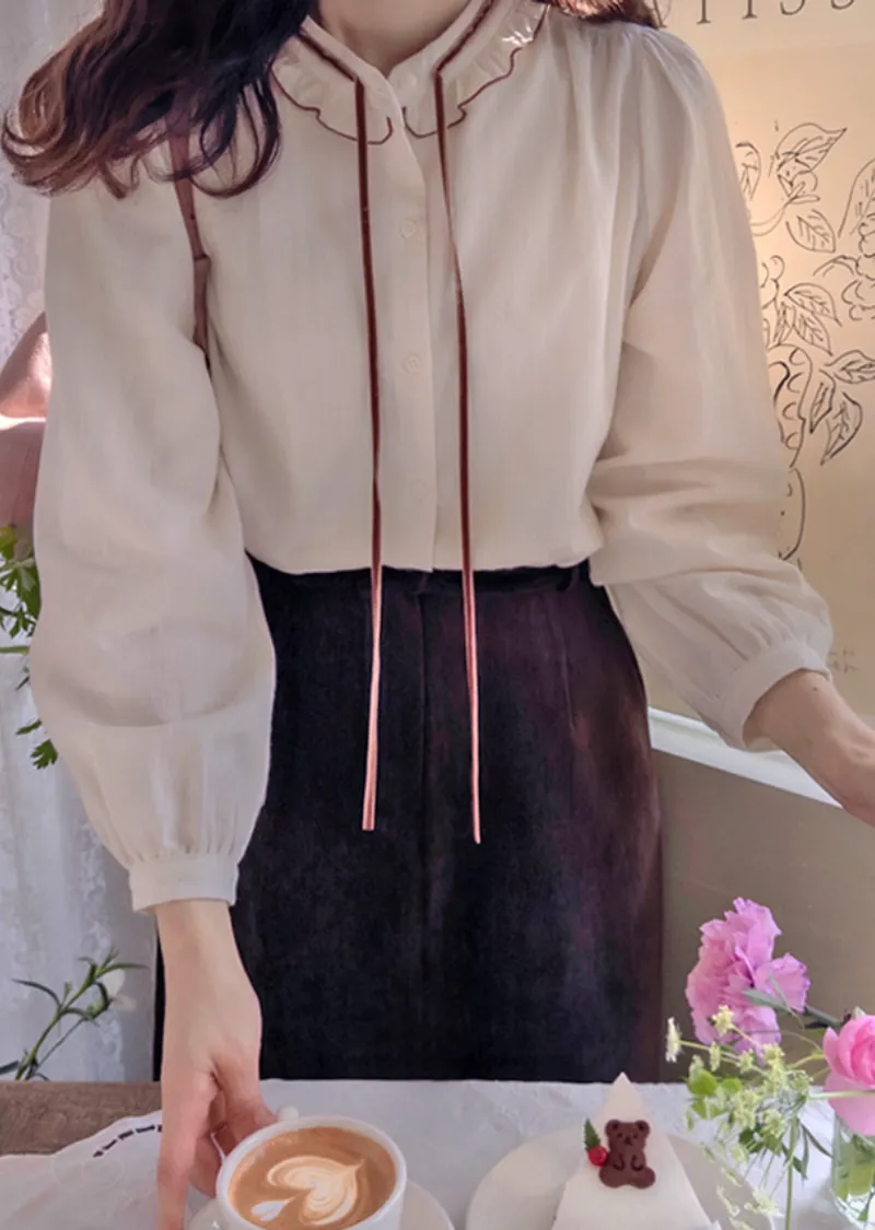 優雅氣質摺邊領口點綴線條綁帶絨質排扣上衣
