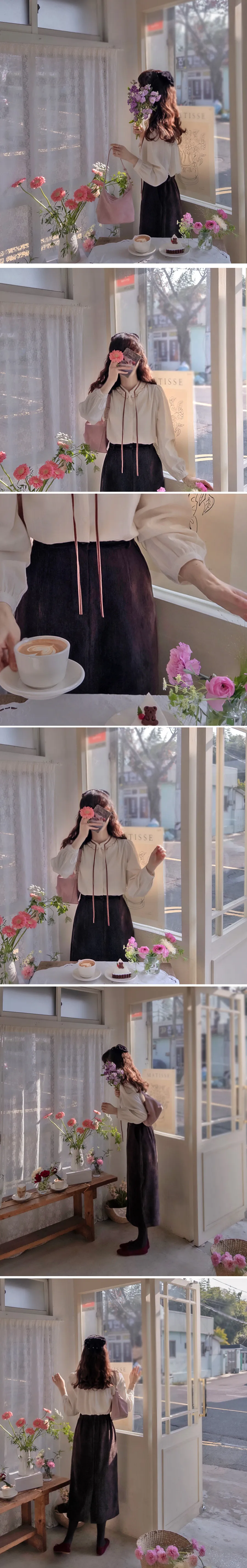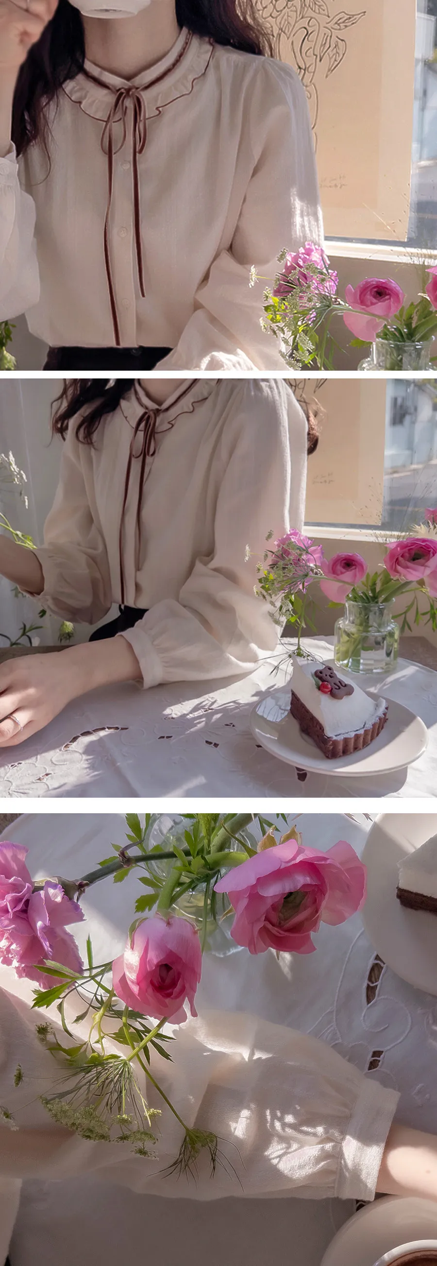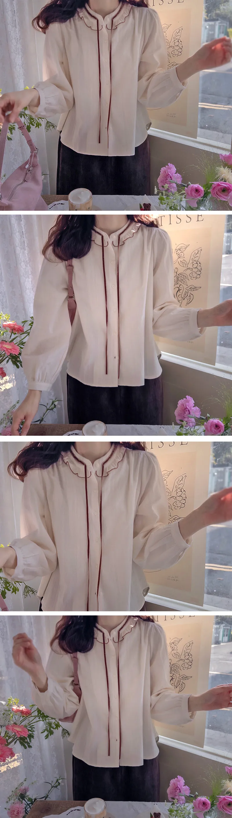 優雅氣質摺邊領口點綴線條綁帶絨質排扣上衣