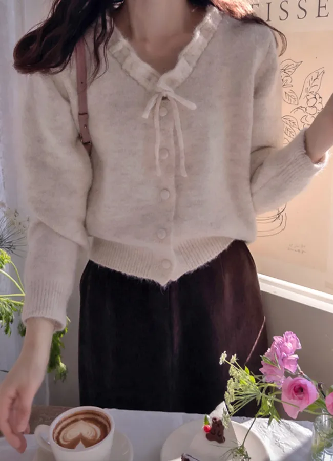 柔和色調柔美波浪領口綁帶圓扣開衫