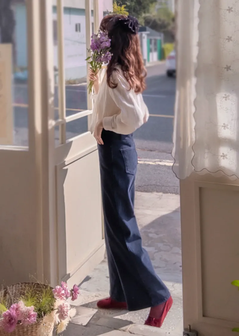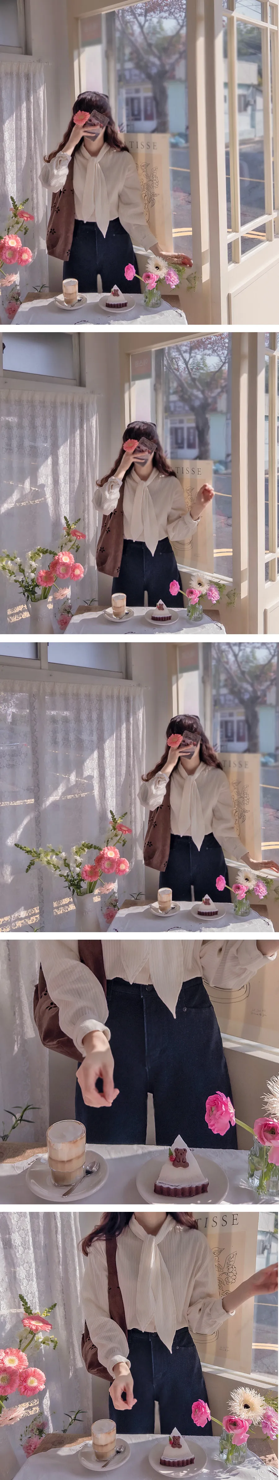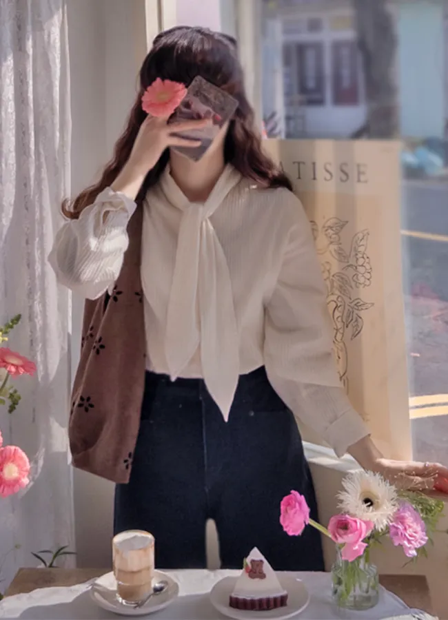 優雅領口綁帶純色線條絨質排扣上衣