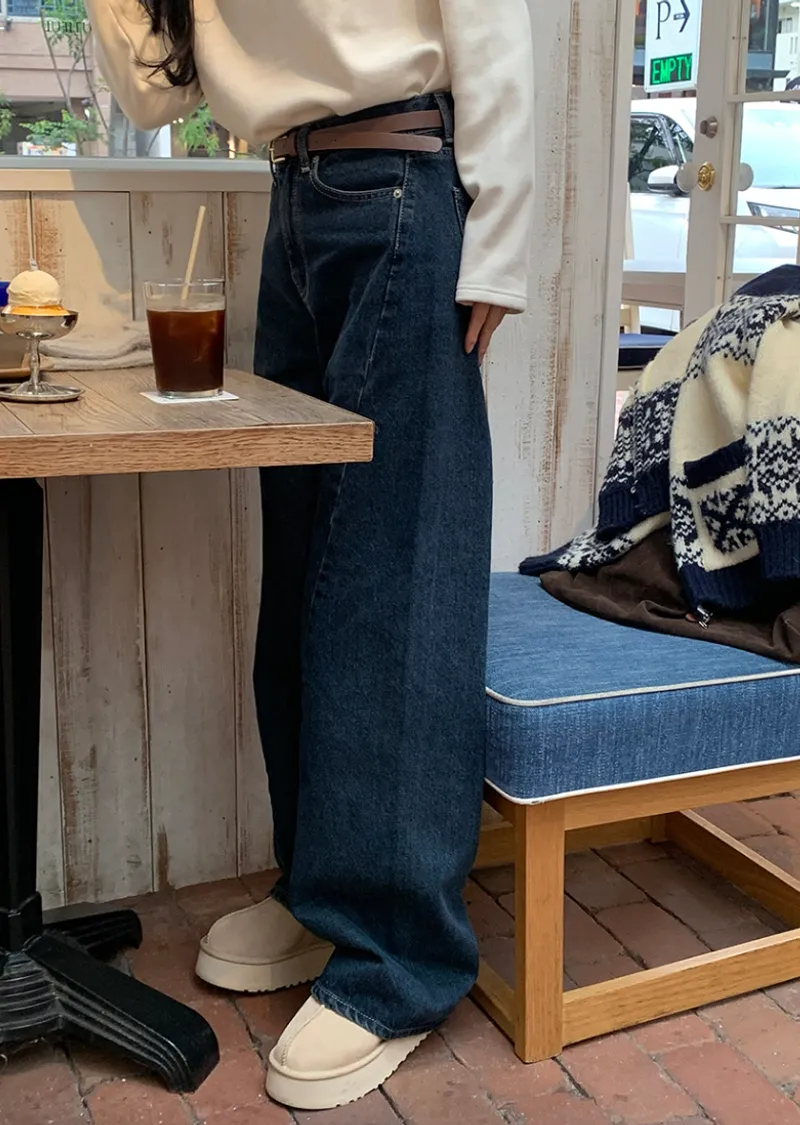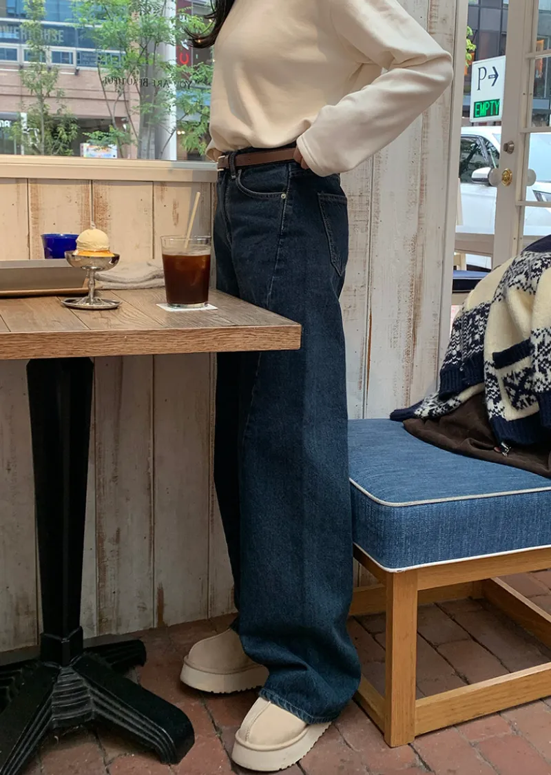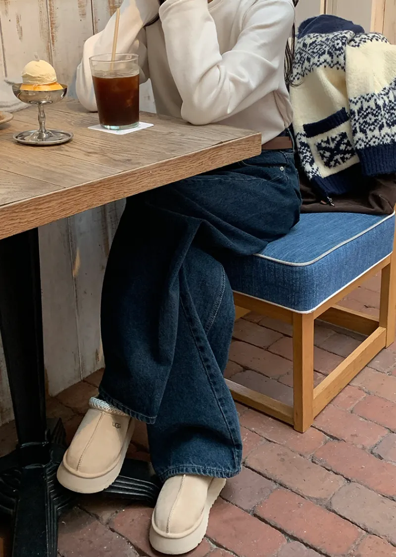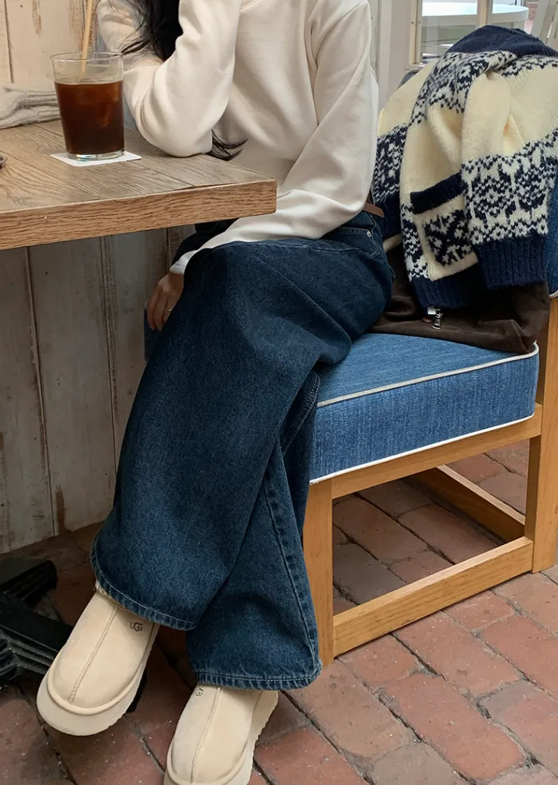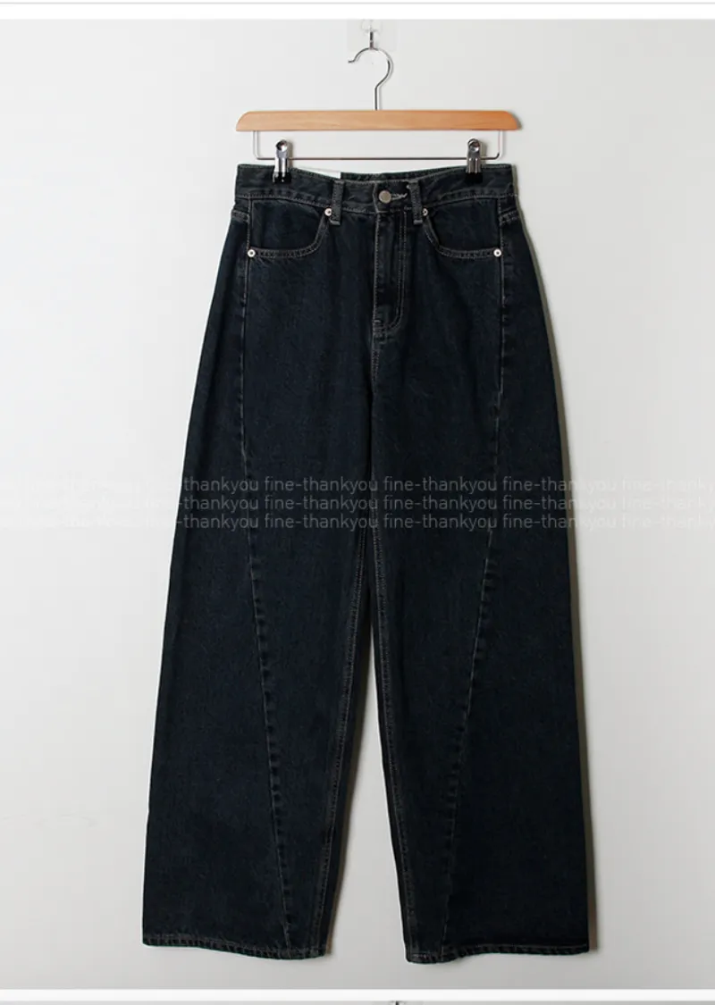 獨特別緻風格前側剪裁線條垂墜寬版牛仔褲