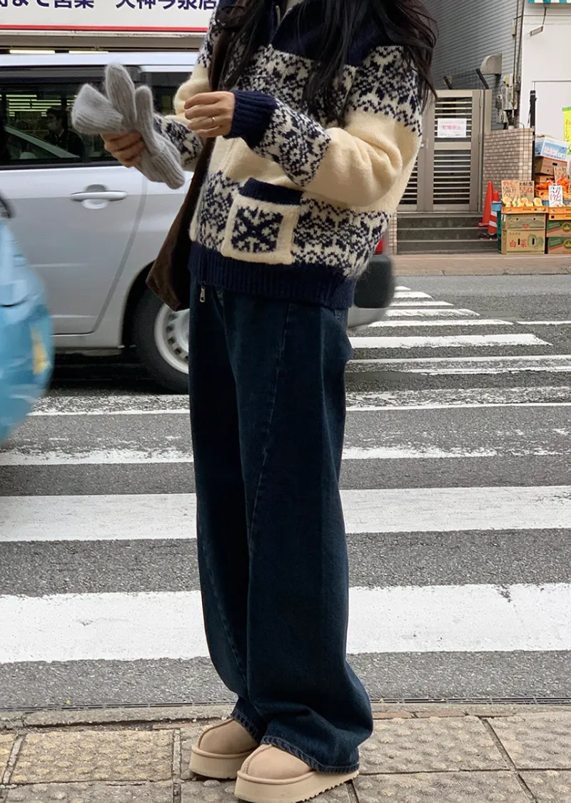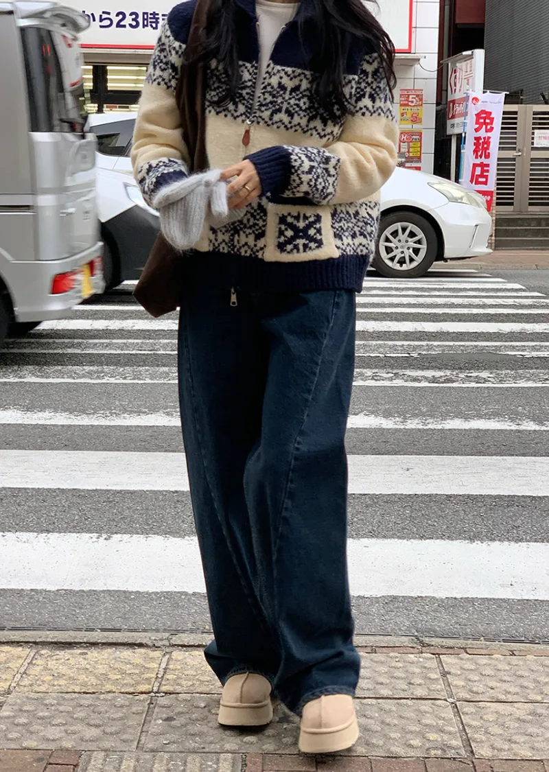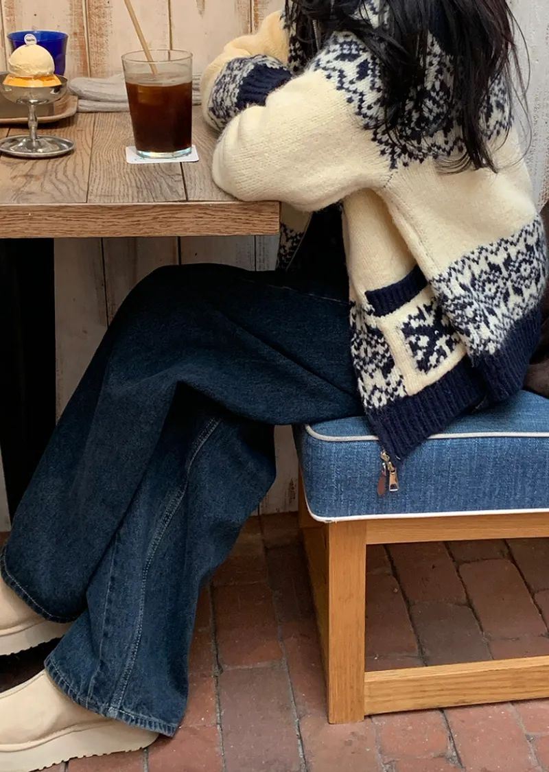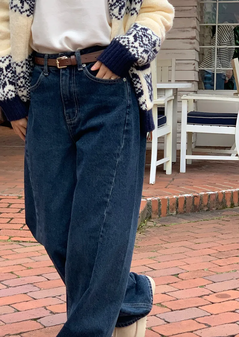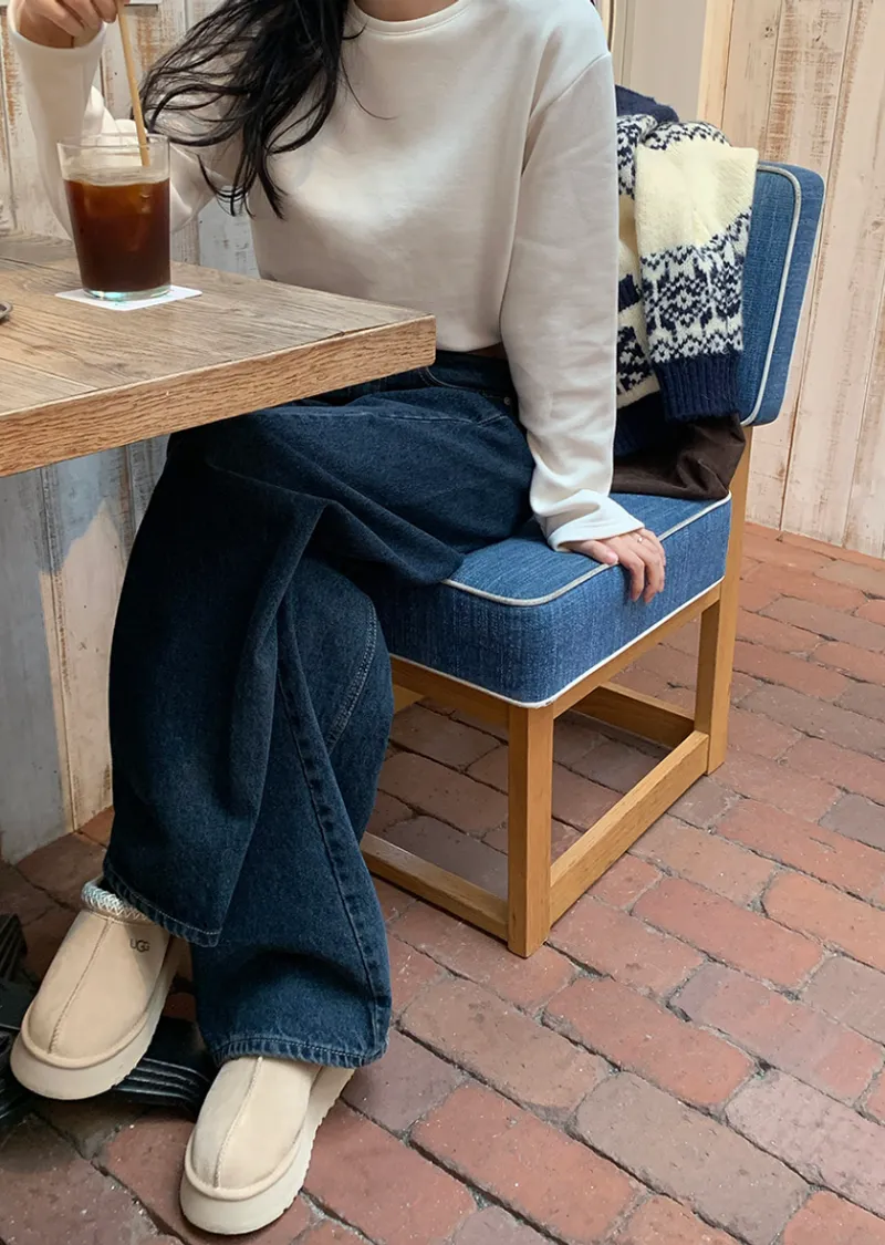 獨特別緻風格前側剪裁線條垂墜寬版牛仔褲