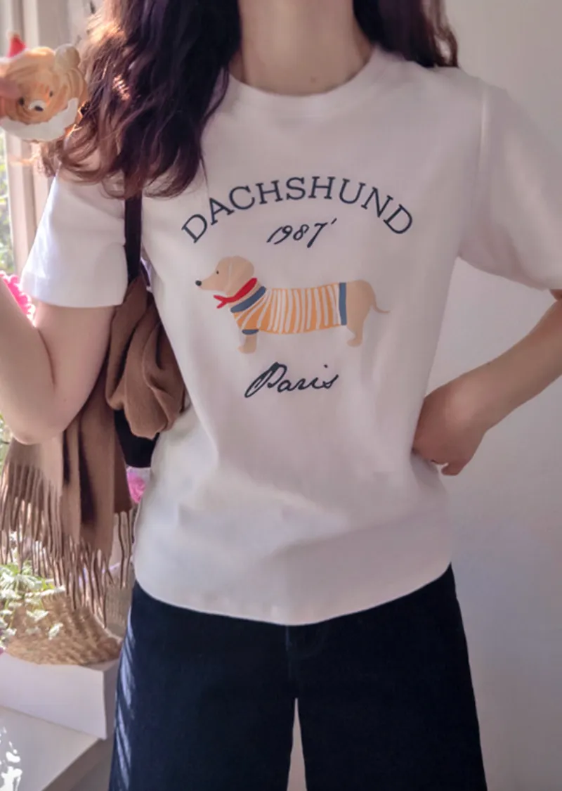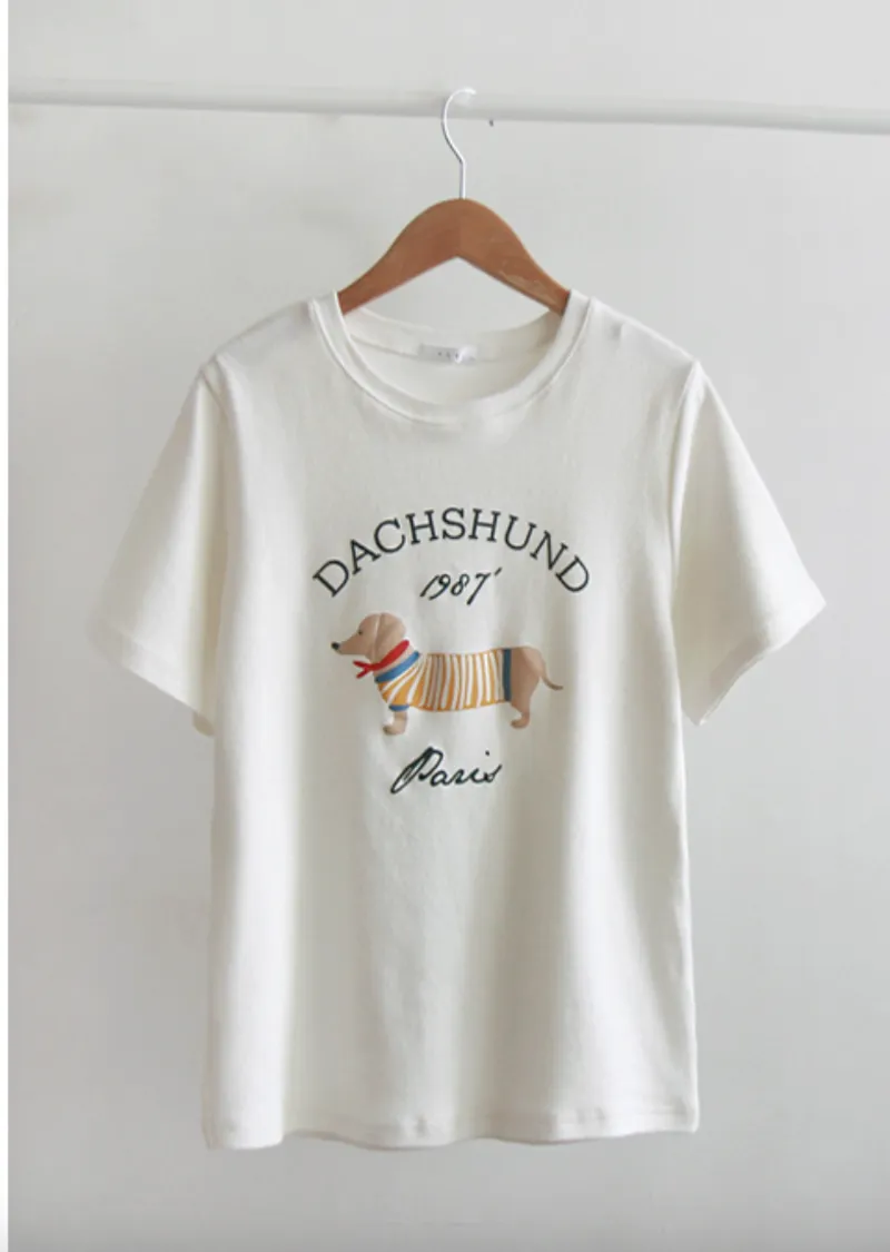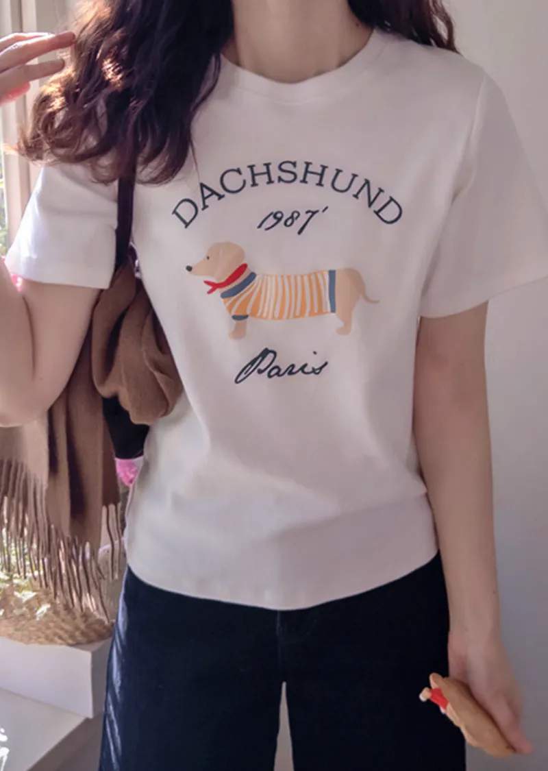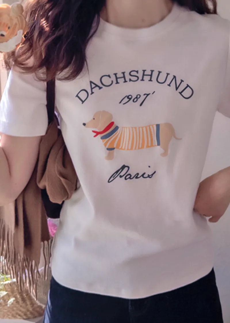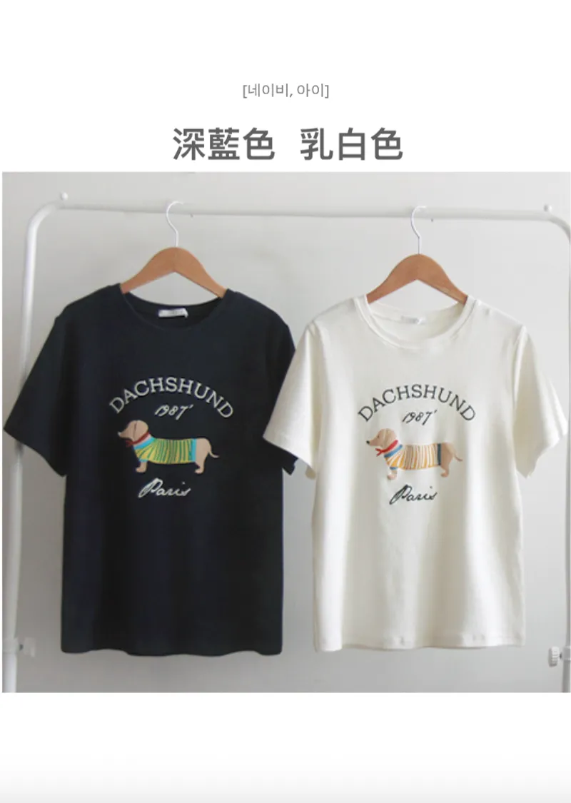 【秋冬短袖T卹】【柔軟舒適的桃絨布料】【字母印花與可愛的狗狗圖案,吸睛十足】【彈性好,布料厚實,是秋冬短袖T恤的理想之選】【推薦這款時尚短袖T卹,色彩應季,極具季節感】