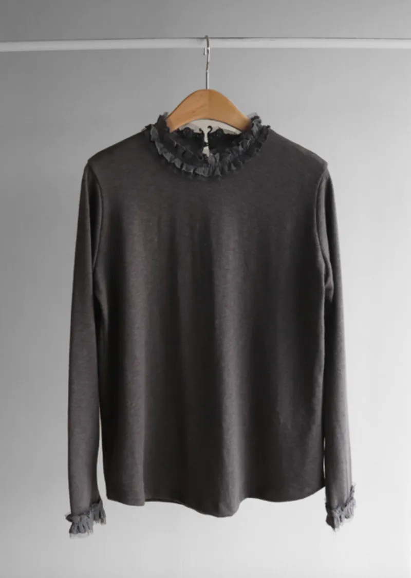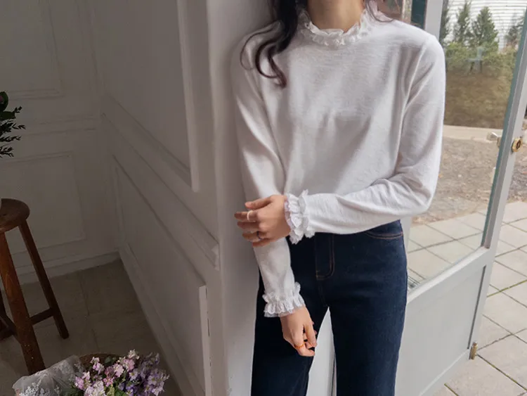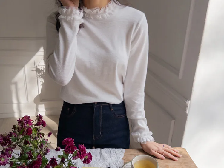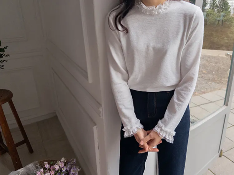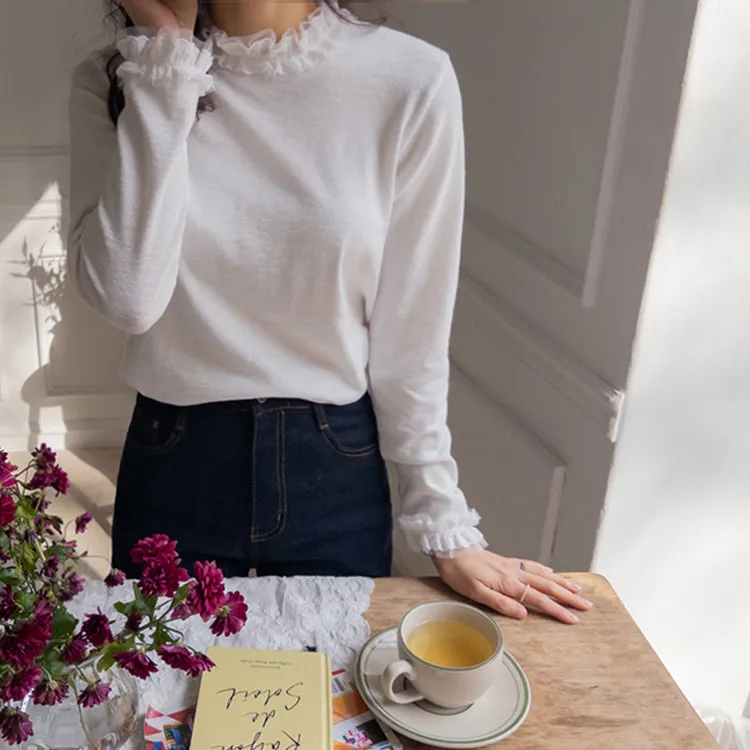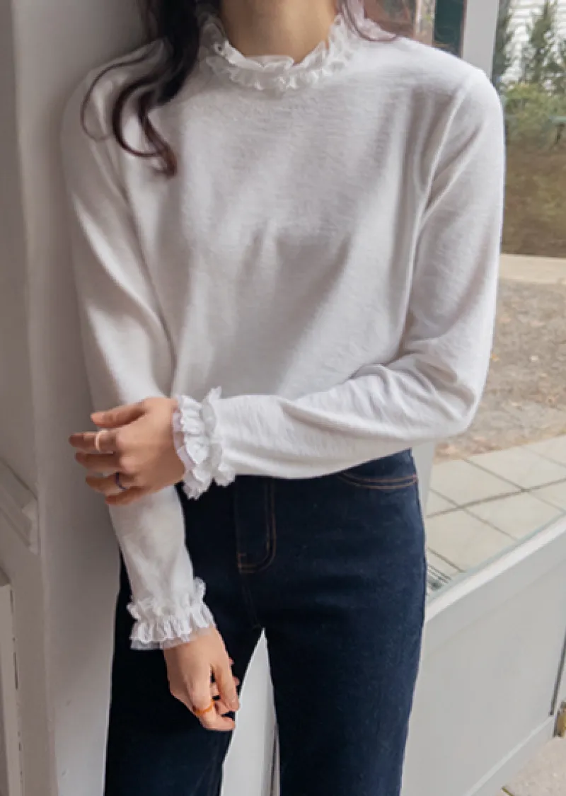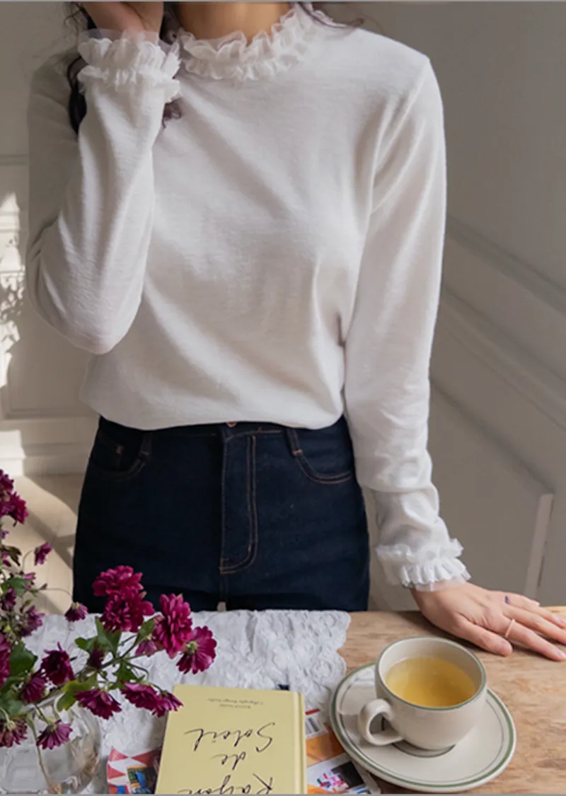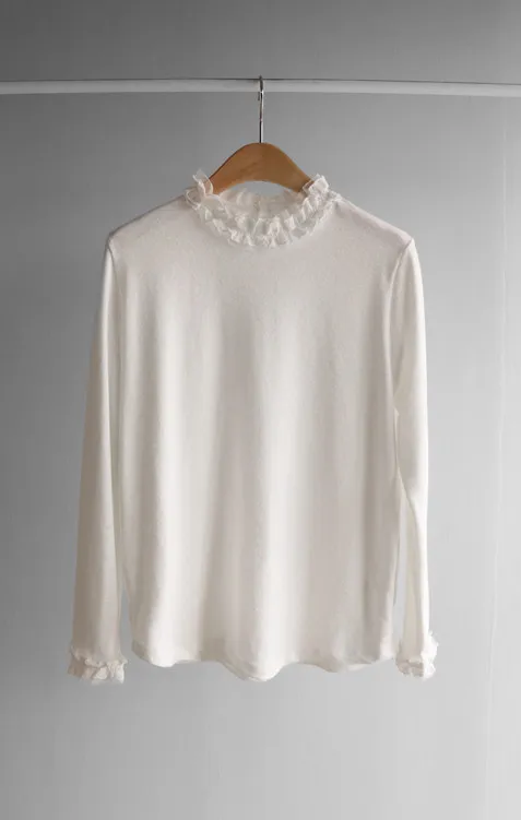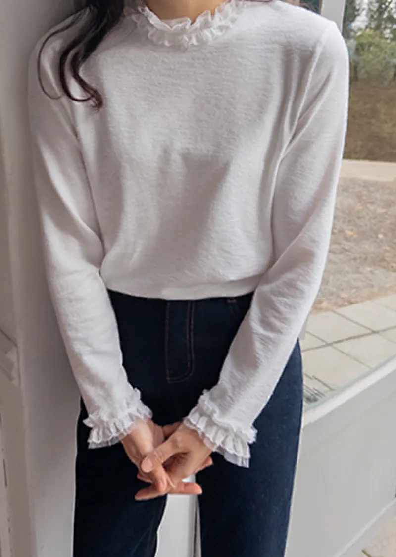 柔美領口袖末荷葉褶邊冬季疊穿舒適上衣
