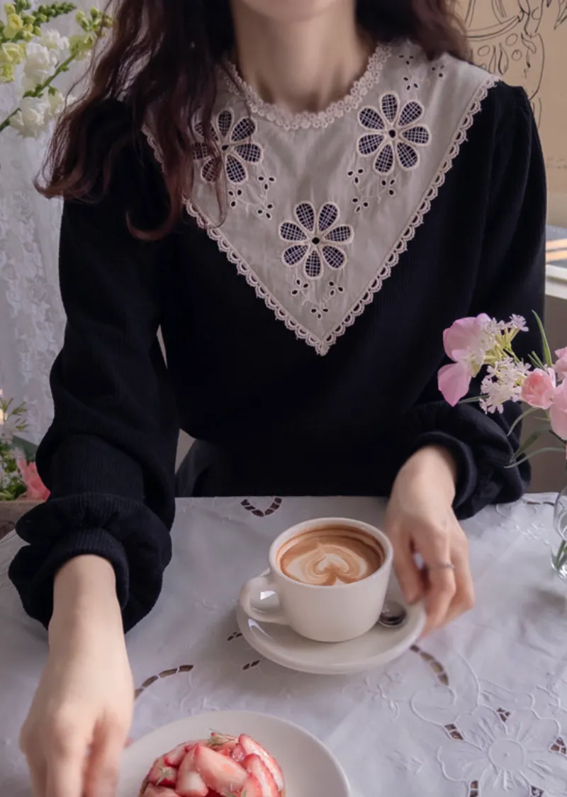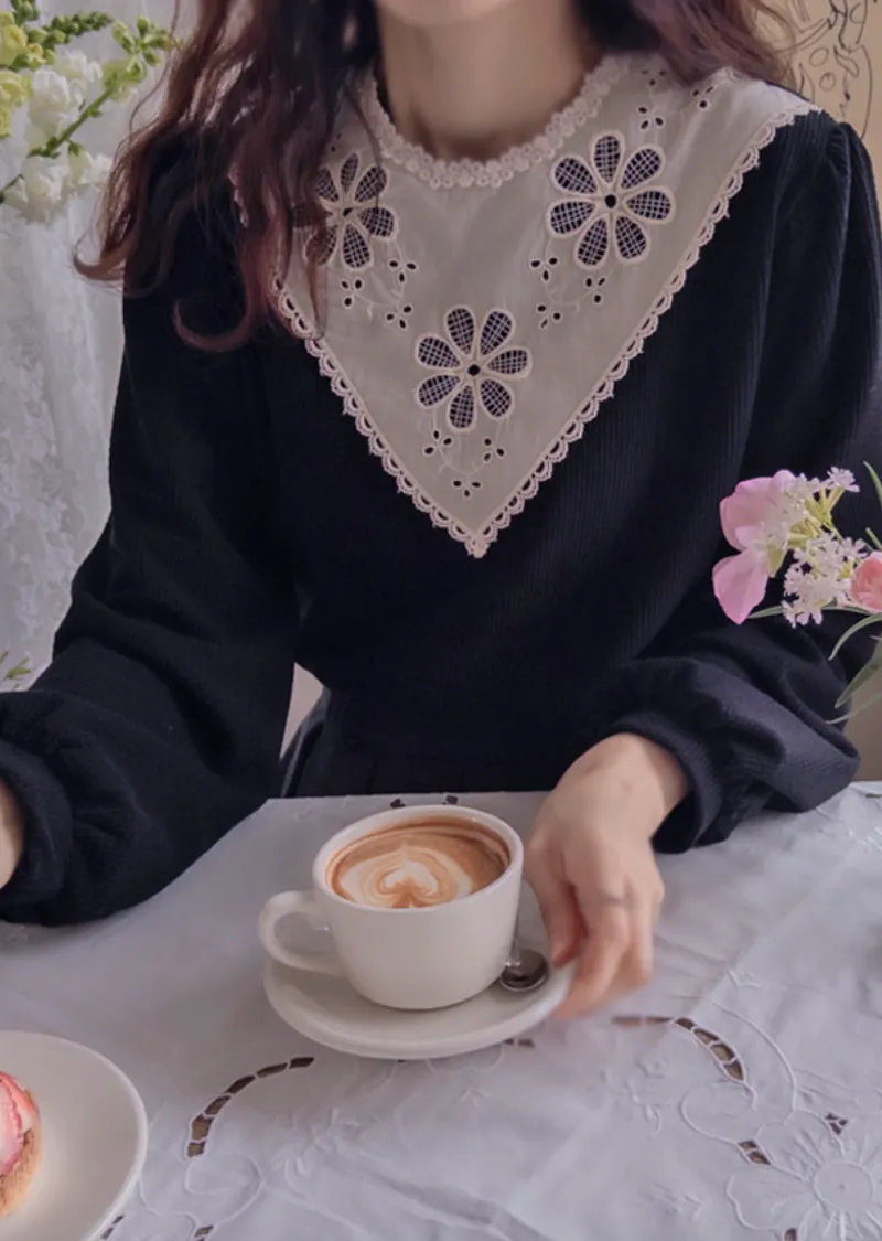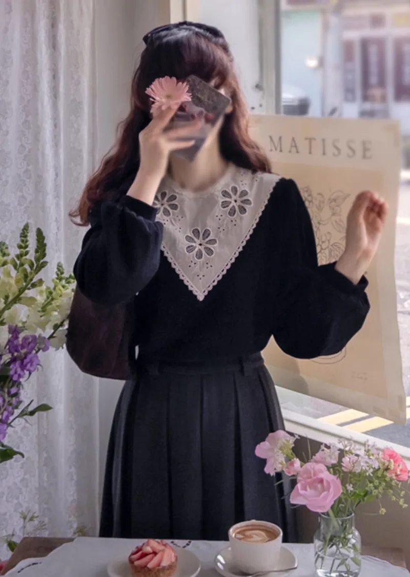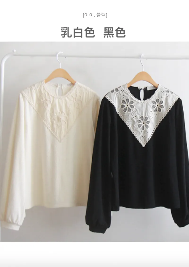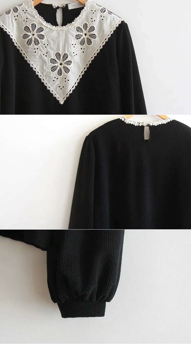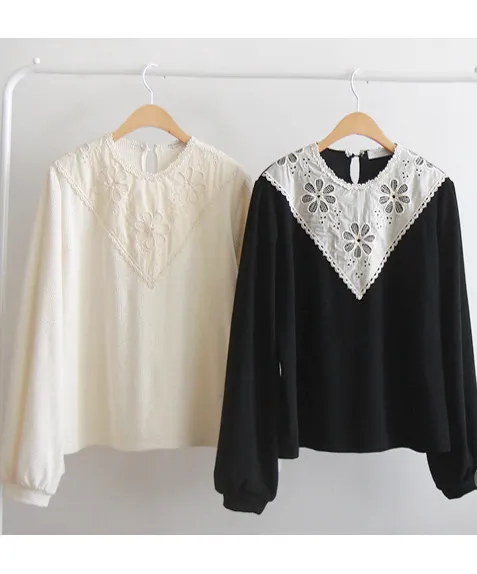 優雅領口花朵刺繡柔軟燈芯絨上衣