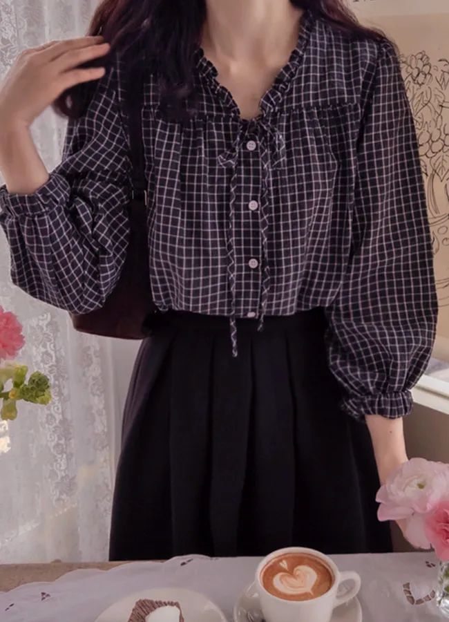 優雅領口褶皺綁帶設計格紋排扣上衣