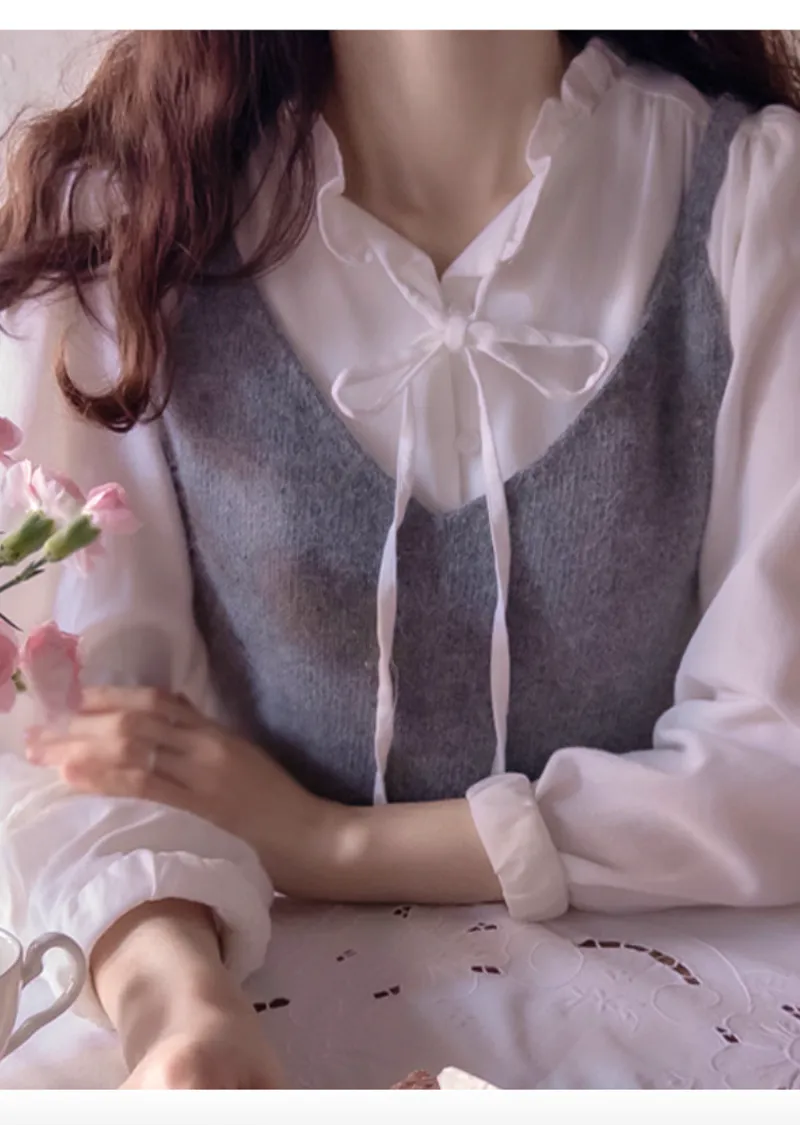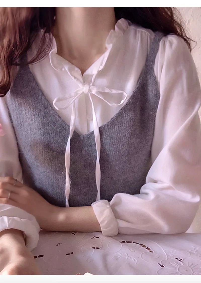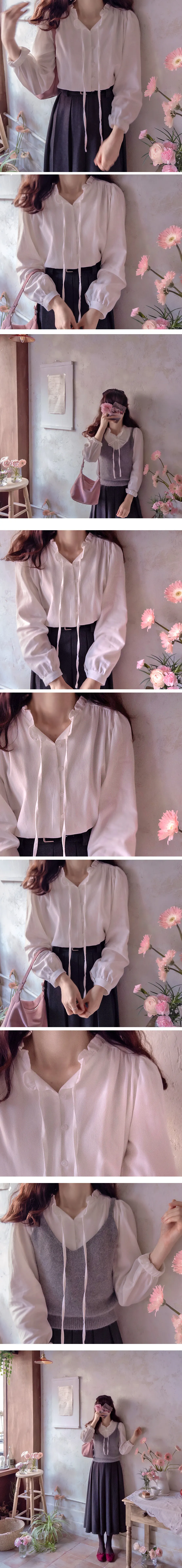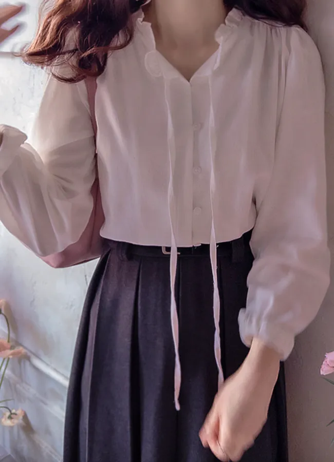 可愛摺邊領口綁帶絨質排扣上衣