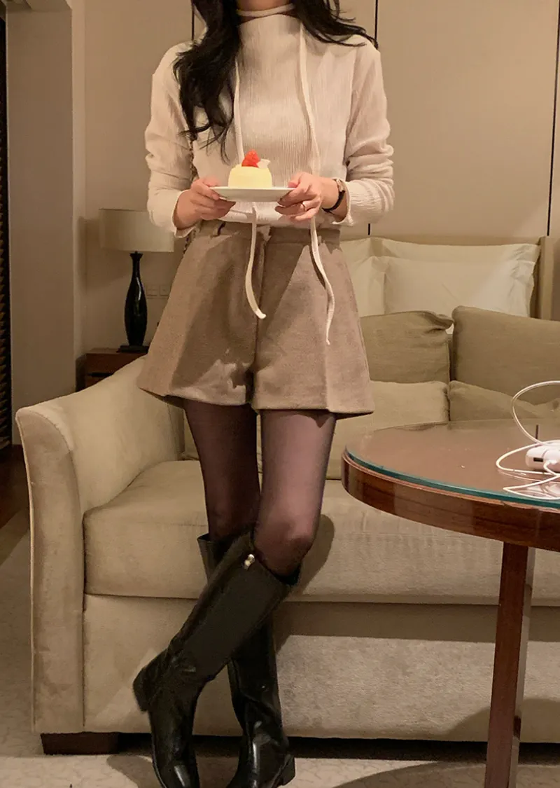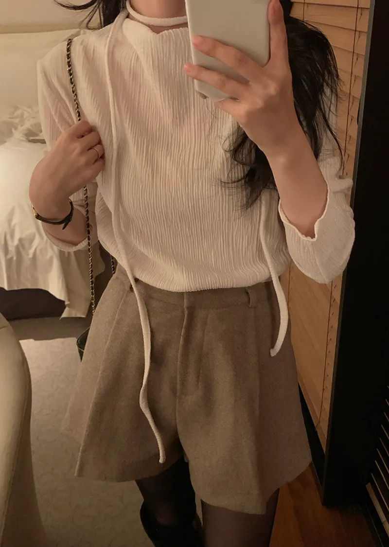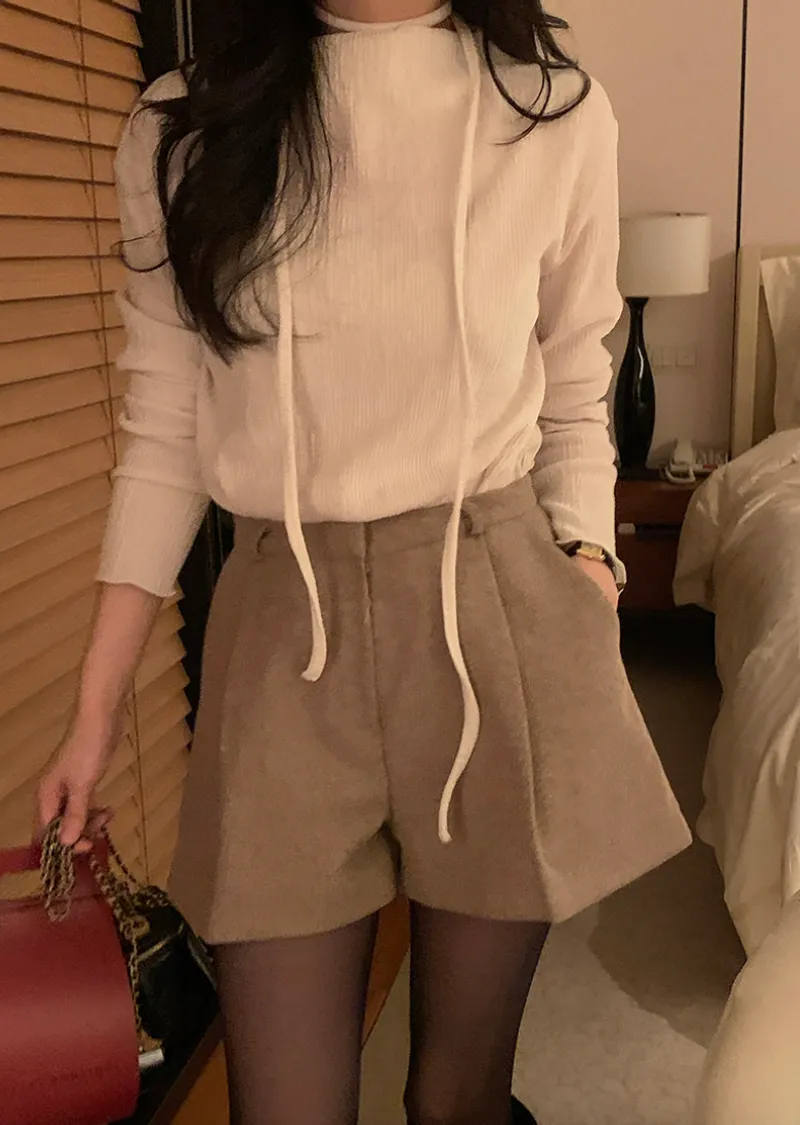 時尚俐落線條修身前褶襉羊毛混紡短褲