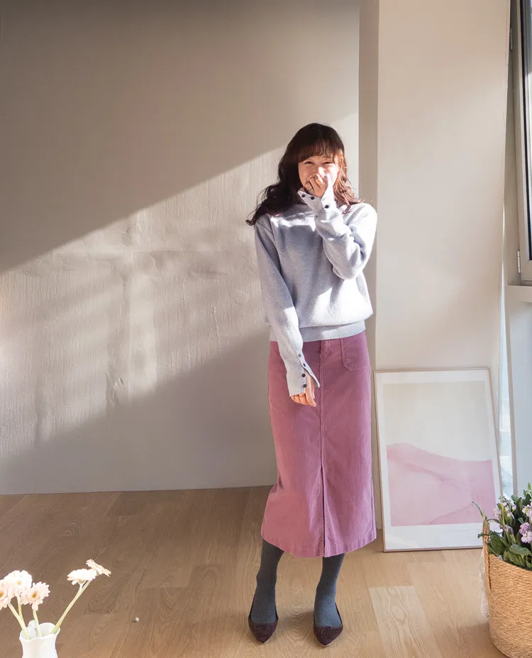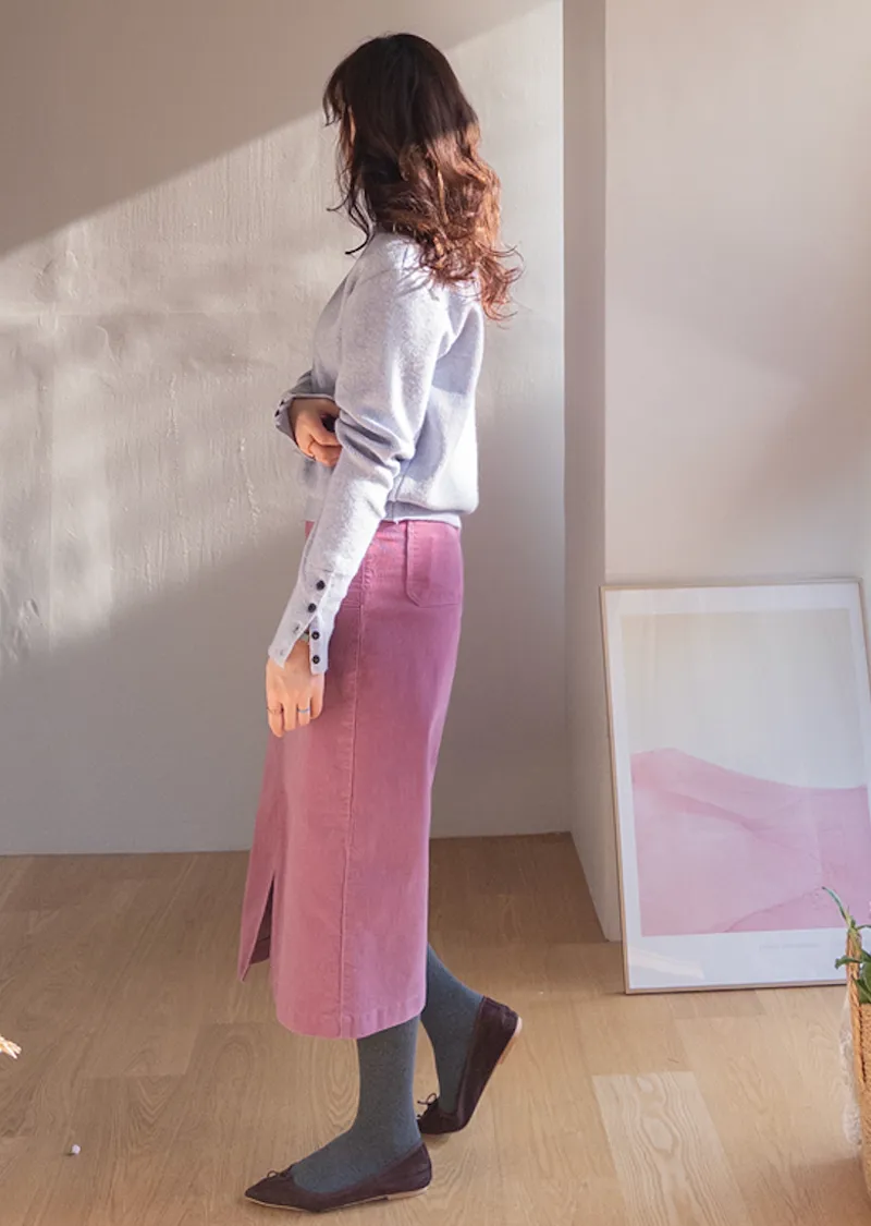 沉穩簡約H剪裁前開衩腰部隱藏鬆緊燈芯絨中長裙 現貨粉M