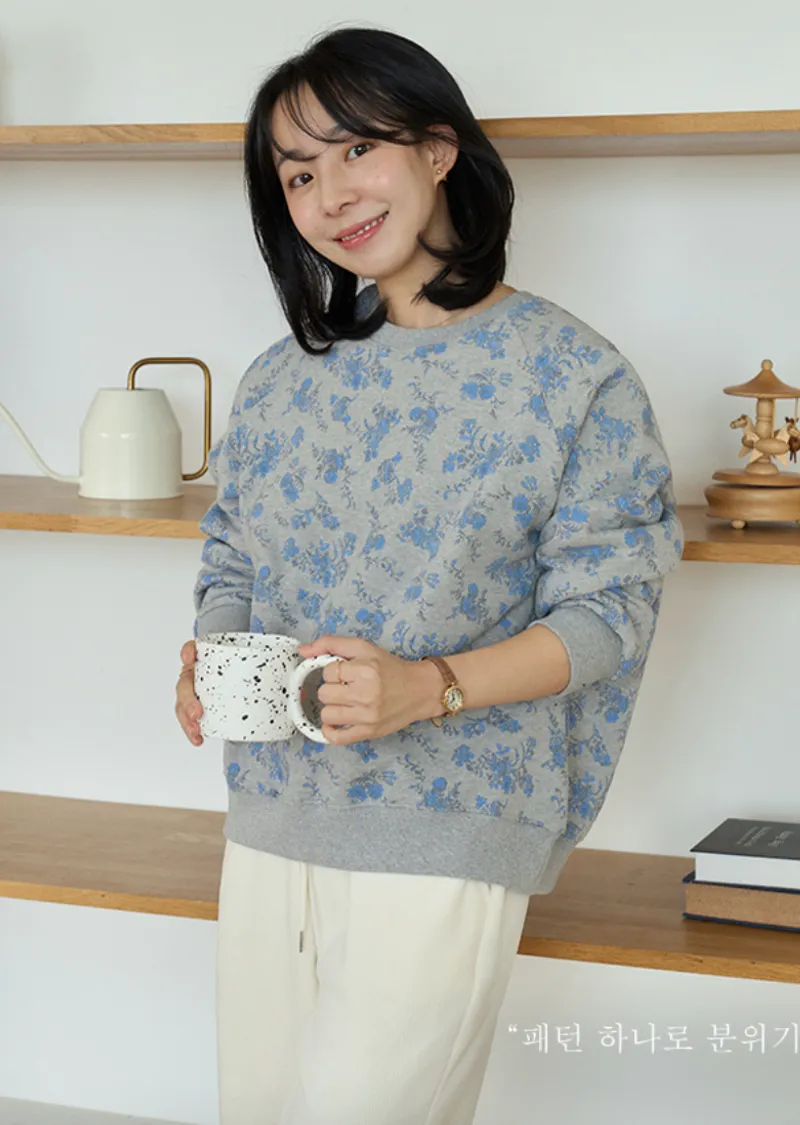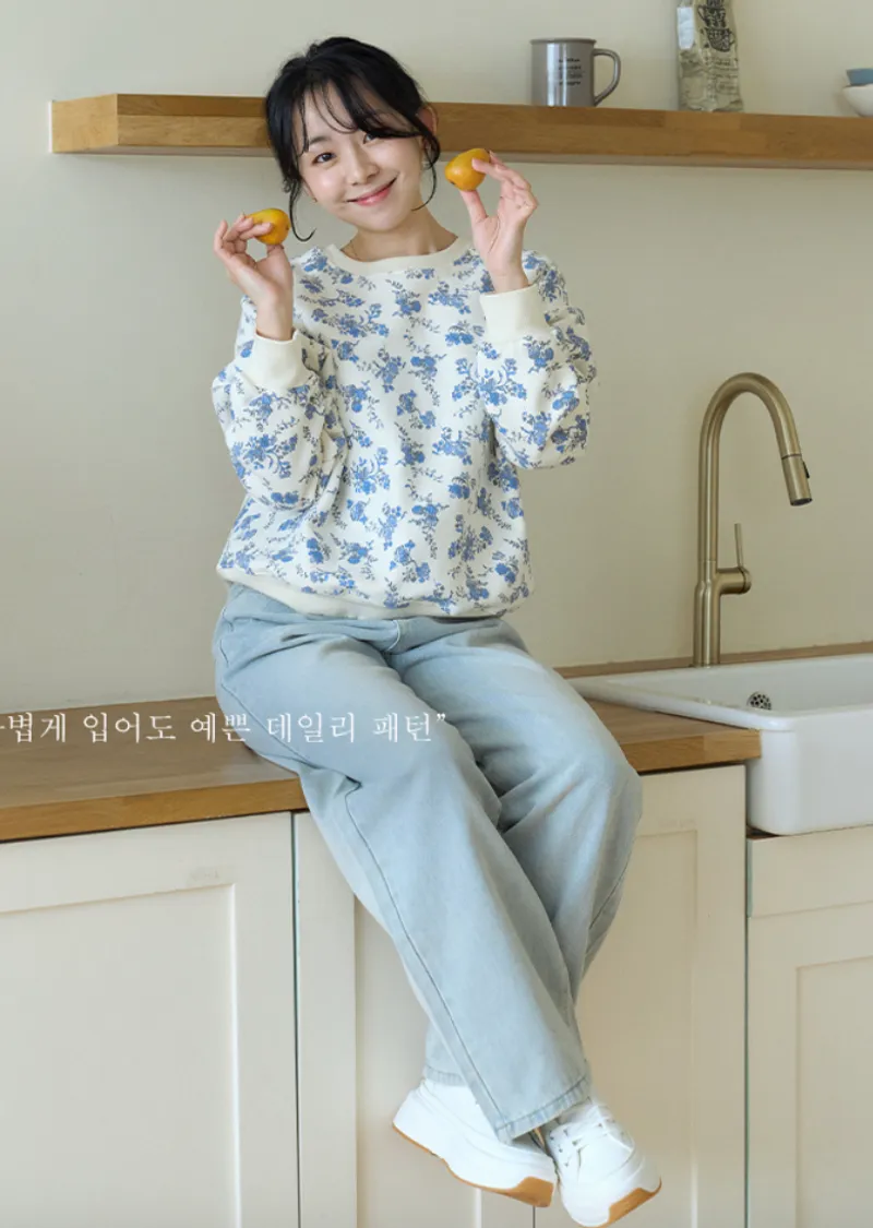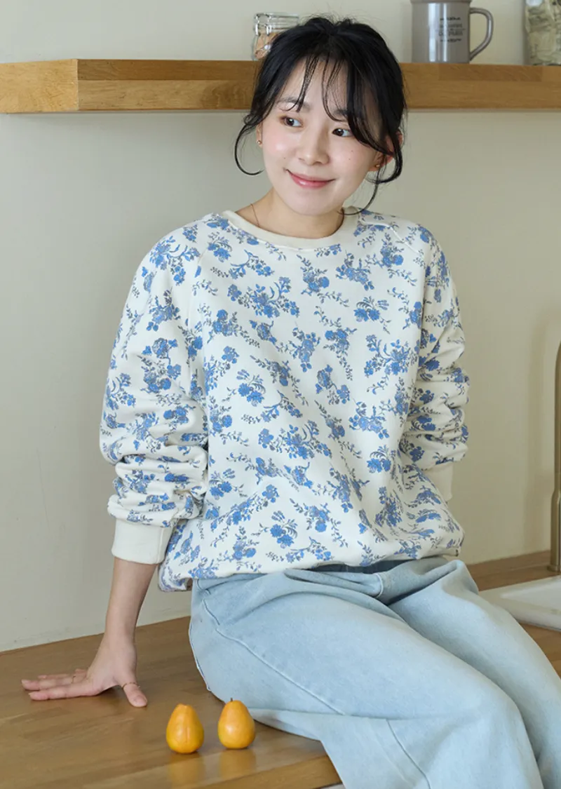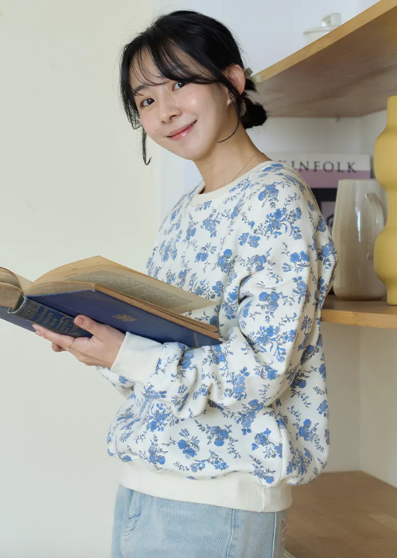 一款迷人的花朵圖案上衣,上面有輕輕散落的復古藍色花朵。採用柔軟、豐滿的面料製成,觸感舒適,厚度也適合日常穿著,非常百搭。花朵圖案沒有典型的印花感覺,