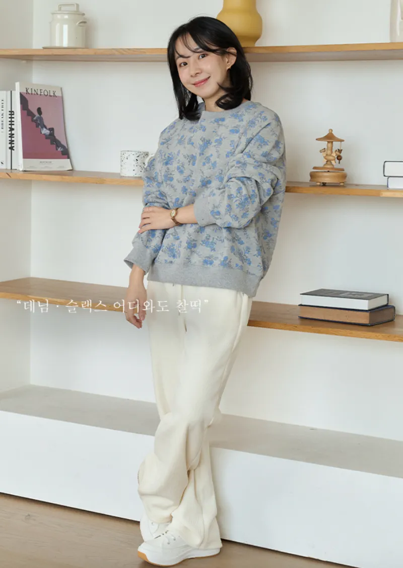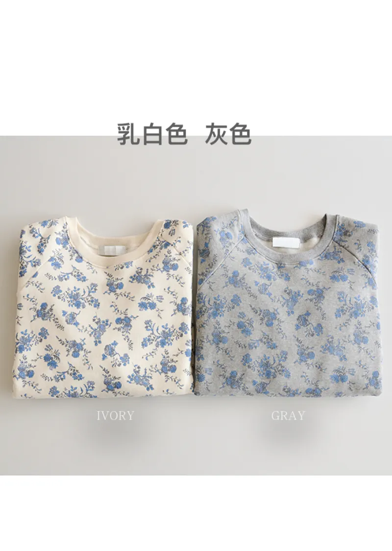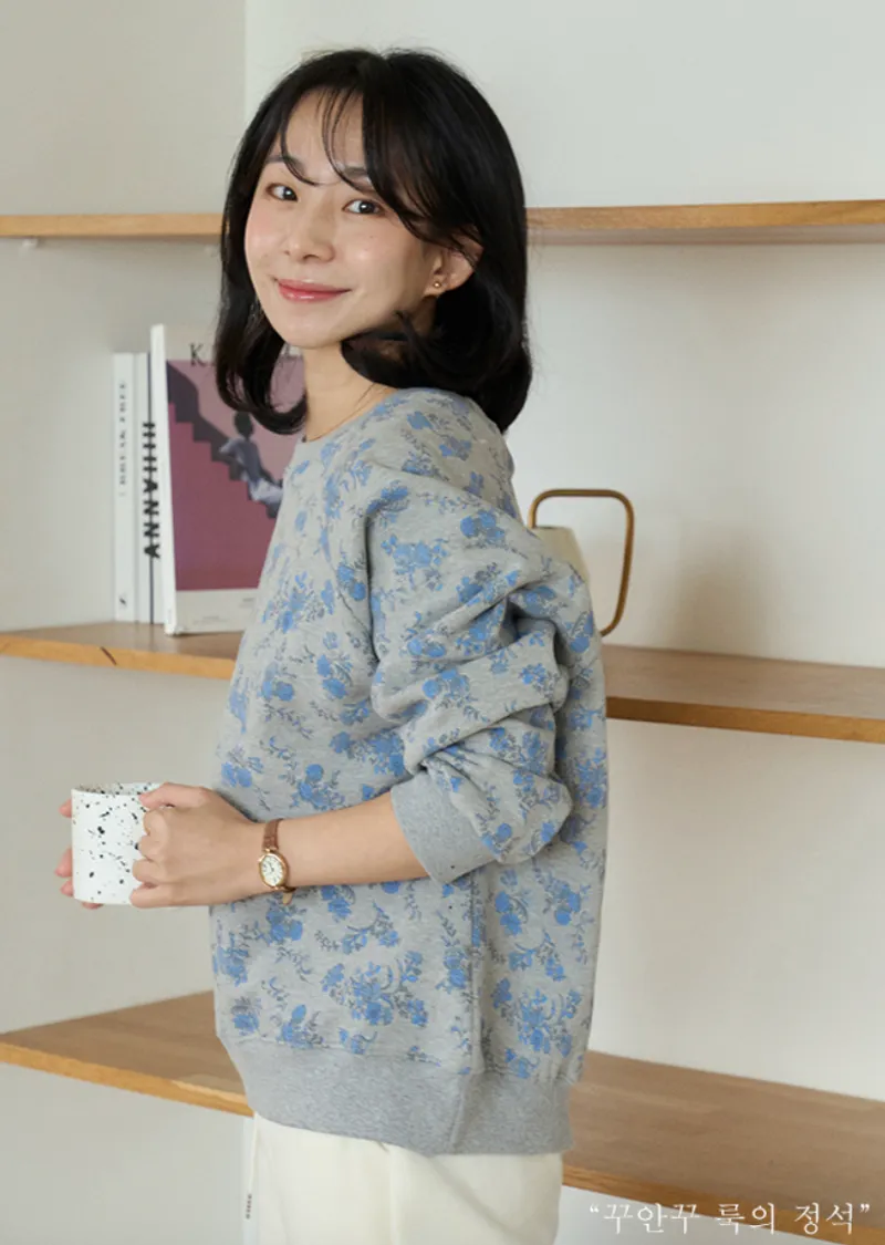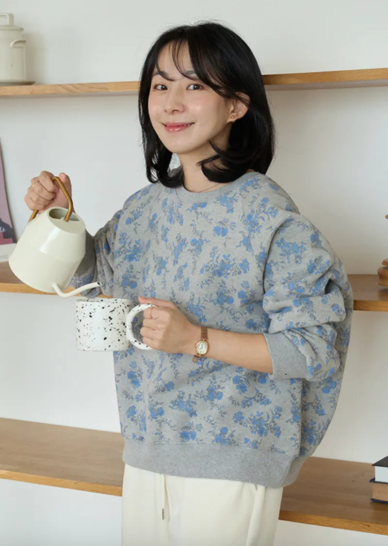 一款迷人的花朵圖案上衣,上面有輕輕散落的復古藍色花朵。採用柔軟、豐滿的面料製成,觸感舒適,厚度也適合日常穿著,非常百搭。花朵圖案沒有典型的印花感覺,