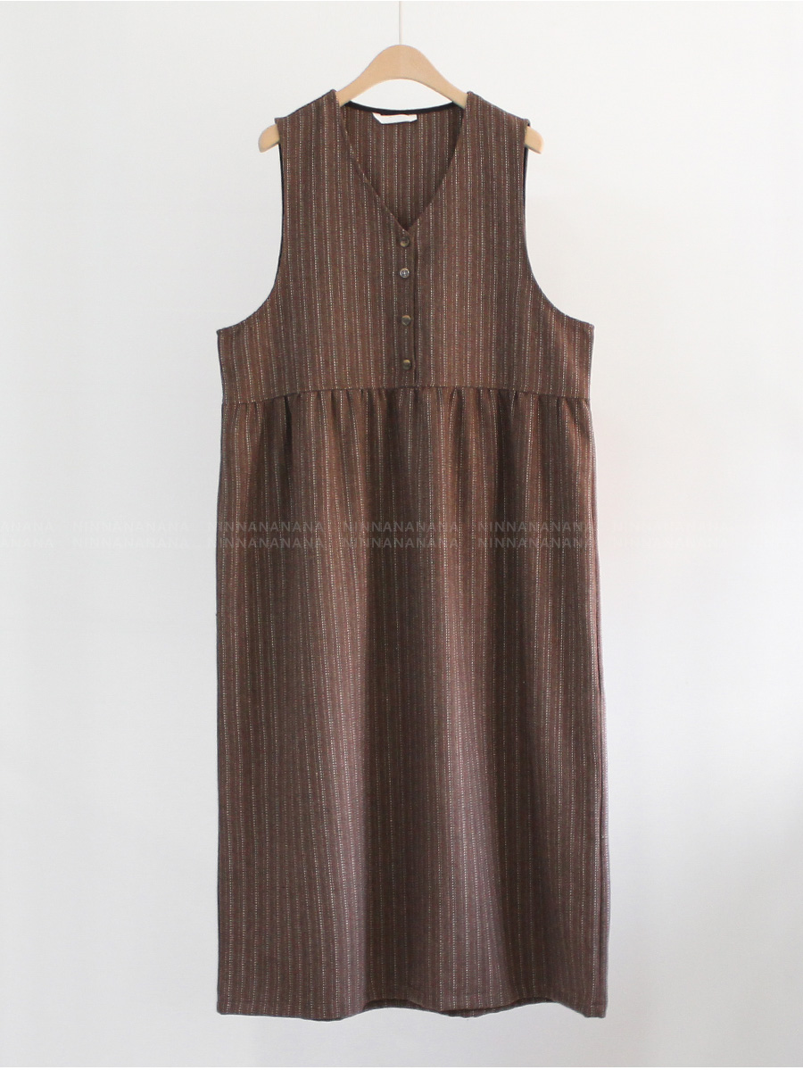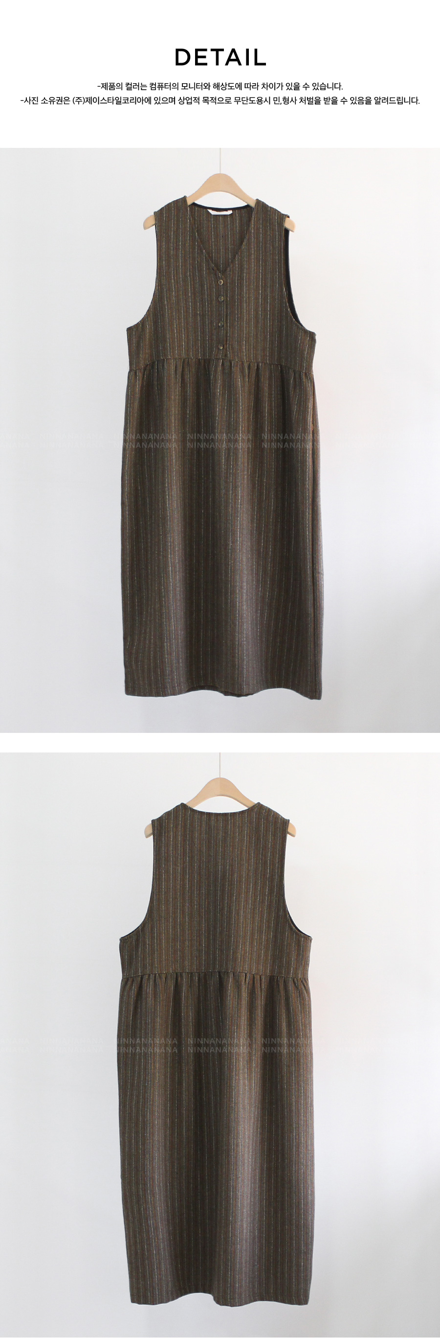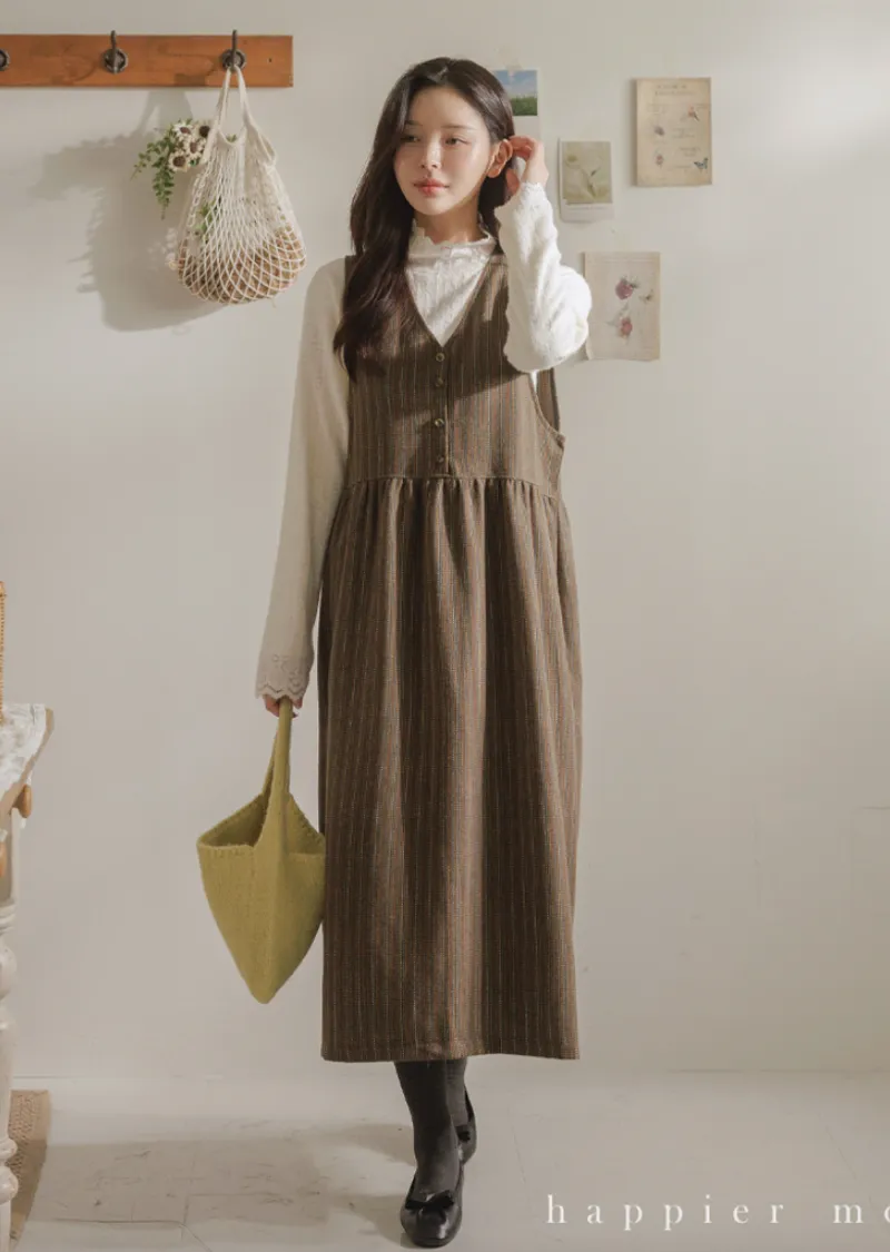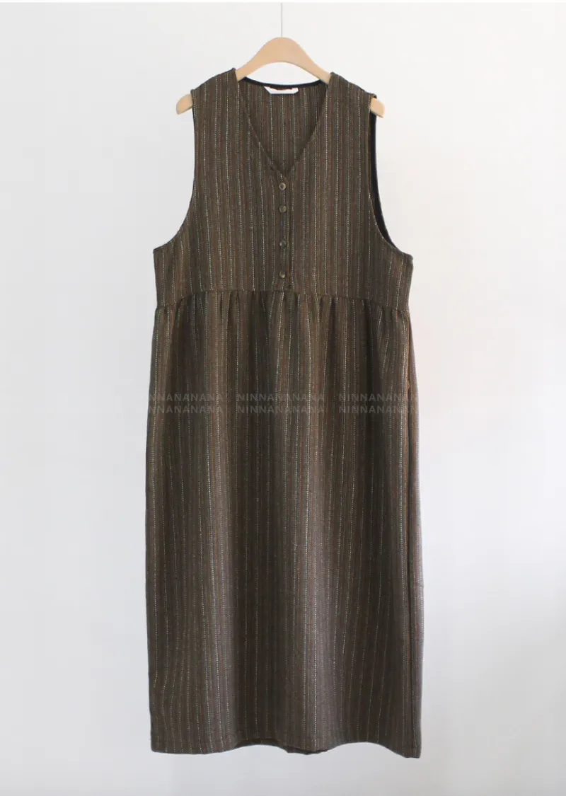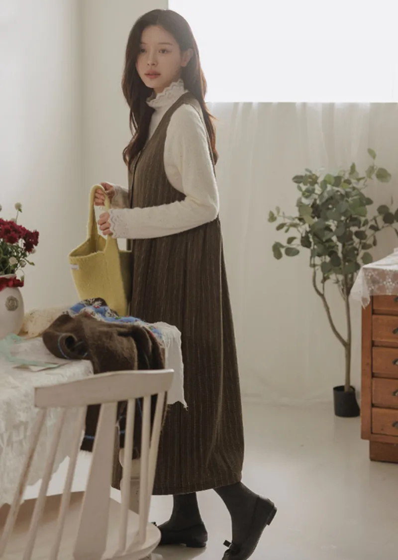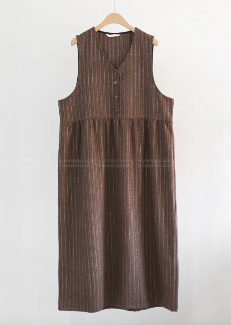 帶有柔和的條紋圖案,微妙的古典氛圍 ,一件飄逸的V領疊層連身裙。柔和色調背景上的豎條紋 ,讓你看起來更苗條的效果。溫暖而復古的氛圍,一種厚實的布料,所以很適合冬天穿。 領口採用淺V領設計。領口設計簡潔俐落,搭配內襯時,帶出層次感 !簡潔的前紐扣細節 在輪廓上新增一個特點,營造了一種既簡潔又充滿情感的氛圍。按鈕線條引導視線向上移動,整體比例更長 ^^自然地低於腰線, 輕微的褶皺,長A字裙擺造型完成!覆蓋下半身線條,每走一步都會略微撐開,,營造出一種女性化且舒適的氛圍。長款設計,更襯托您的身材。柔和的色彩和條紋圖案,處處都散發著時尚氣息,很有冬日氣息的洋裝 :)