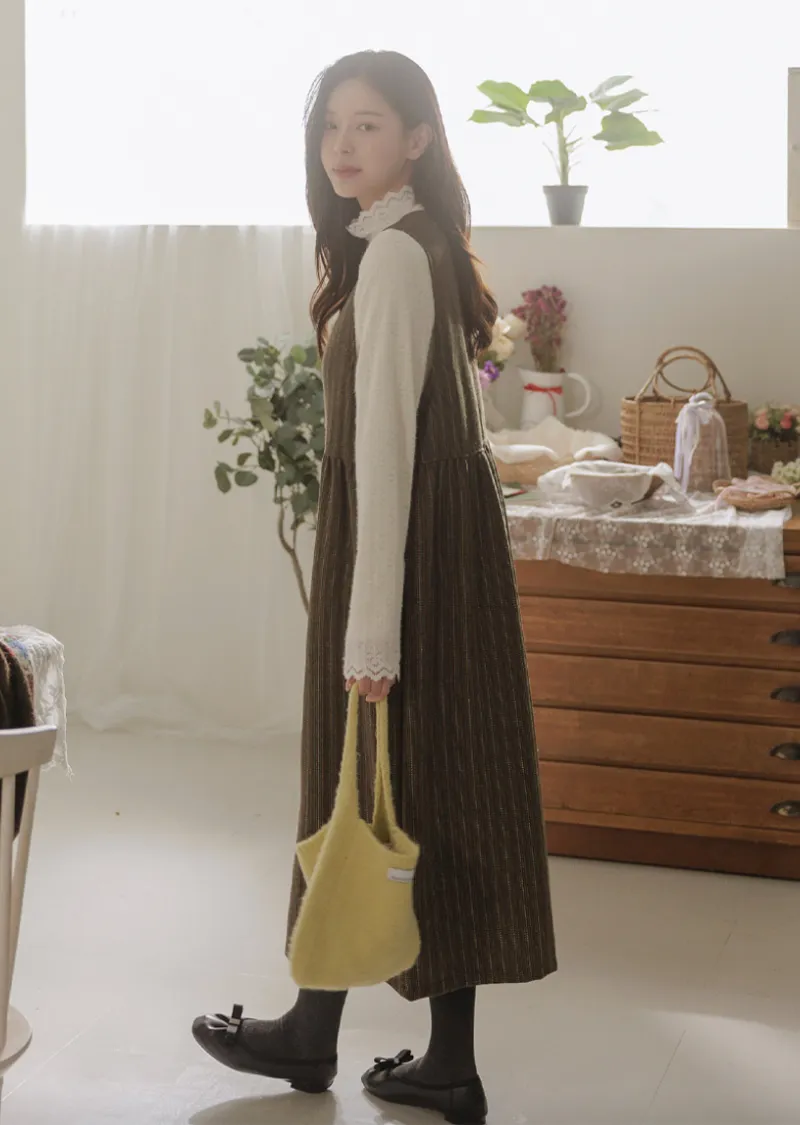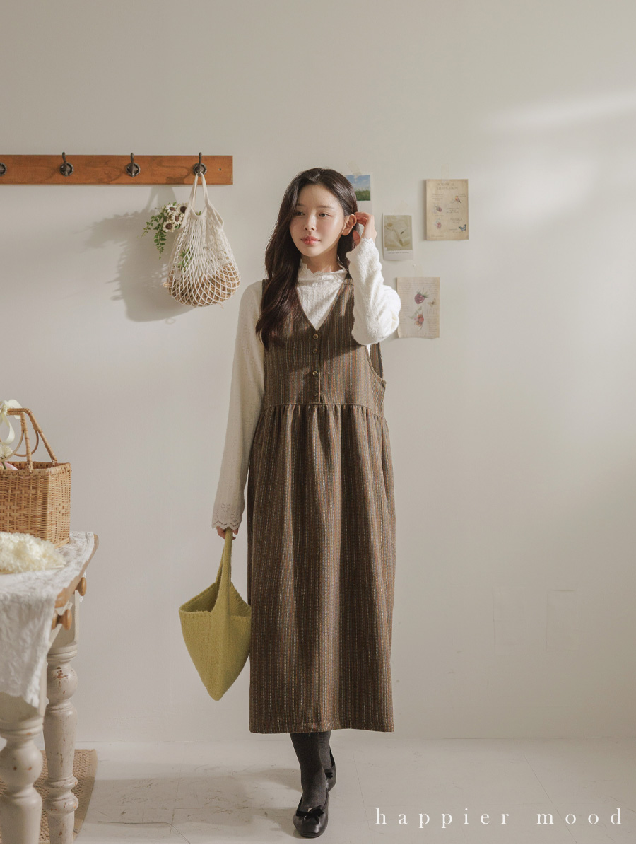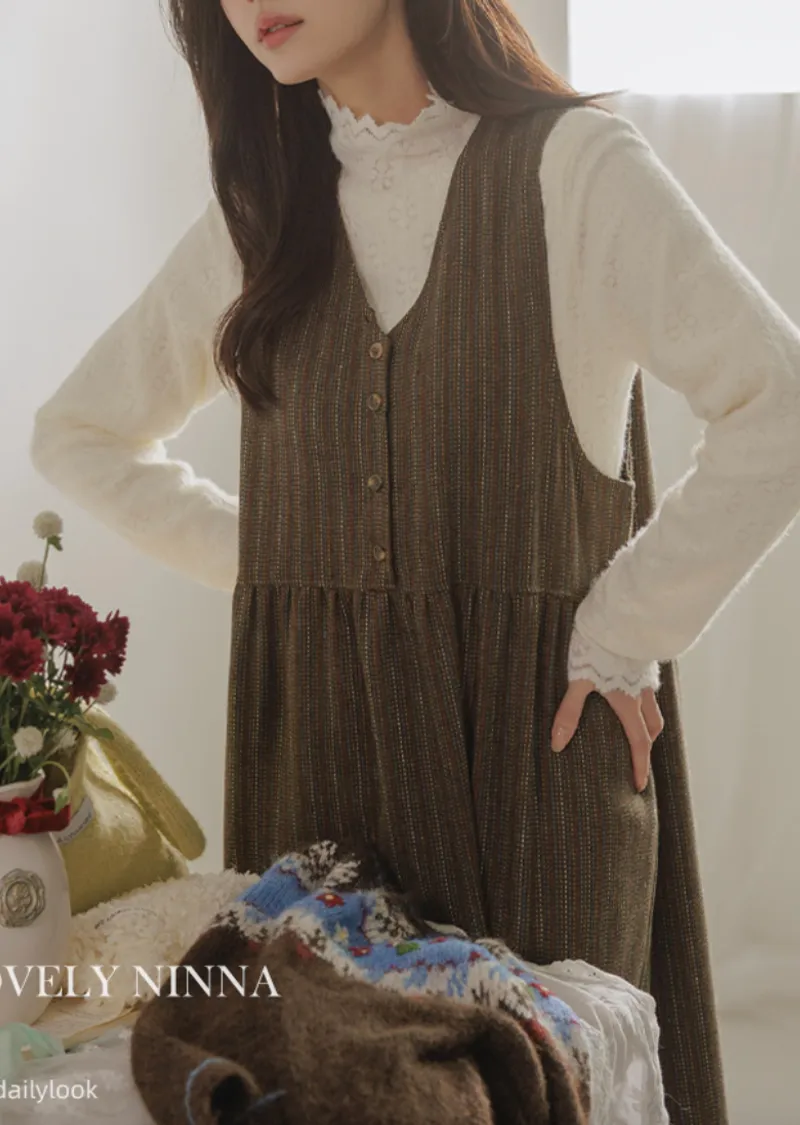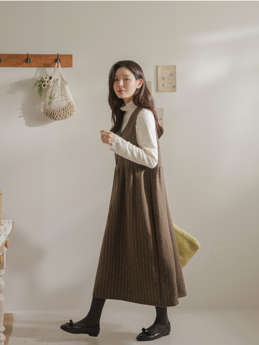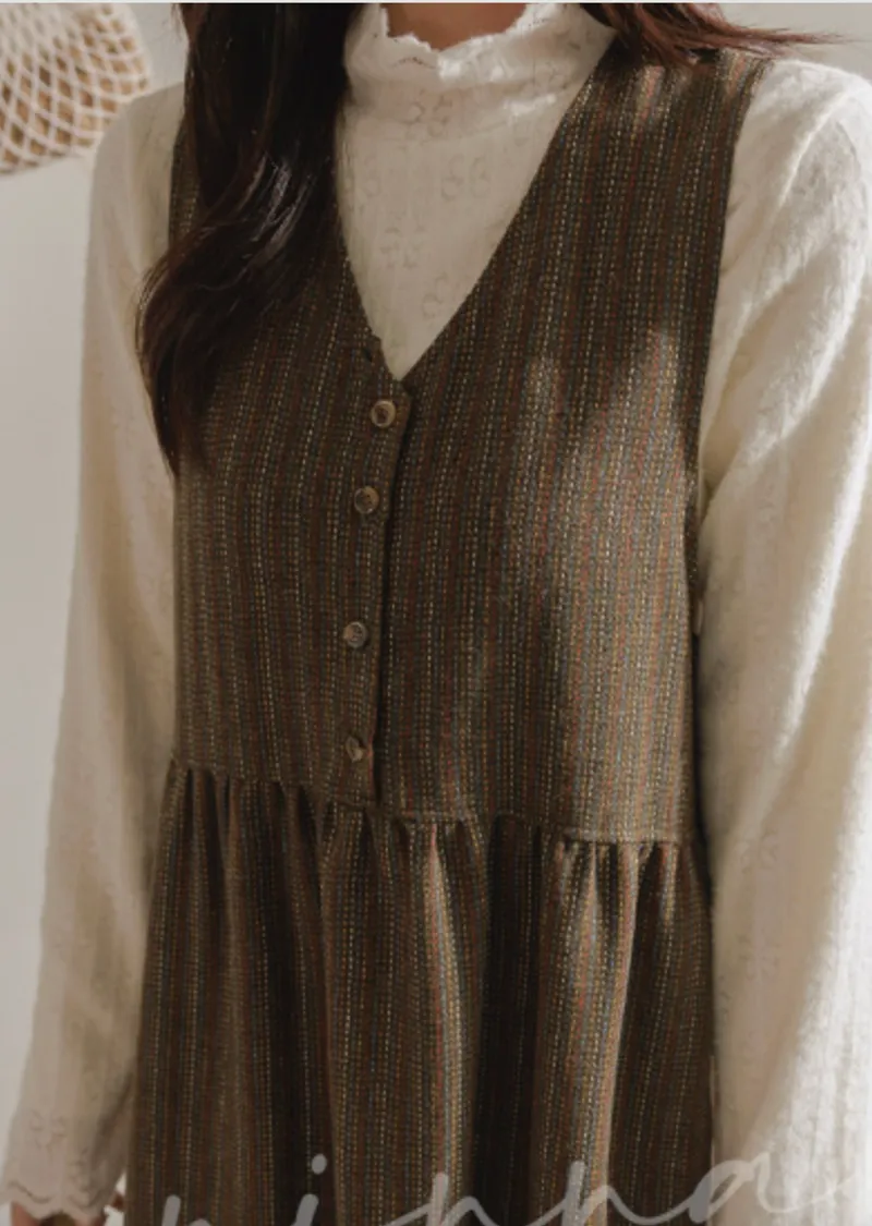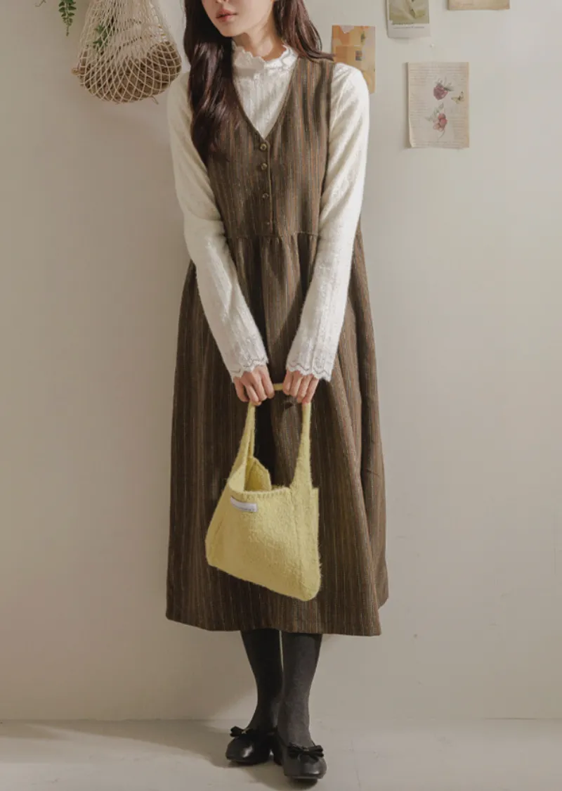 帶有柔和的條紋圖案,微妙的古典氛圍 ,一件飄逸的V領疊層連身裙。柔和色調背景上的豎條紋 ,讓你看起來更苗條的效果。溫暖而復古的氛圍,一種厚實的布料,所以很適合冬天穿。 領口採用淺V領設計。領口設計簡潔俐落,搭配內襯時,帶出層次感 !簡潔的前紐扣細節 在輪廓上新增一個特點,營造了一種既簡潔又充滿情感的氛圍。按鈕線條引導視線向上移動,整體比例更長 ^^自然地低於腰線, 輕微的褶皺,長A字裙擺造型完成!覆蓋下半身線條,每走一步都會略微撐開,,營造出一種女性化且舒適的氛圍。長款設計,更襯托您的身材。柔和的色彩和條紋圖案,處處都散發著時尚氣息,很有冬日氣息的洋裝 :)