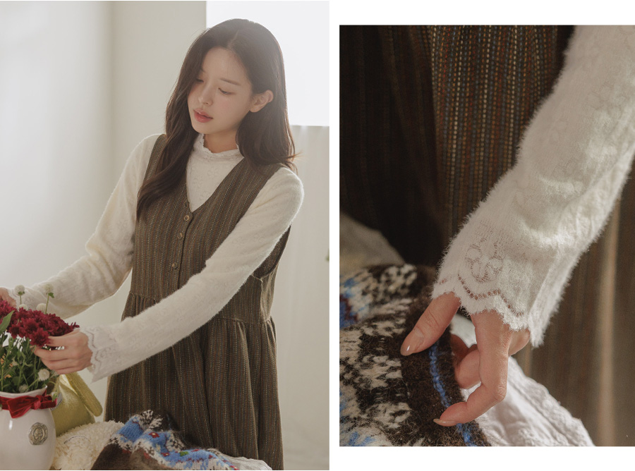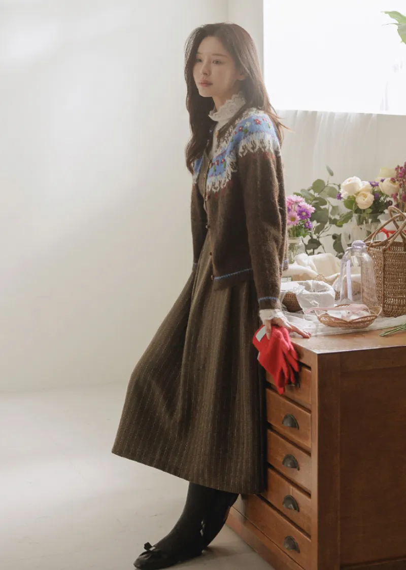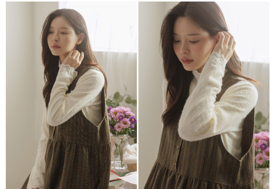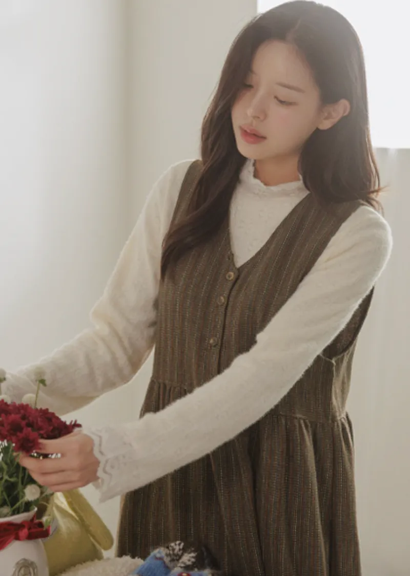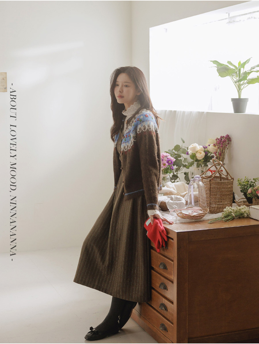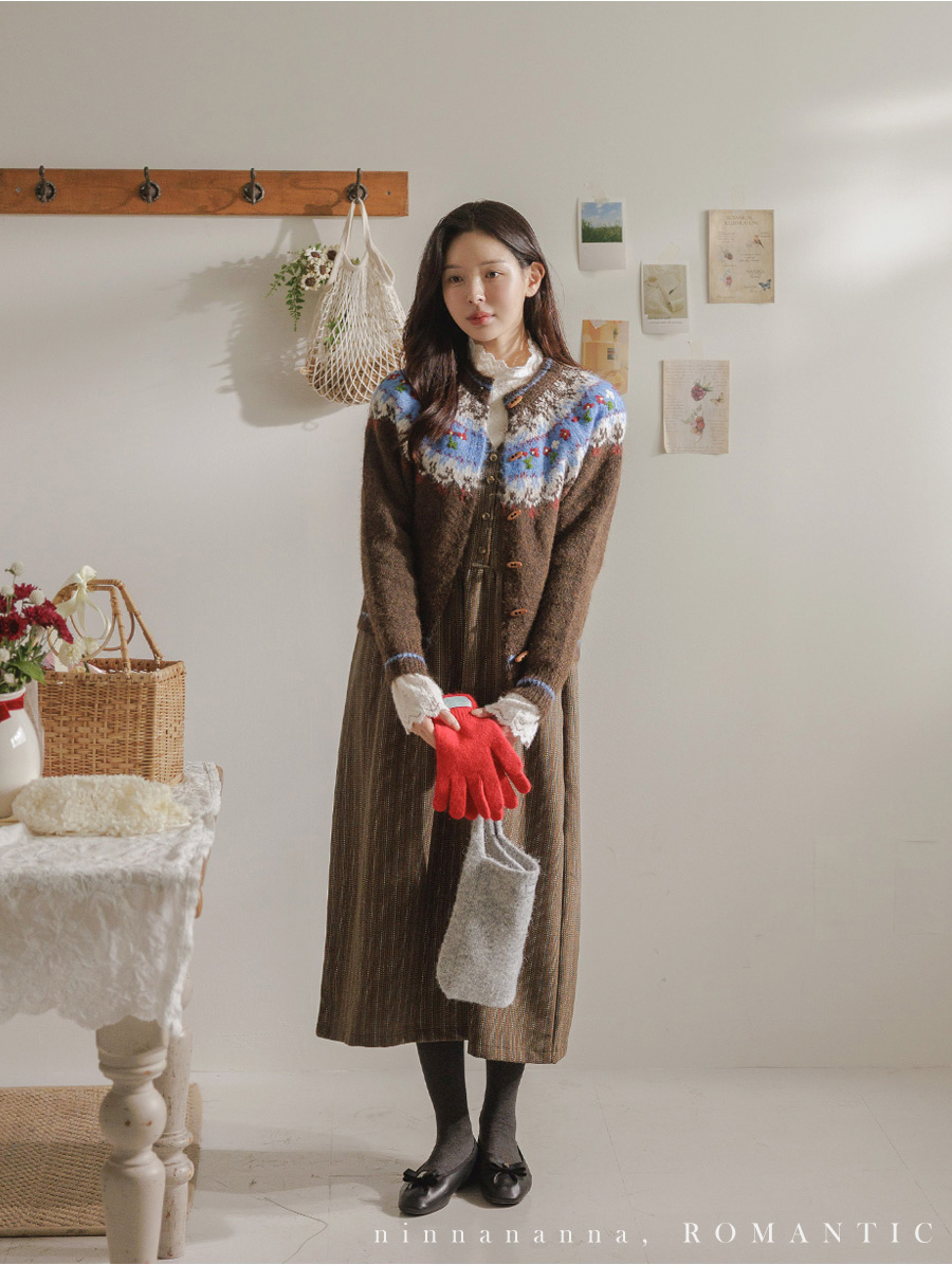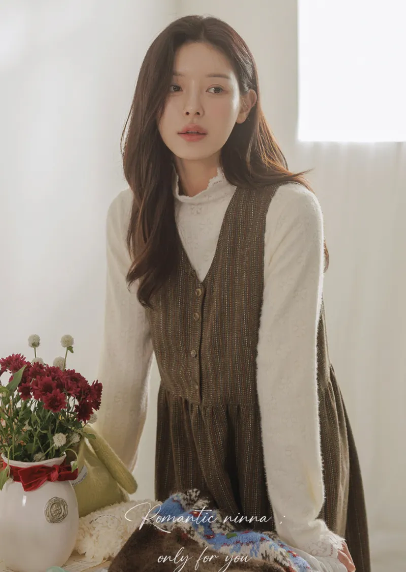 帶有柔和的條紋圖案,微妙的古典氛圍 ,一件飄逸的V領疊層連身裙。柔和色調背景上的豎條紋 ,讓你看起來更苗條的效果。溫暖而復古的氛圍,一種厚實的布料,所以很適合冬天穿。 領口採用淺V領設計。領口設計簡潔俐落,搭配內襯時,帶出層次感 !簡潔的前紐扣細節 在輪廓上新增一個特點,營造了一種既簡潔又充滿情感的氛圍。按鈕線條引導視線向上移動,整體比例更長 ^^自然地低於腰線, 輕微的褶皺,長A字裙擺造型完成!覆蓋下半身線條,每走一步都會略微撐開,,營造出一種女性化且舒適的氛圍。長款設計,更襯托您的身材。柔和的色彩和條紋圖案,處處都散發著時尚氣息,很有冬日氣息的洋裝 :)