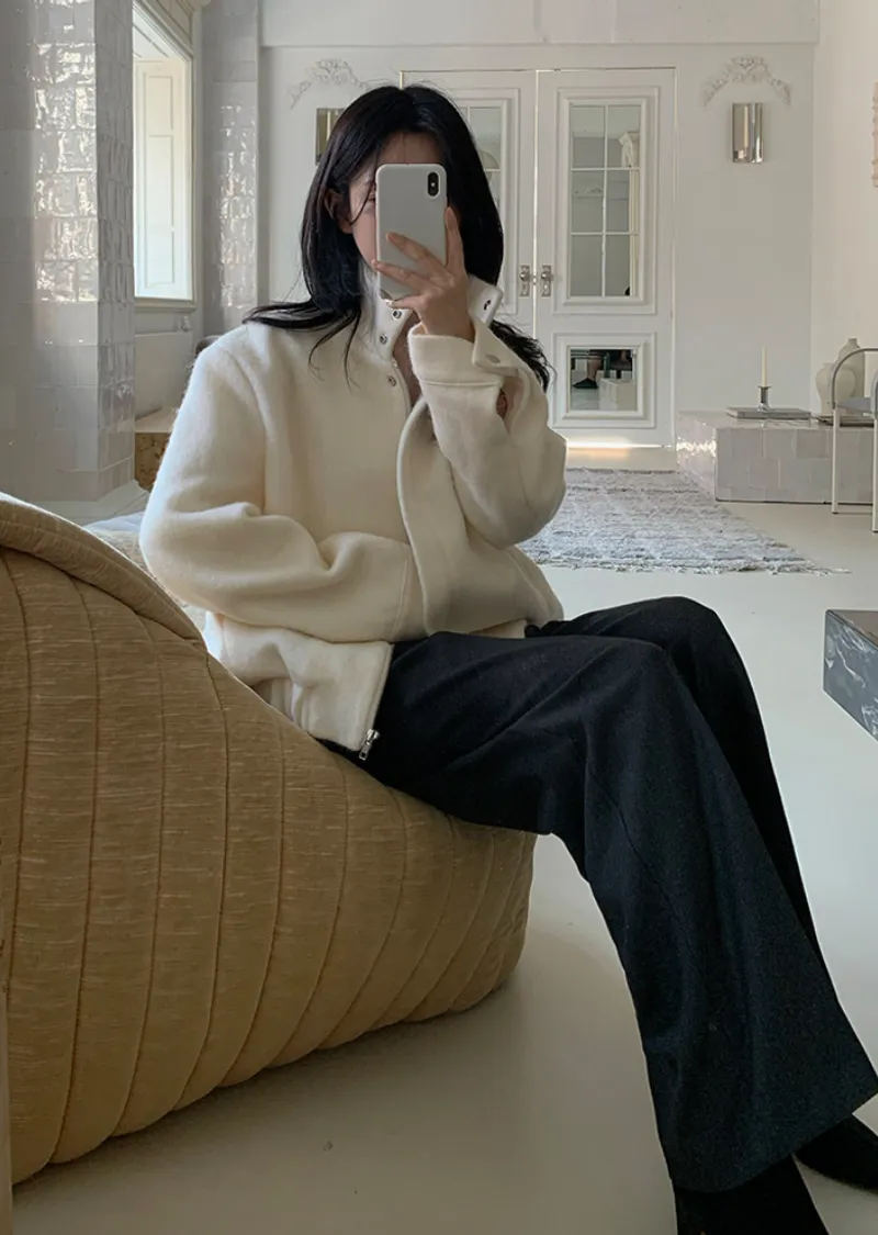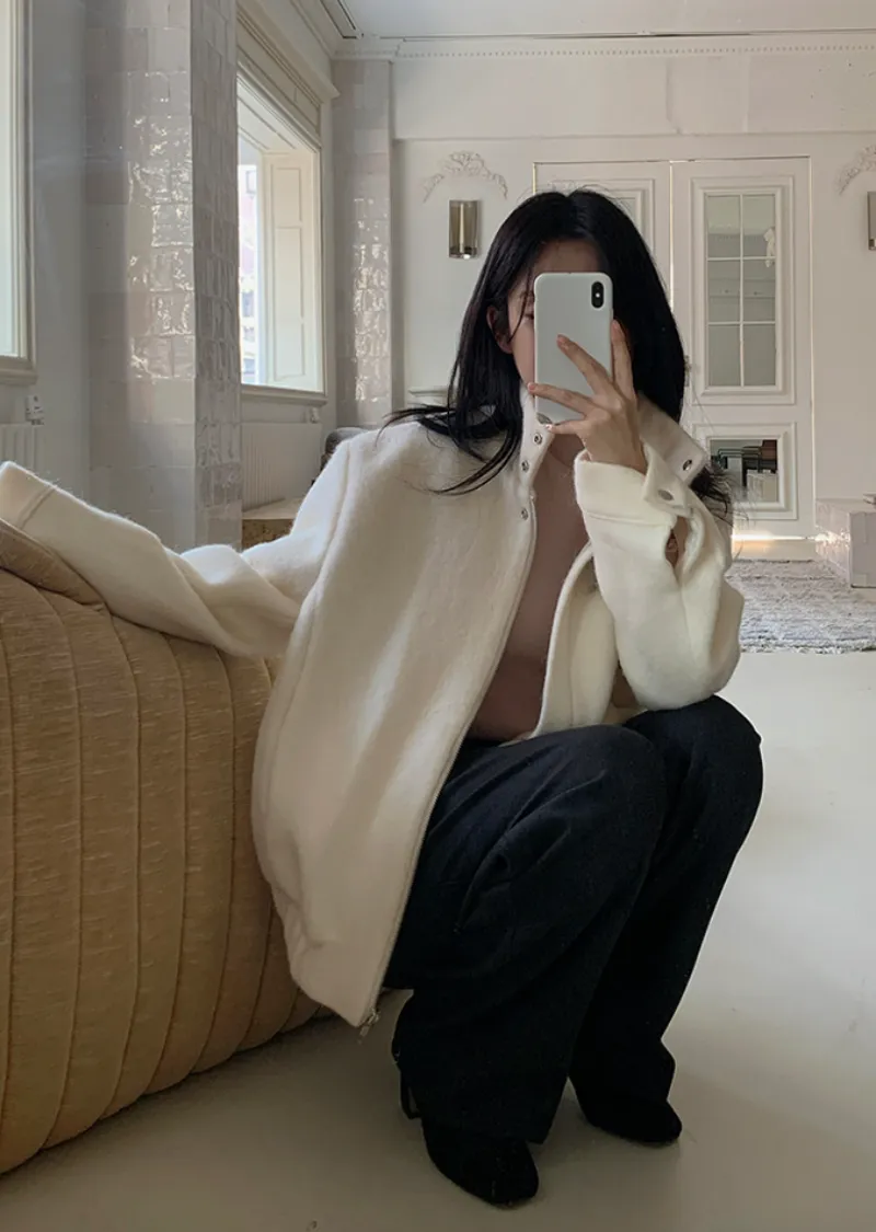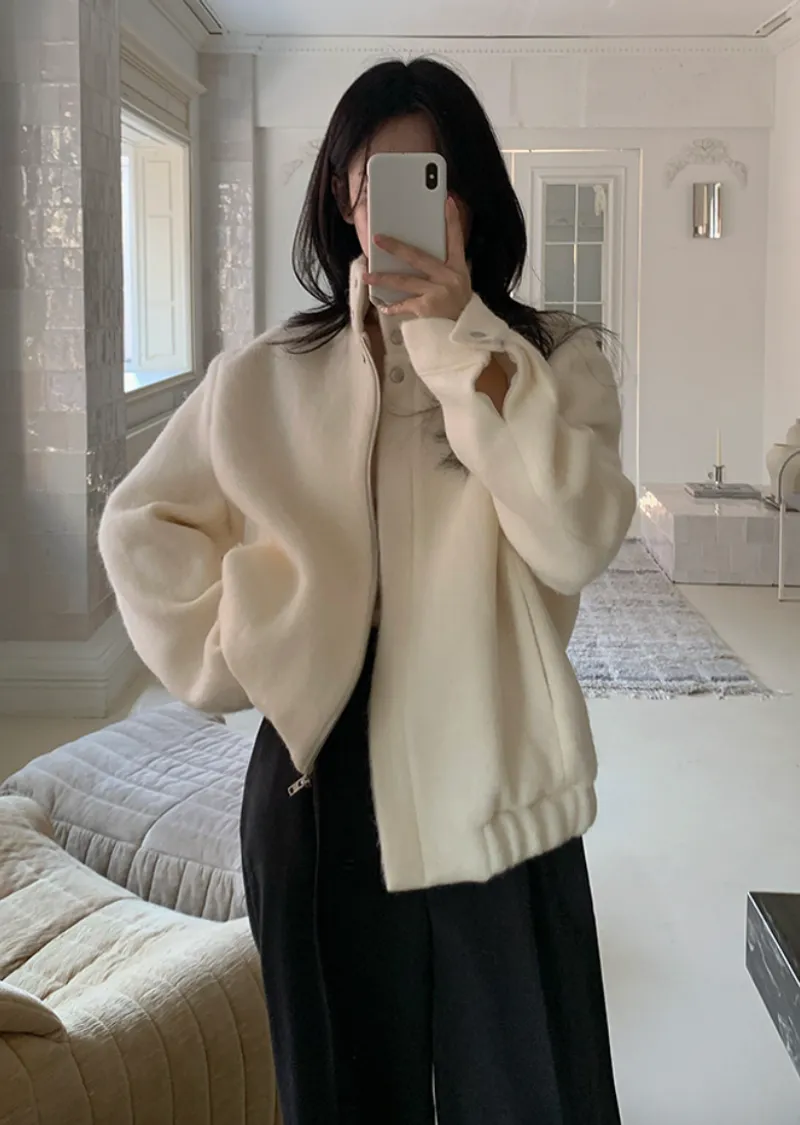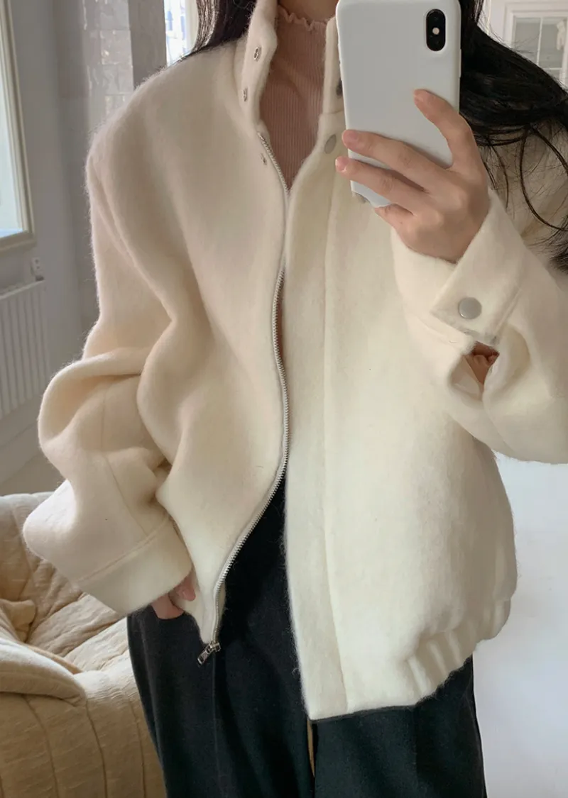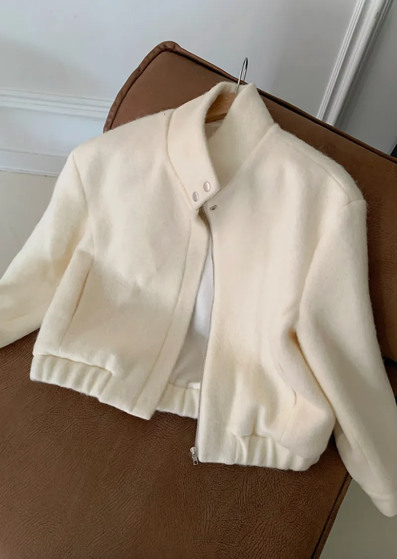 這款短外套採用寬鬆版型和羊毛混紡面料