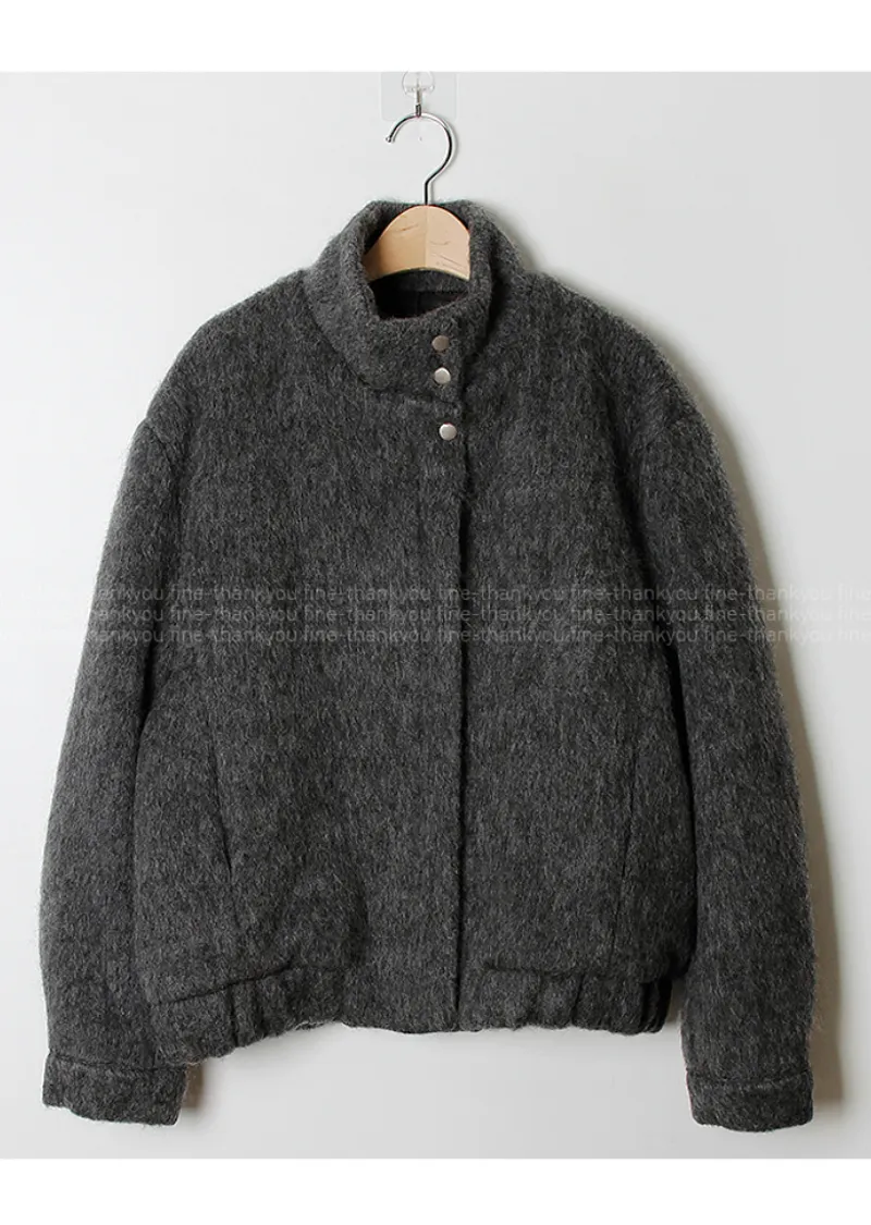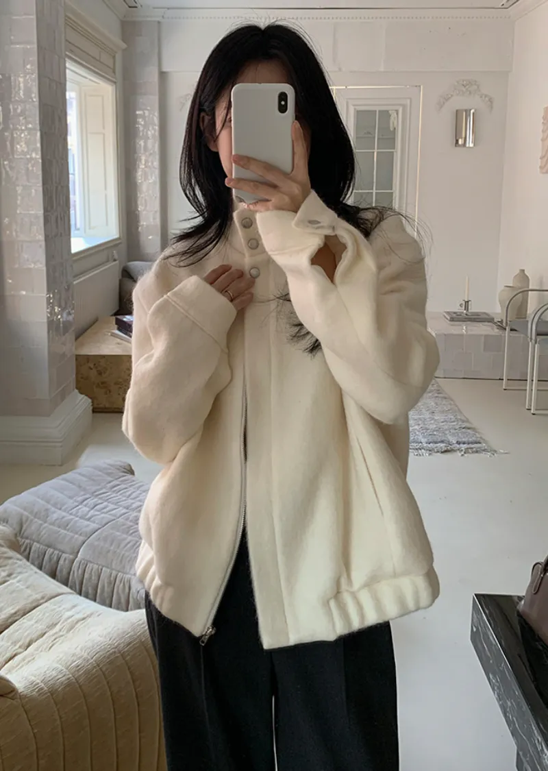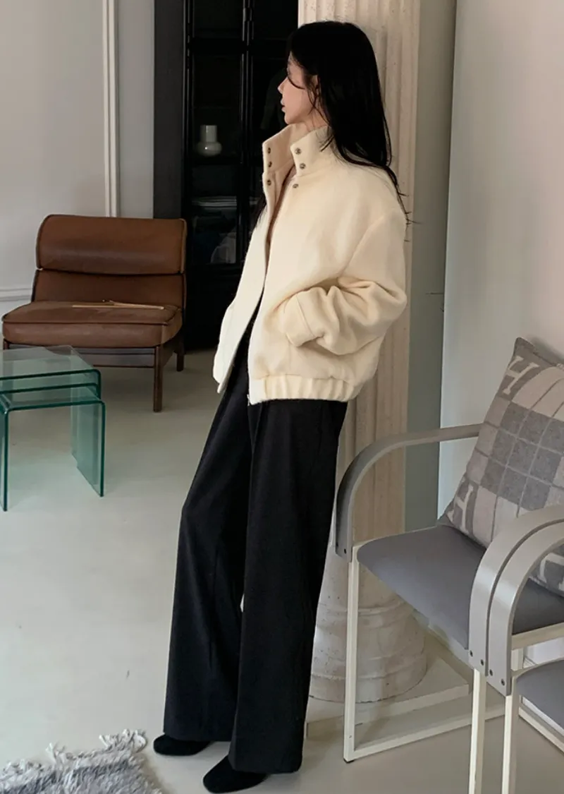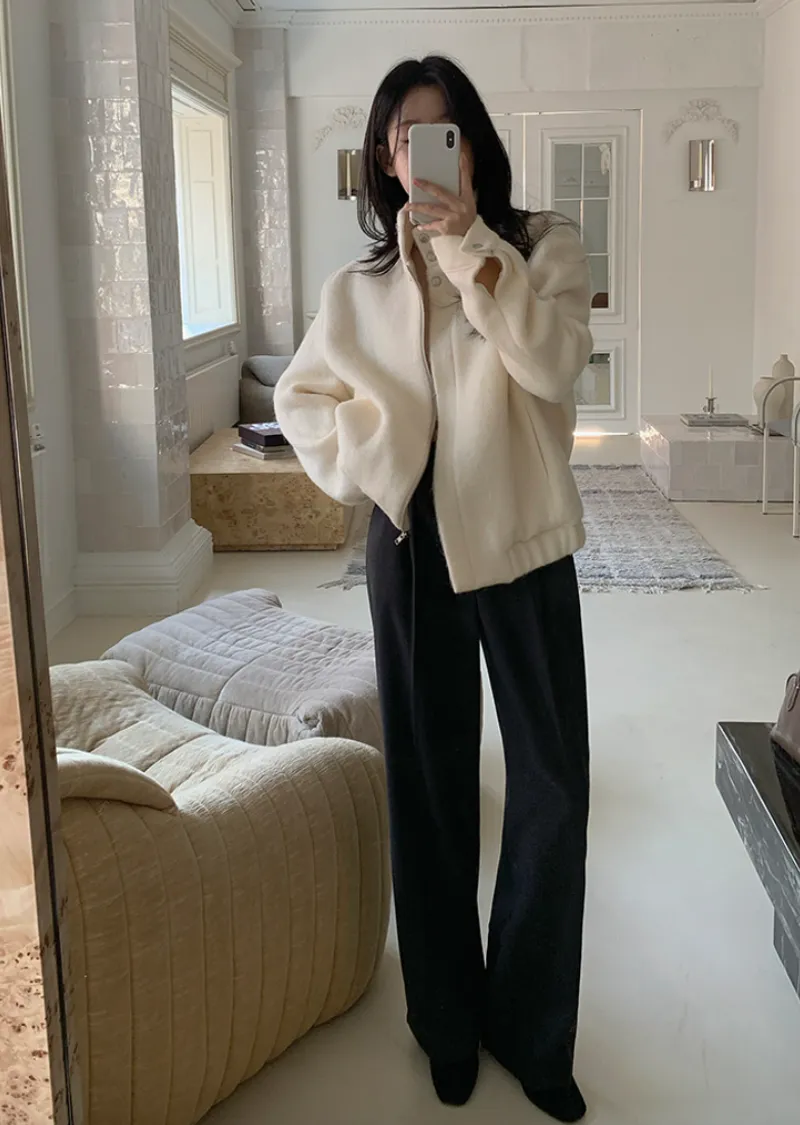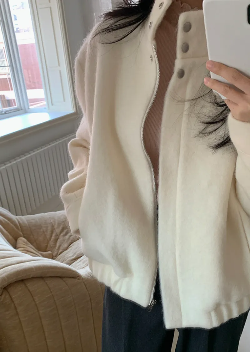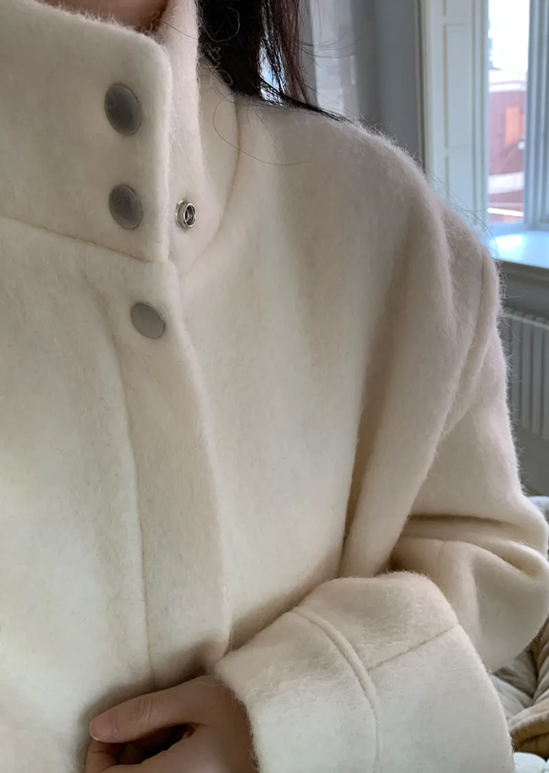 這款短外套採用寬鬆版型和羊毛混紡面料