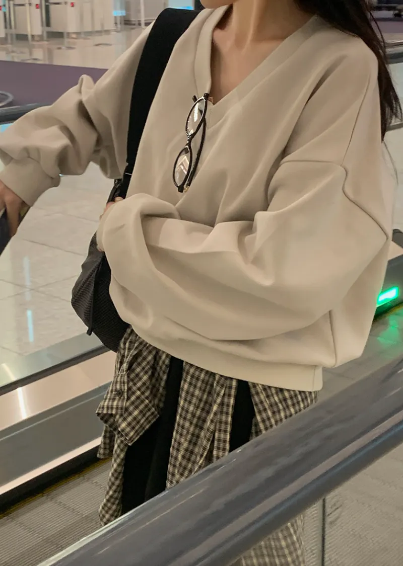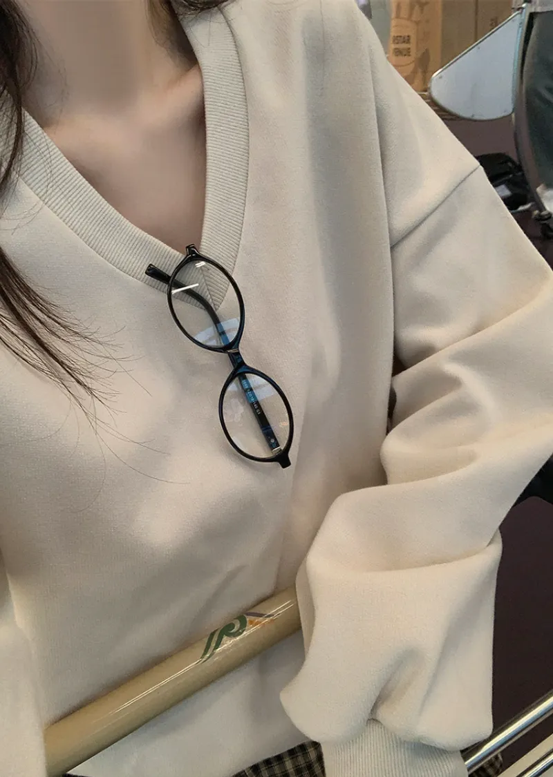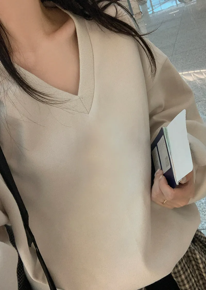 時尚氣息寬鬆版型半短款V領穿搭上衣