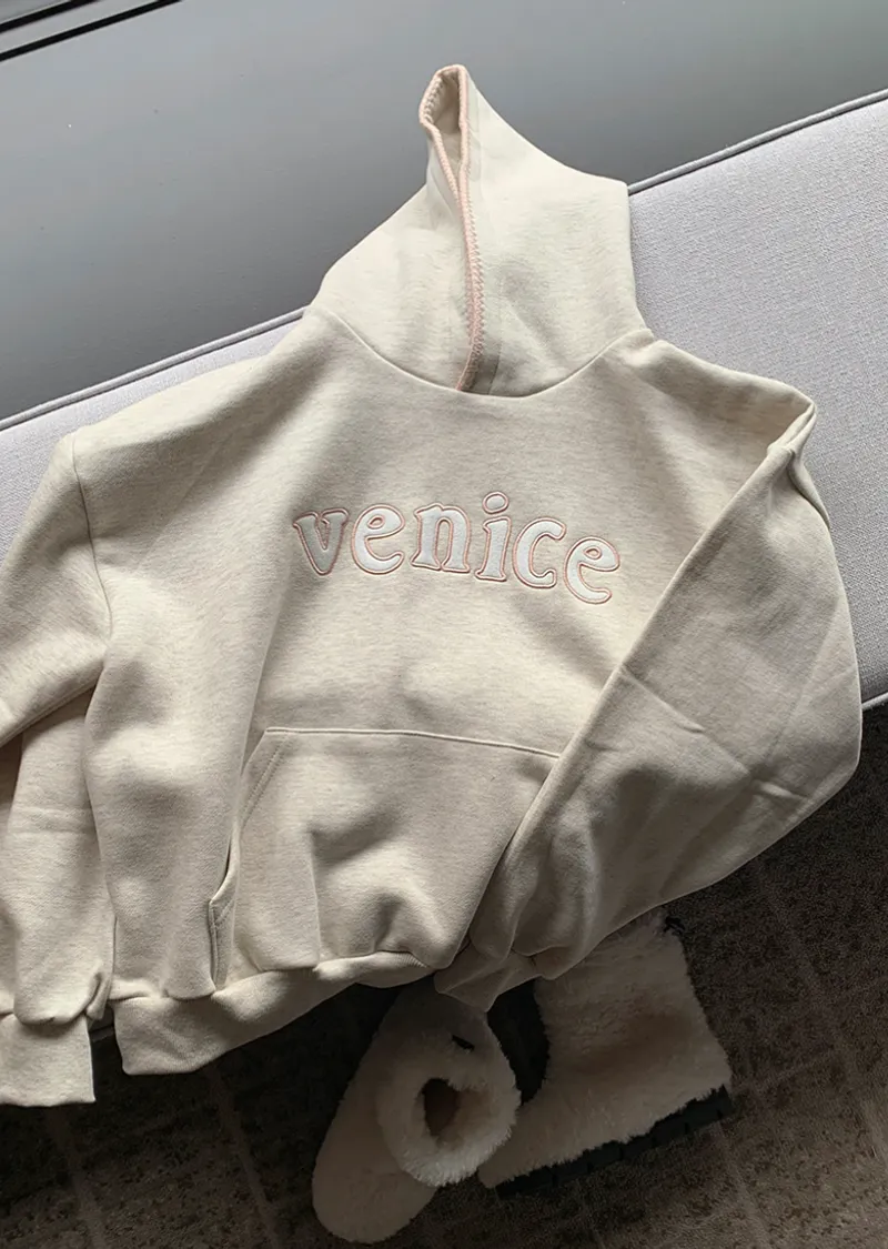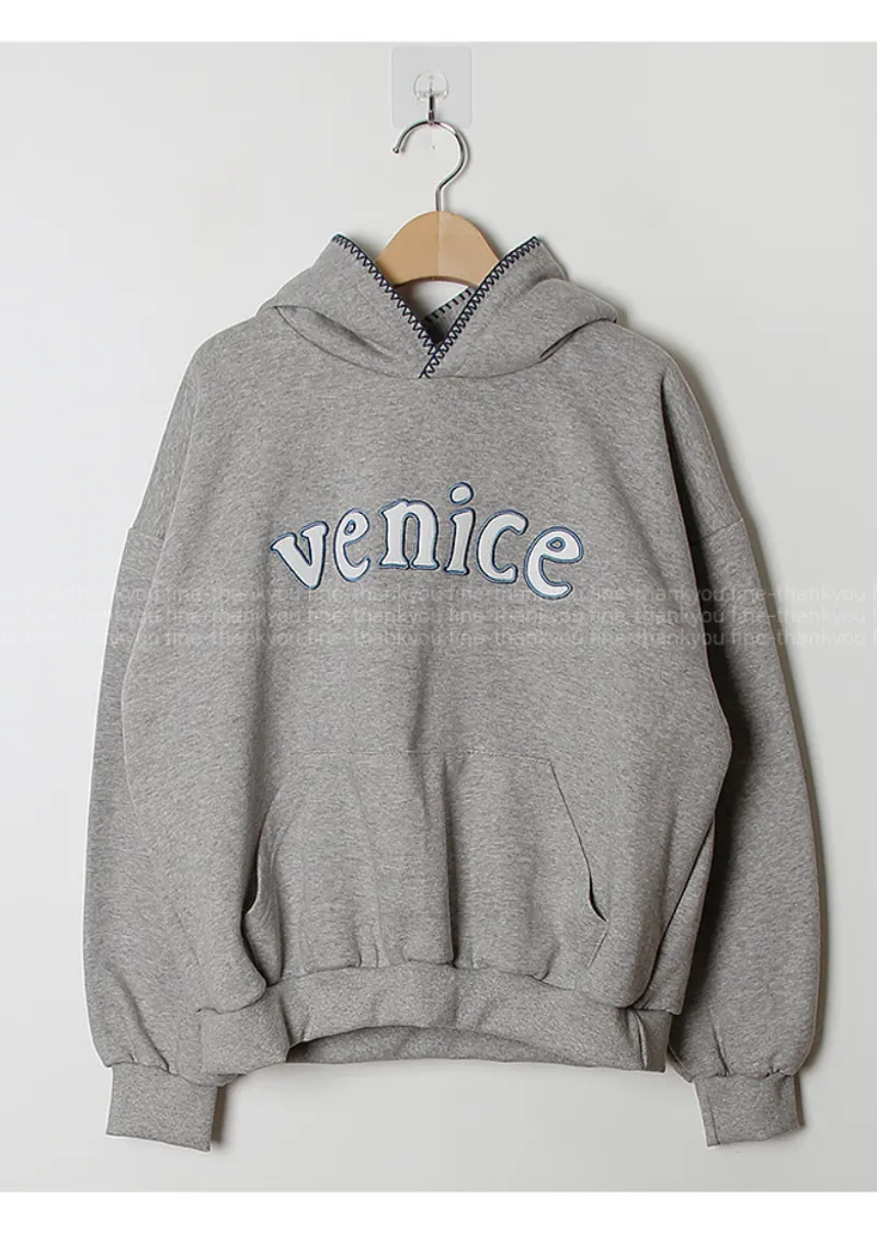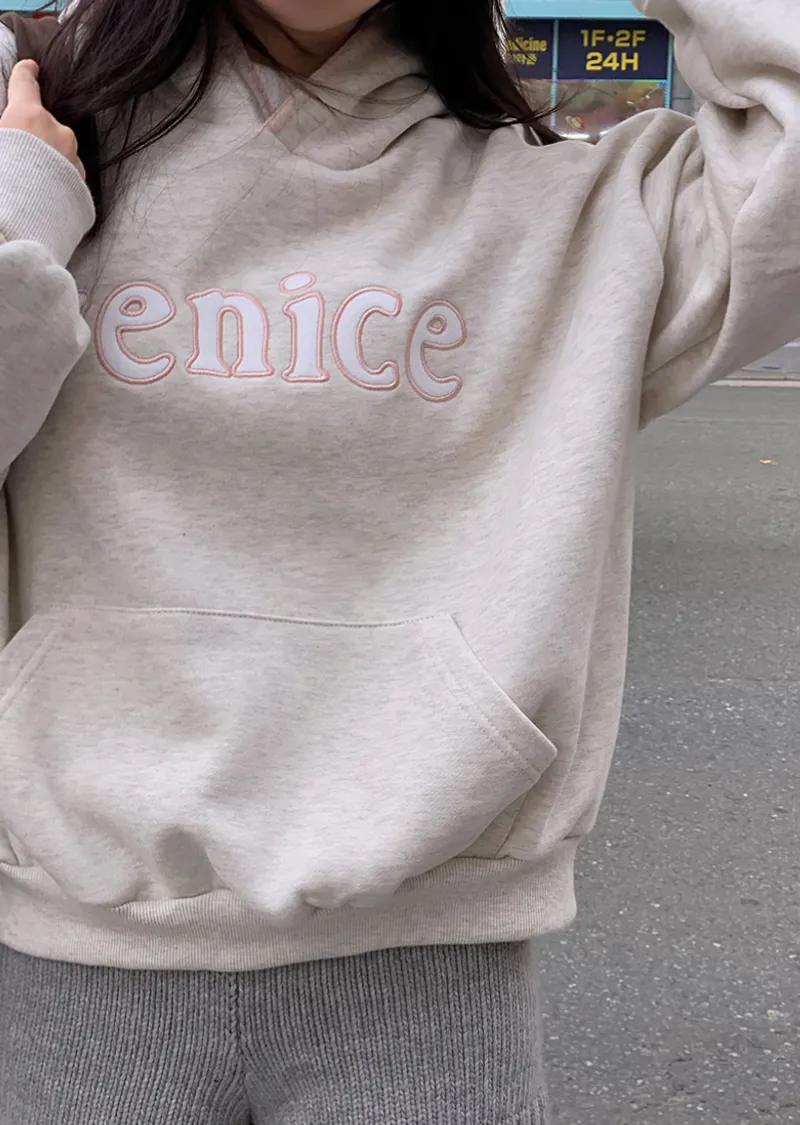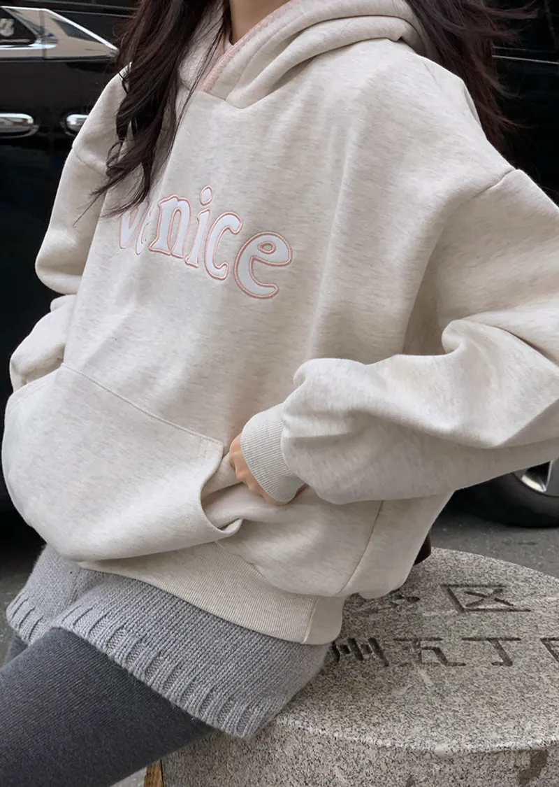 獨特帽沿刺繡邊點綴配色字母袋鼠口袋連帽上衣