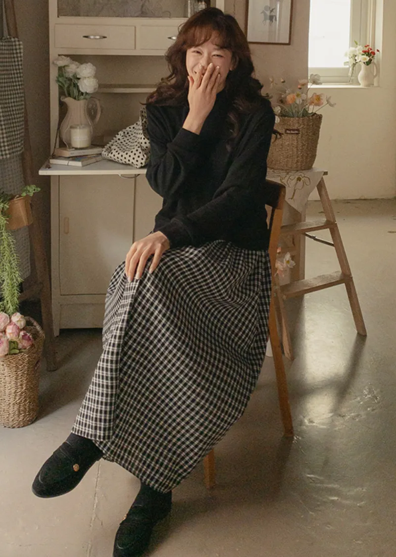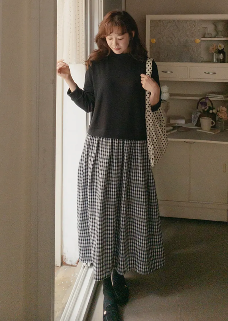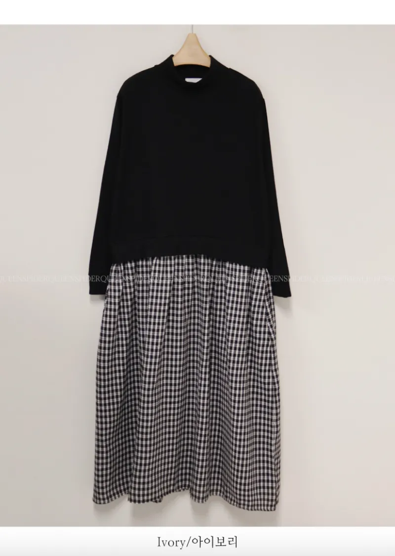 柔和黑色調領口格紋裙擺連身裙