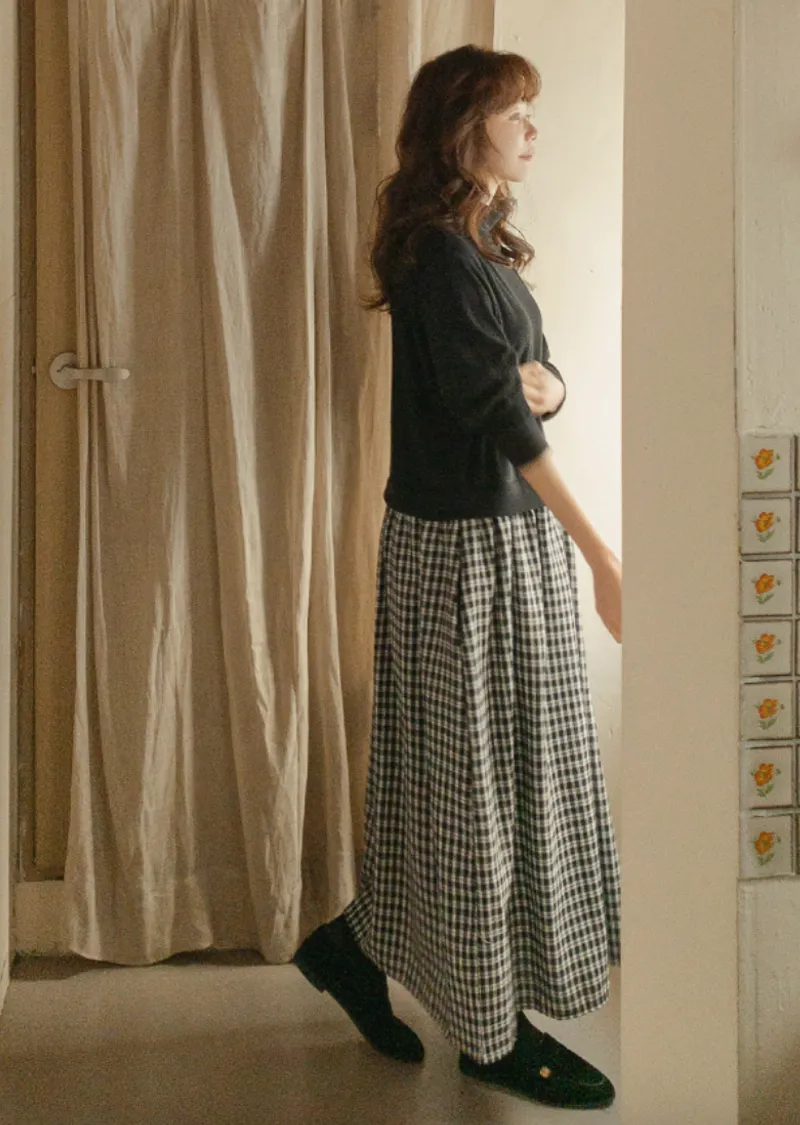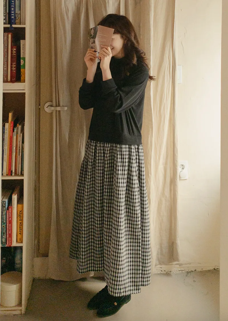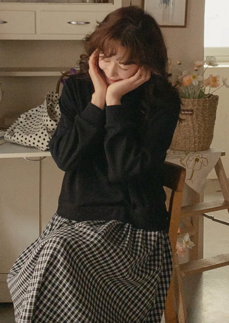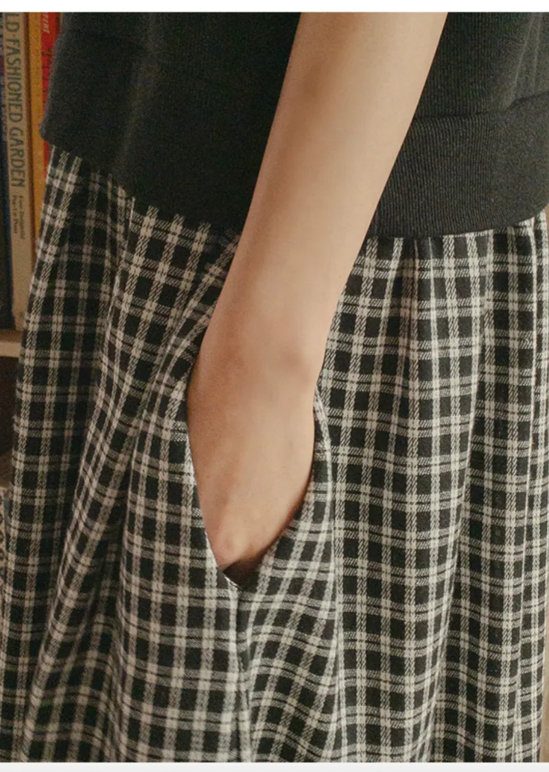 柔和黑色調領口格紋裙擺連身裙