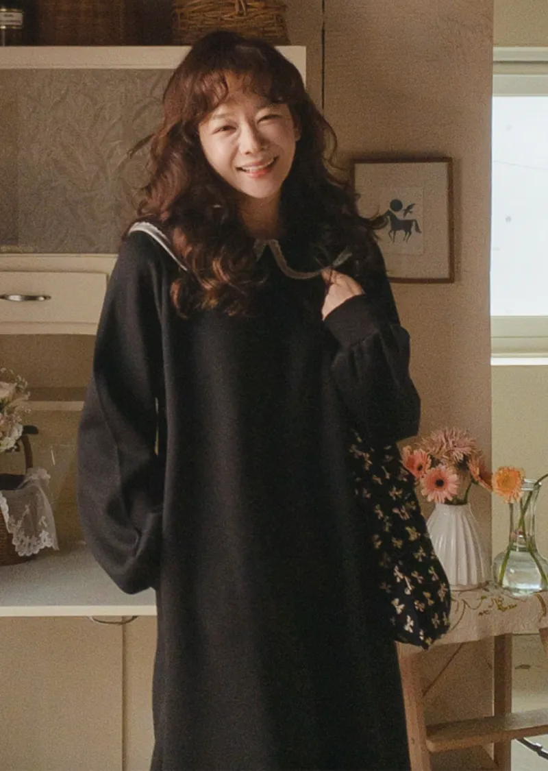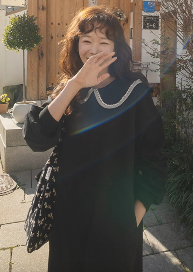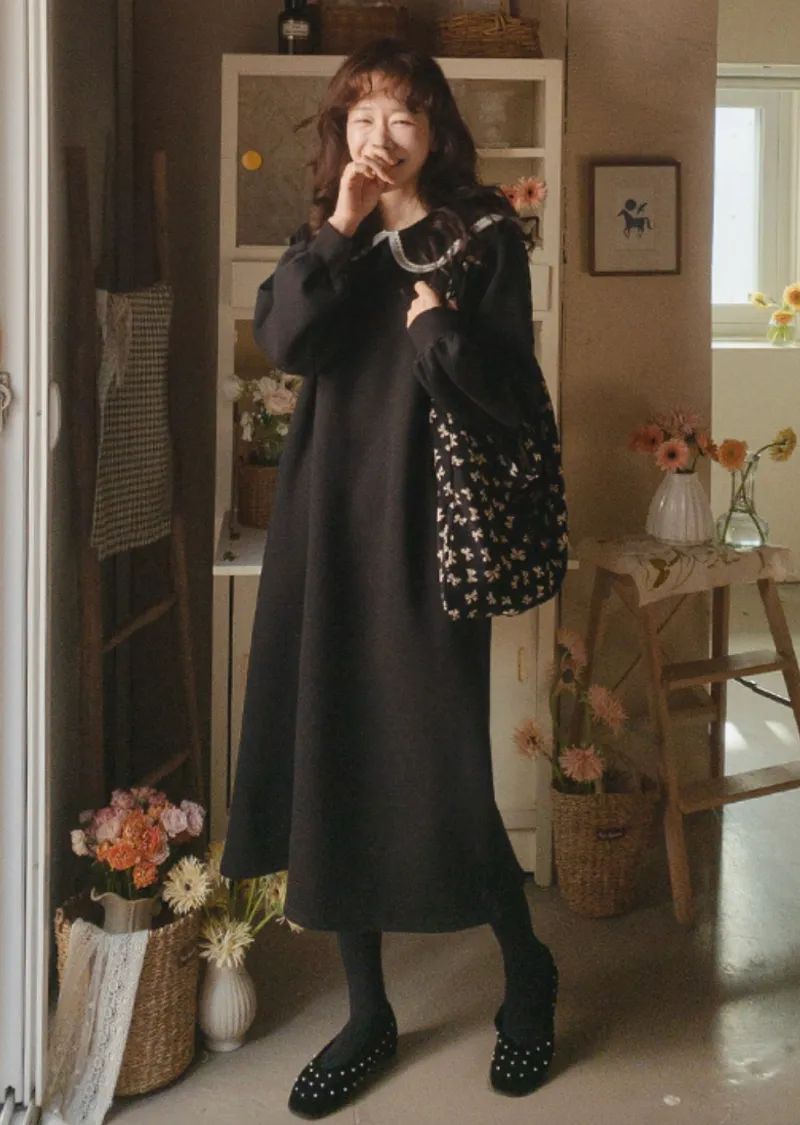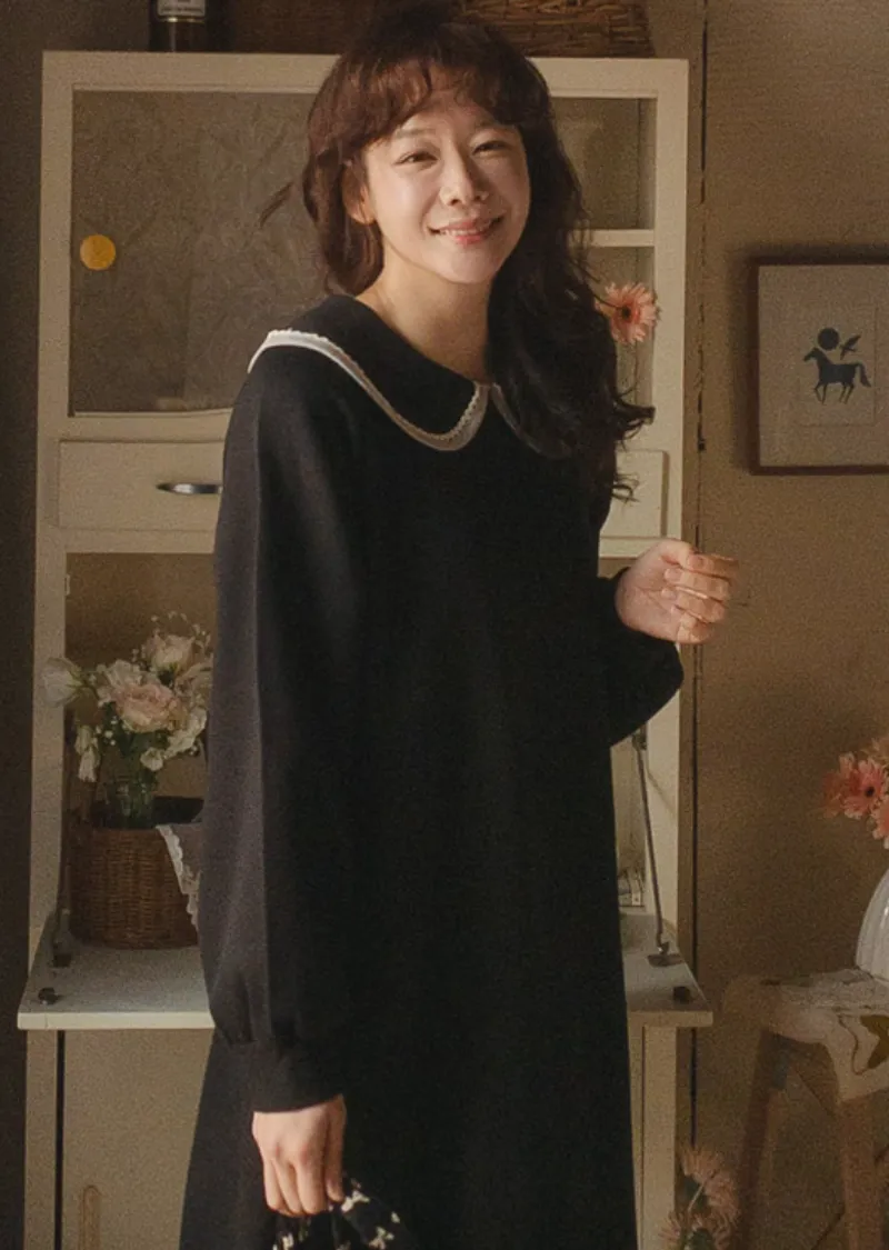 以溫柔閃亮的蕾絲領為亮點的連身裙。沉穩俐落的黑色上點綴著白色的細節。適度寬鬆的寬度和圓潤的廓形,無論哪種體型都可以舒適地穿著,袖子形成自然流暢的線條。膝蓋以下的長度營造出穩重又不失女人味的氣息。觸感柔軟光滑。
