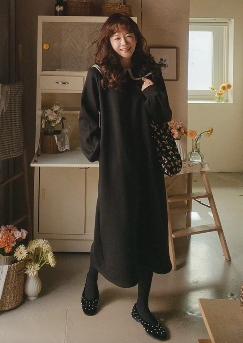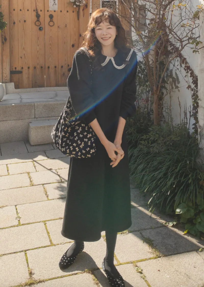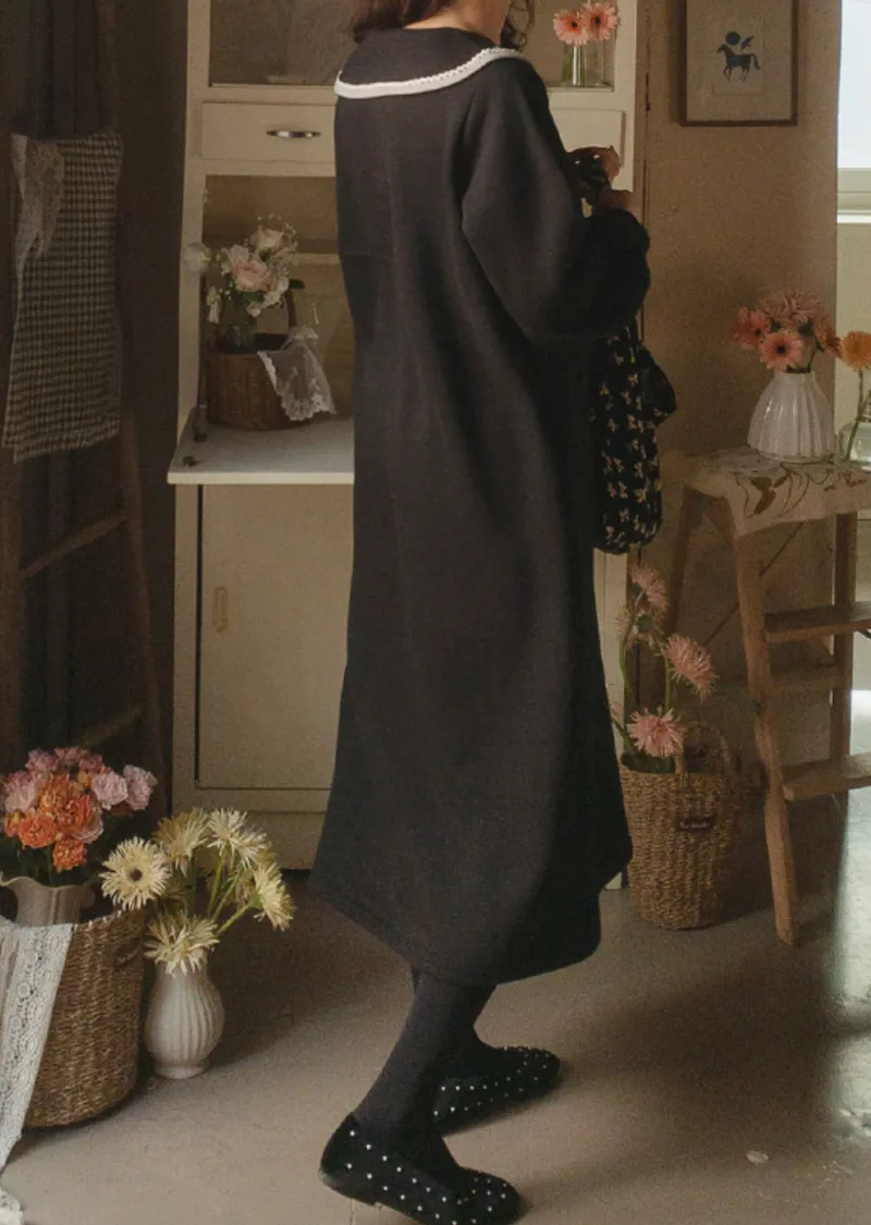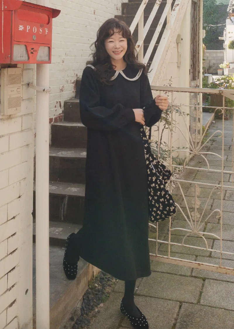 以溫柔閃亮的蕾絲領為亮點的連身裙。沉穩俐落的黑色上點綴著白色的細節。適度寬鬆的寬度和圓潤的廓形,無論哪種體型都可以舒適地穿著,袖子形成自然流暢的線條。膝蓋以下的長度營造出穩重又不失女人味的氣息。觸感柔軟光滑。