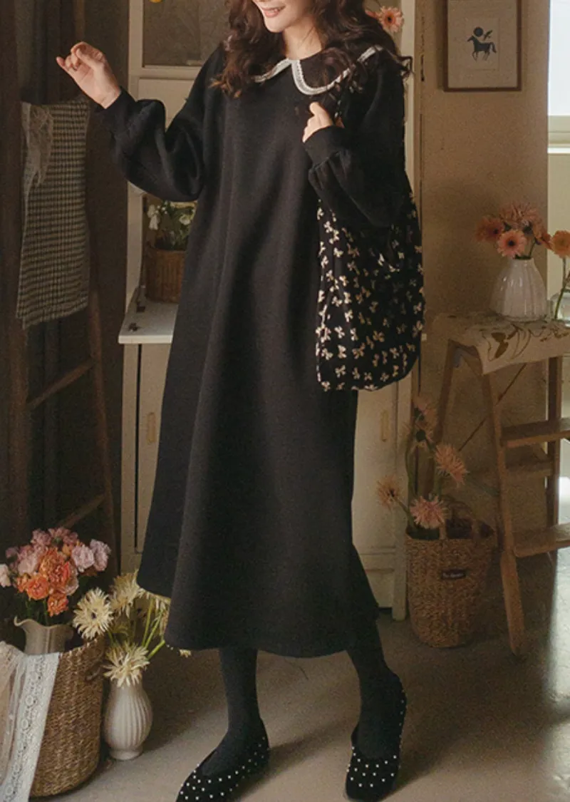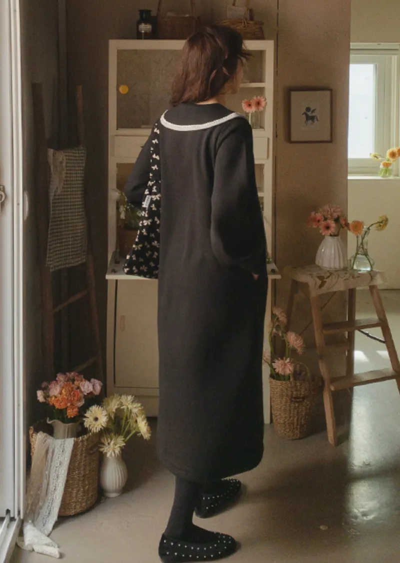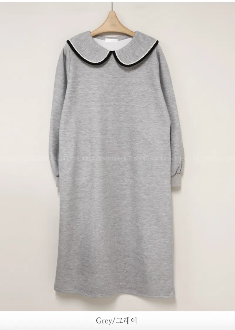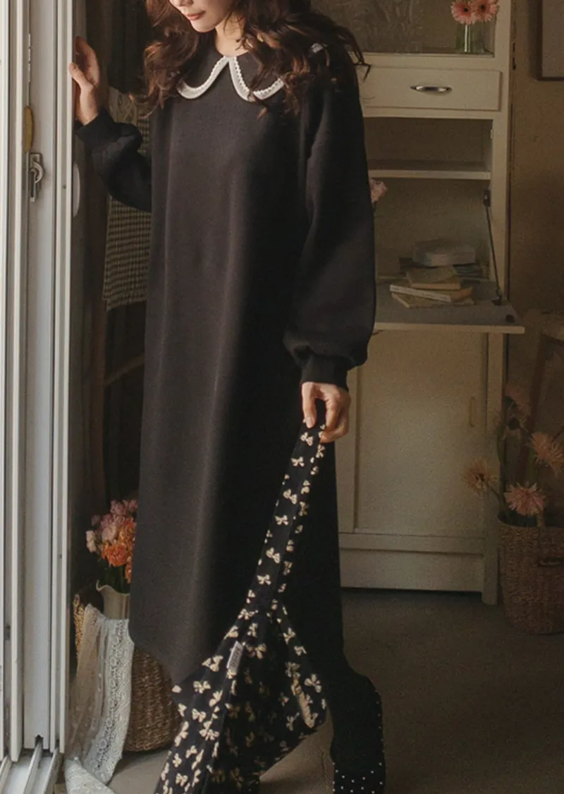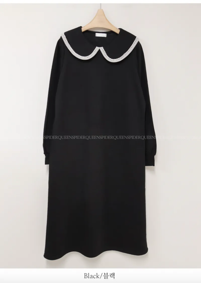 點綴沉穩黑邊白色蕾絲襯邊領舒適流暢線條連身裙