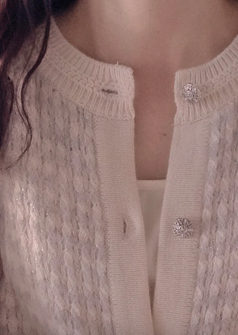 50%羊毛】【珍珠光澤奢華開衫】【帶有微妙立體感的花呢開襟衫】【修身剪裁,營造優雅氛圍】【時尚配色,亮眼百搭】【優雅提升您的整體造型】【帶有獨特紐扣的奢華花呢開衫】