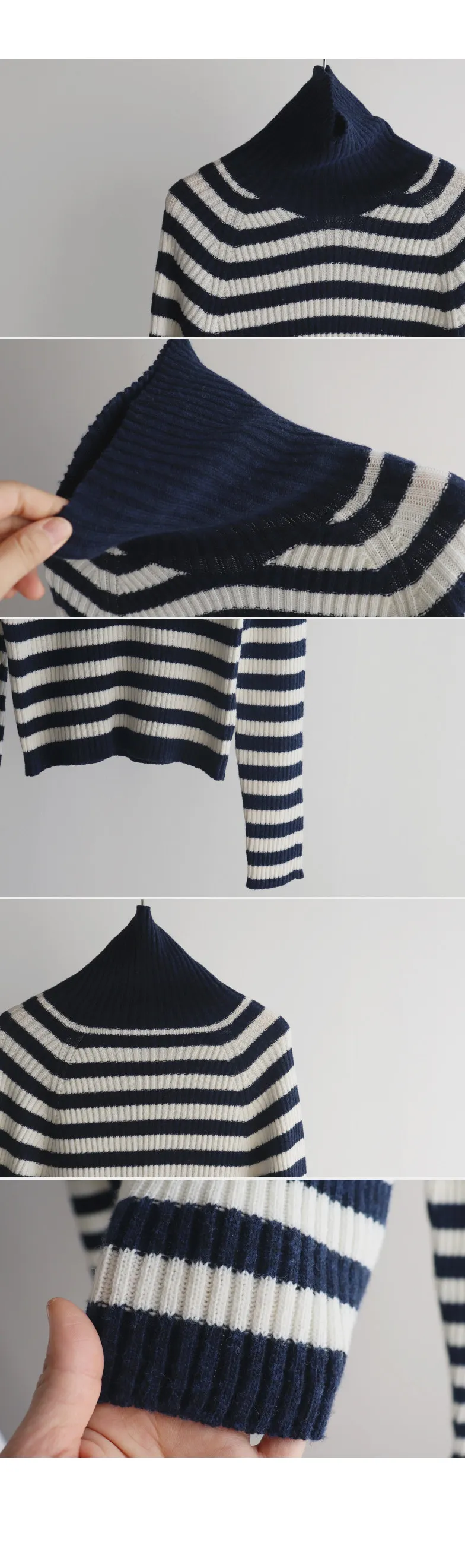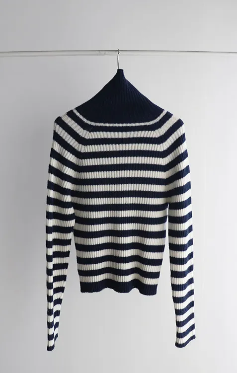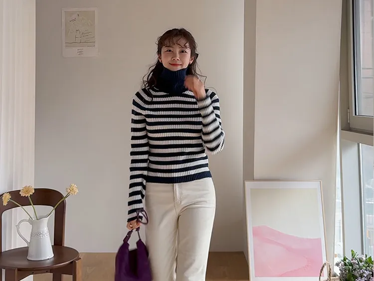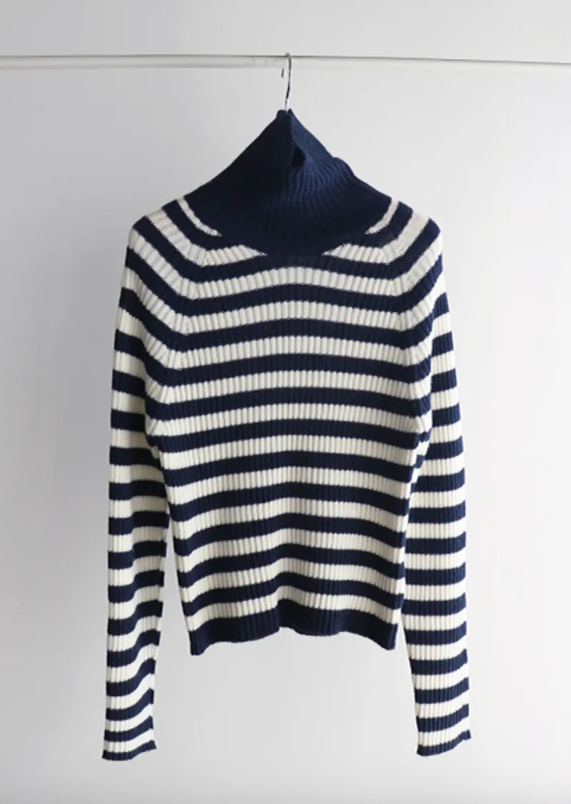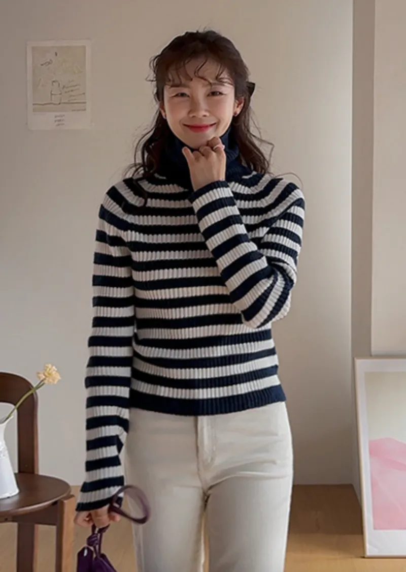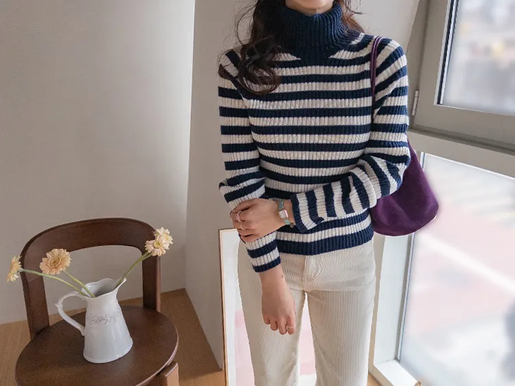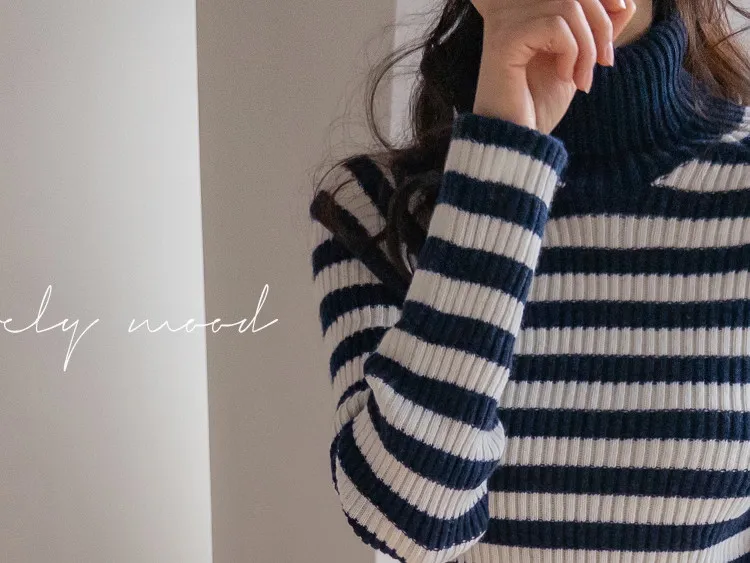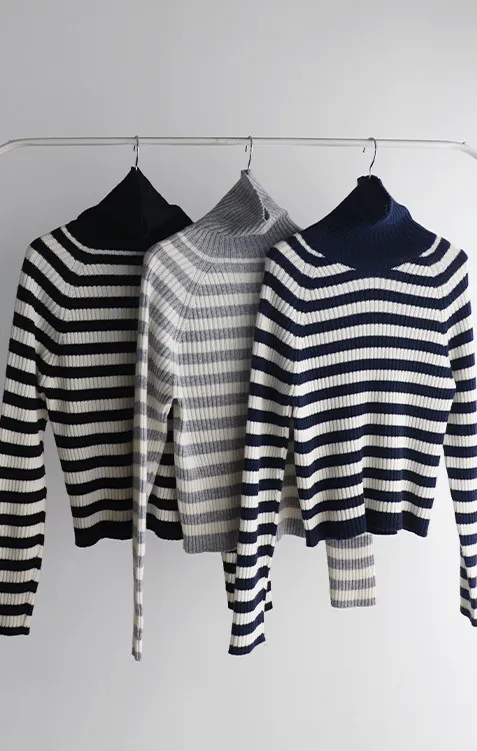 【條紋高領針織衫,日常穿著♥】【舒適貼合,彈性十足~】【可愛的條紋設計~】【領口顏色細節是亮點! 】