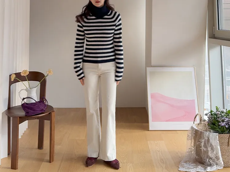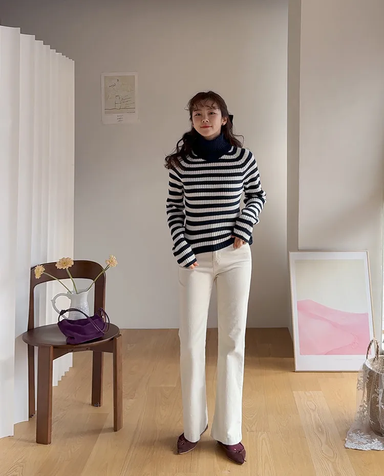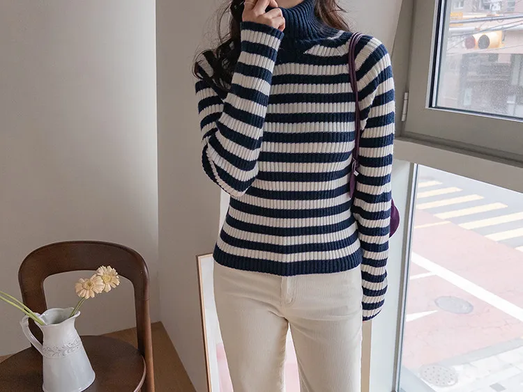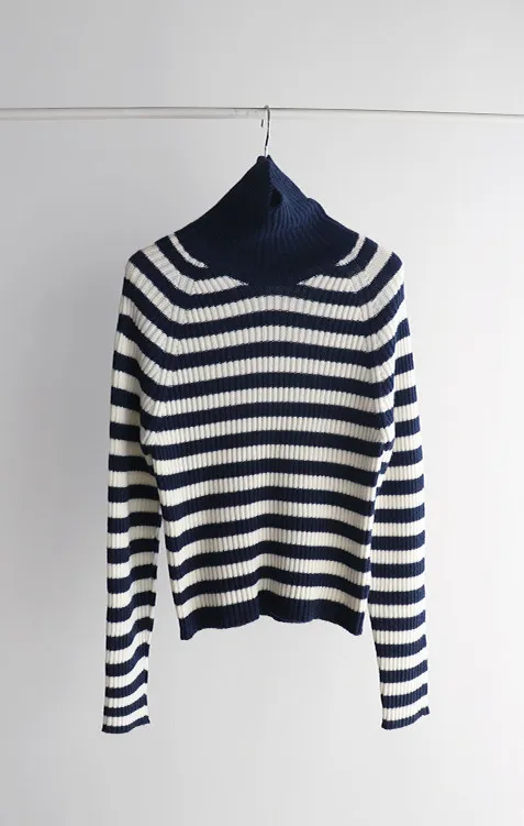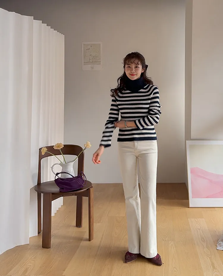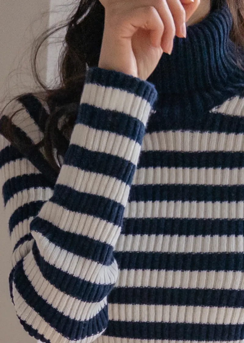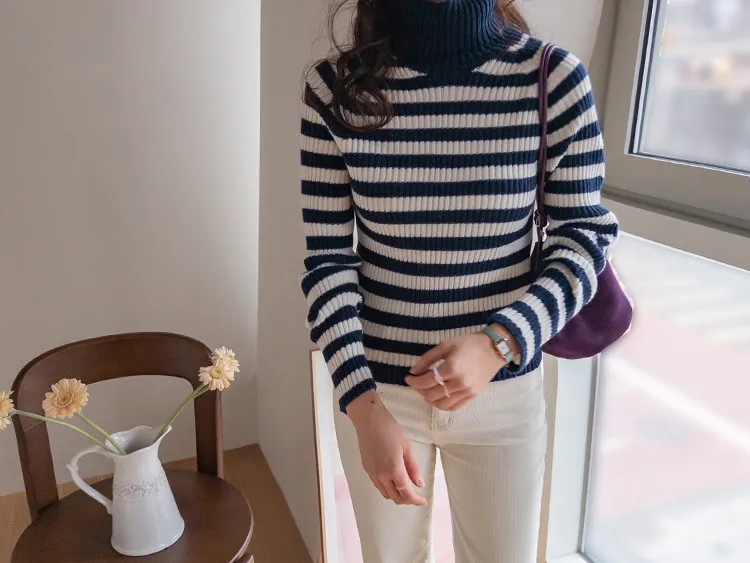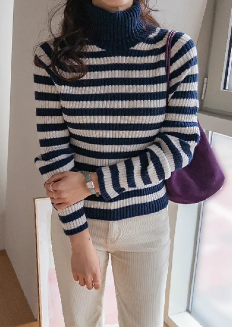 【條紋高領針織衫,日常穿著♥】【舒適貼合,彈性十足~】【可愛的條紋設計~】【領口顏色細節是亮點! 】