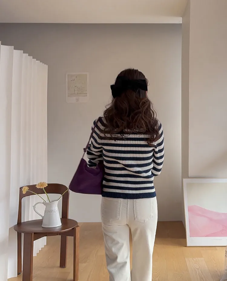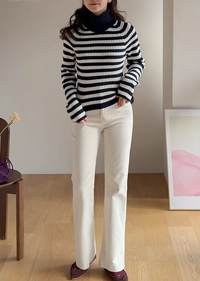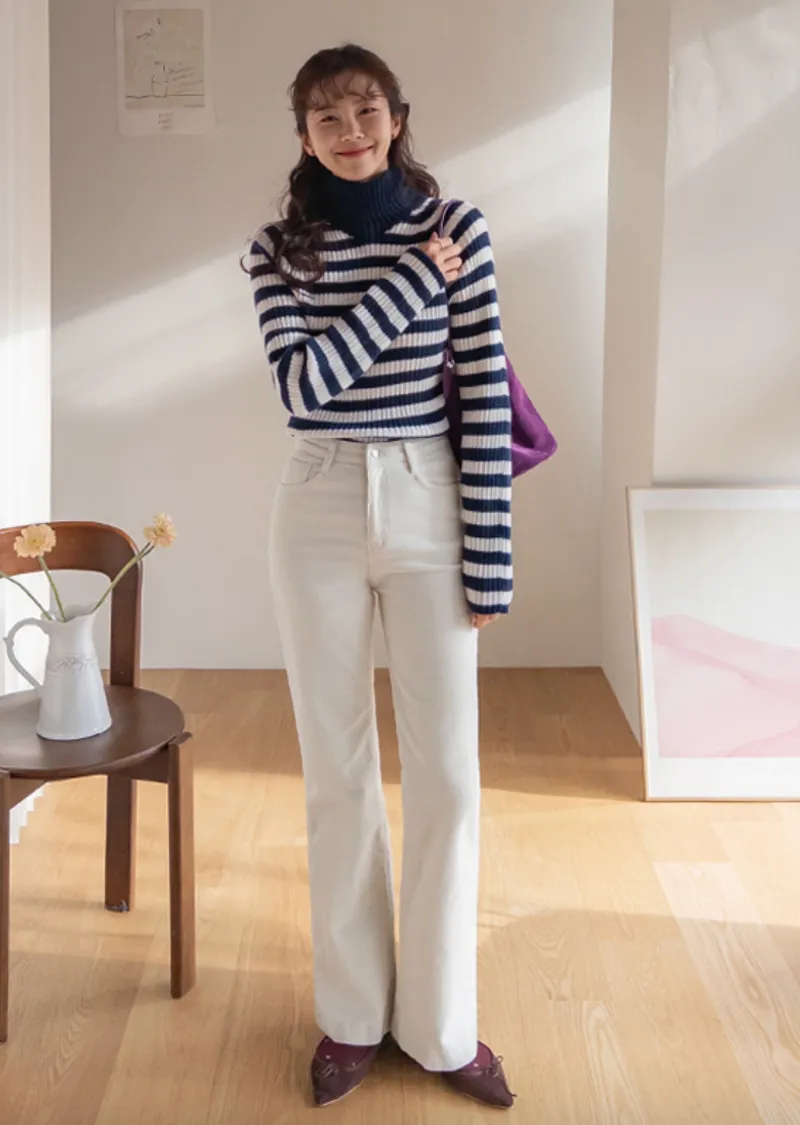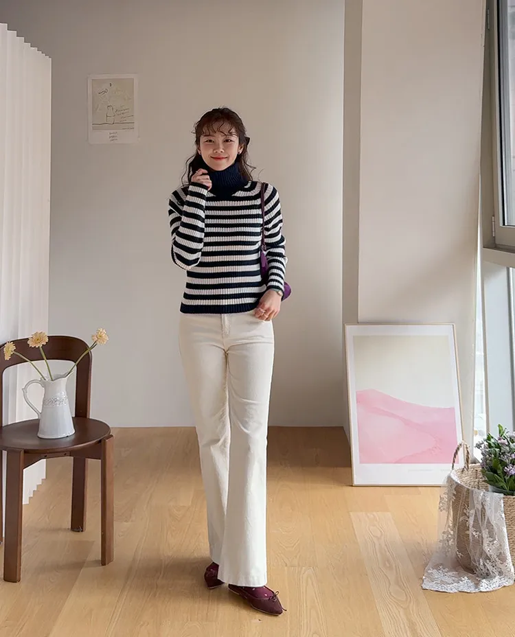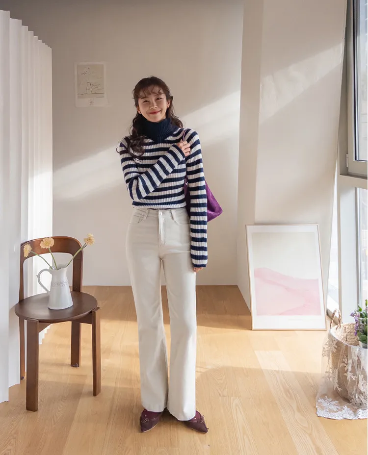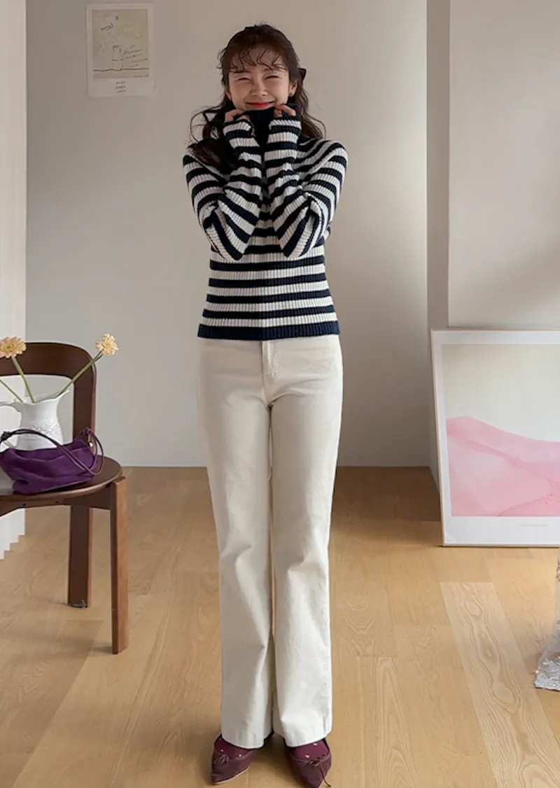 【條紋高領針織衫,日常穿著♥】【舒適貼合,彈性十足~】【可愛的條紋設計~】【領口顏色細節是亮點! 】