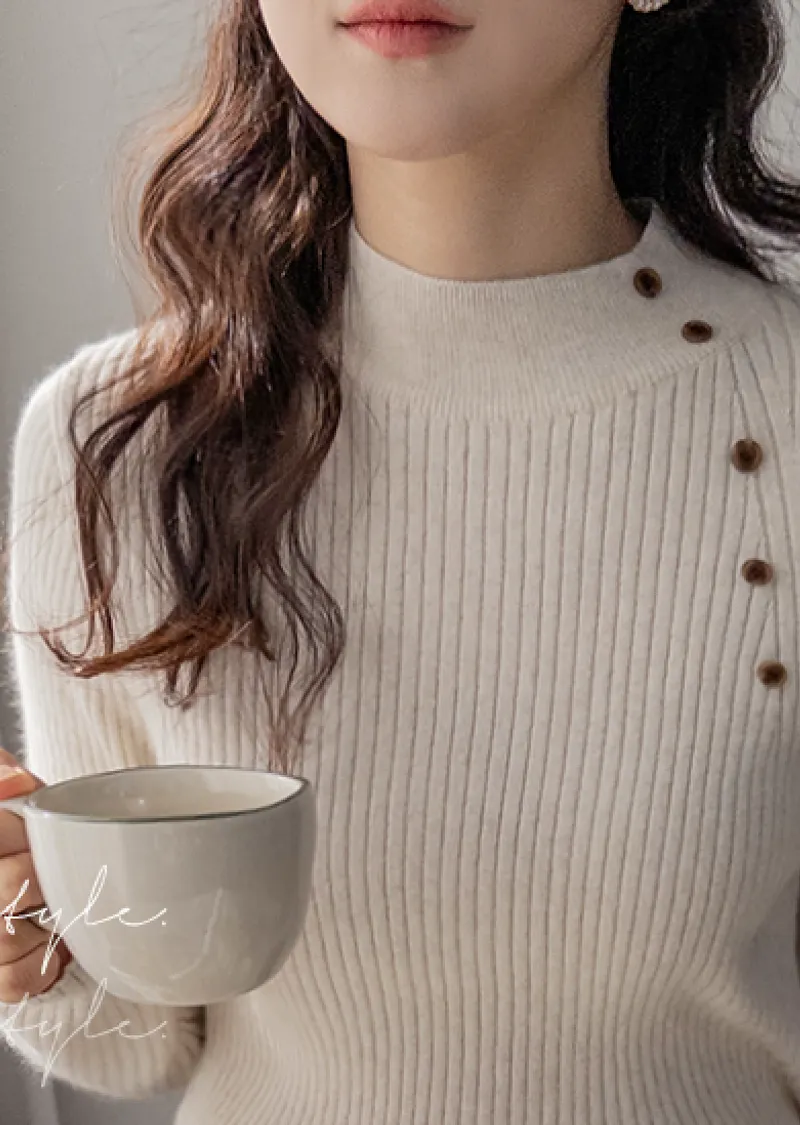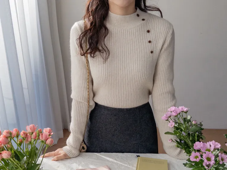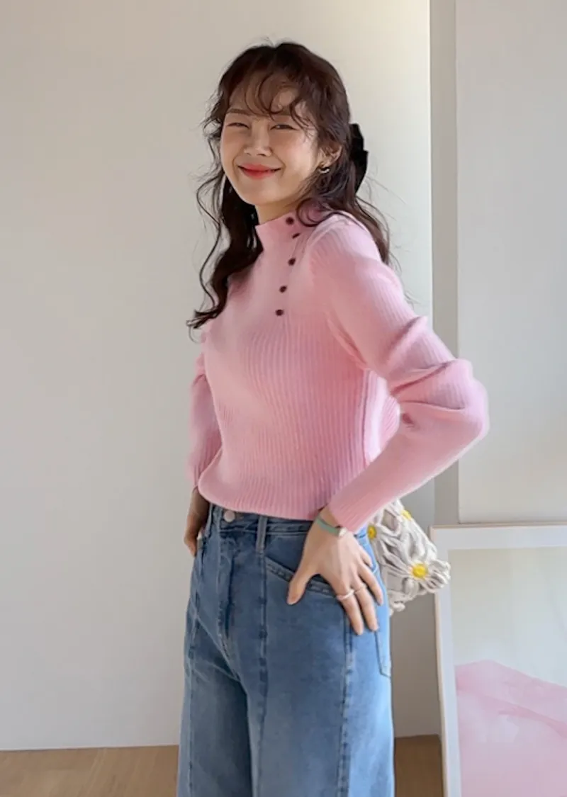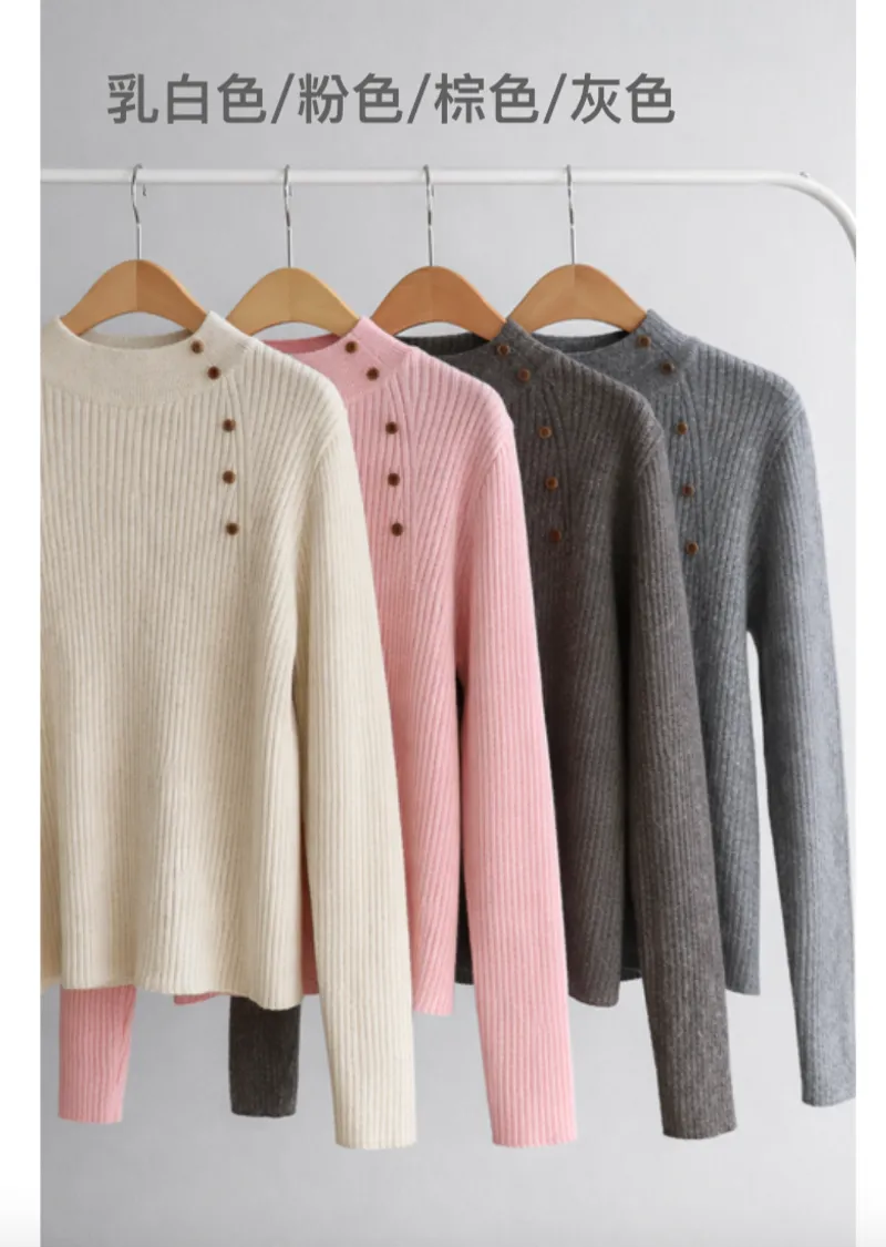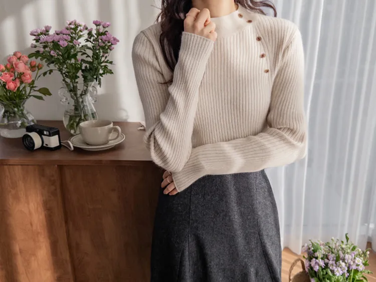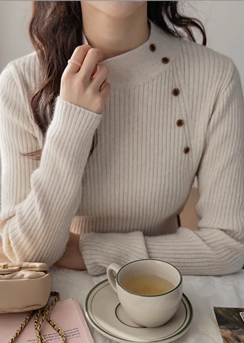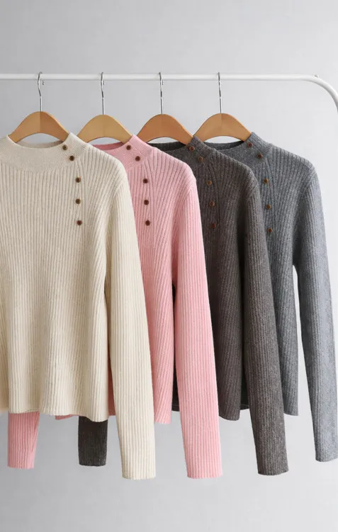 感性半領羅紋修身線條點綴鈕扣裝飾針織上衣