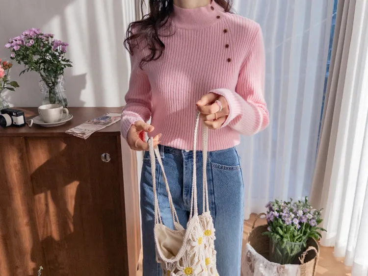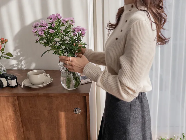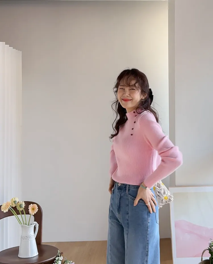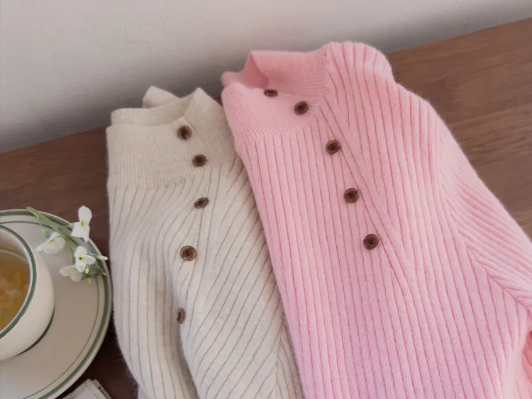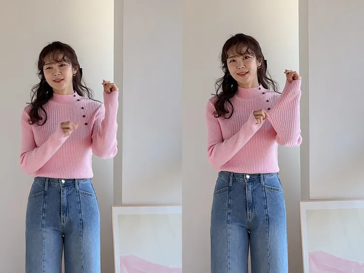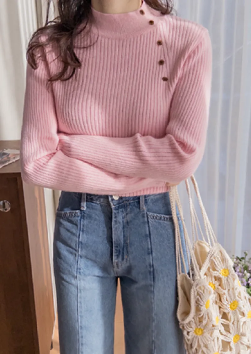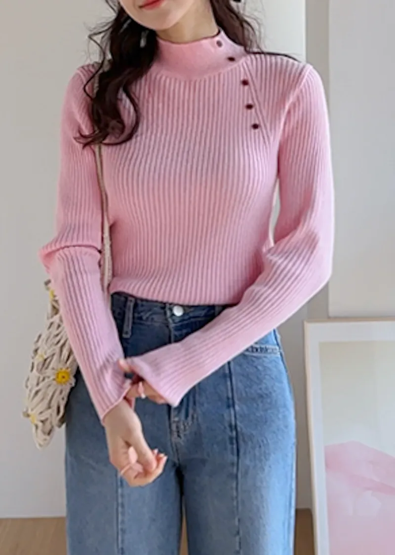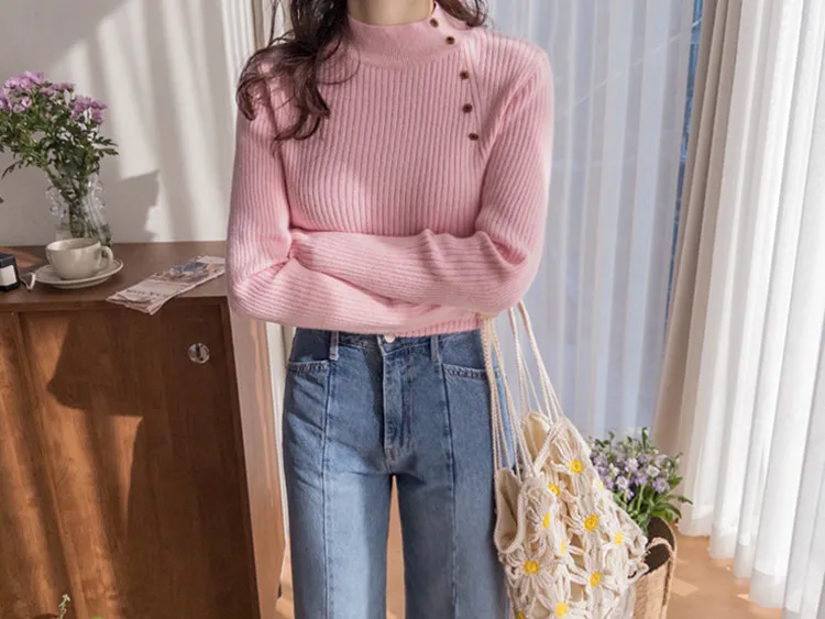 感性半領羅紋修身線條點綴鈕扣裝飾針織上衣