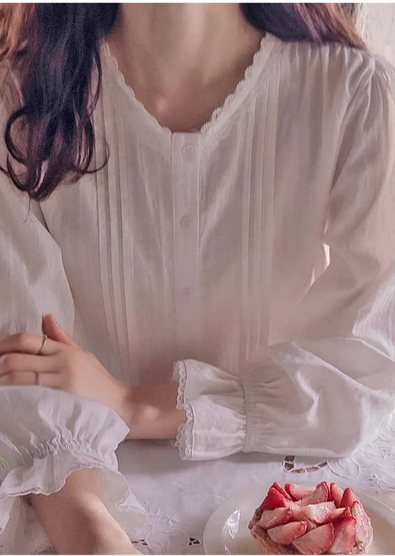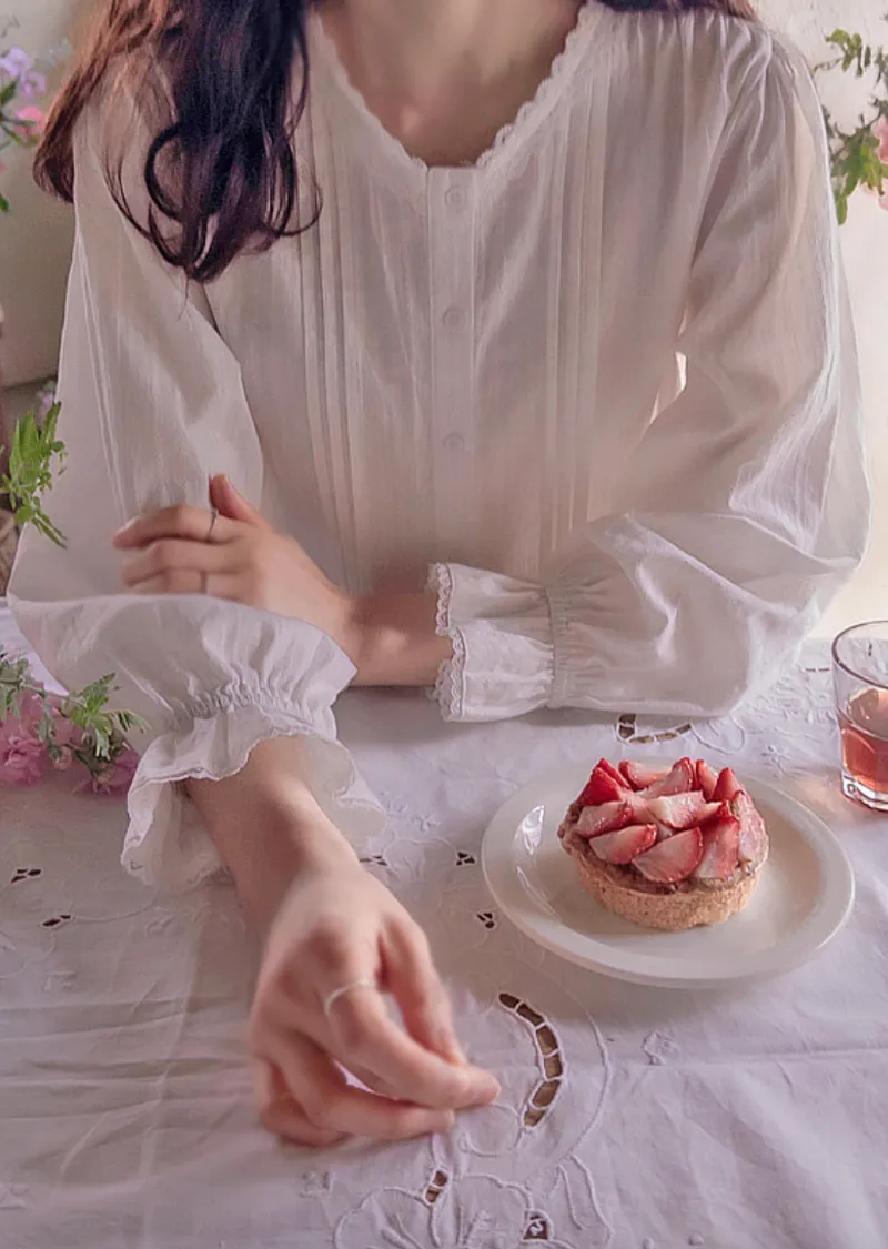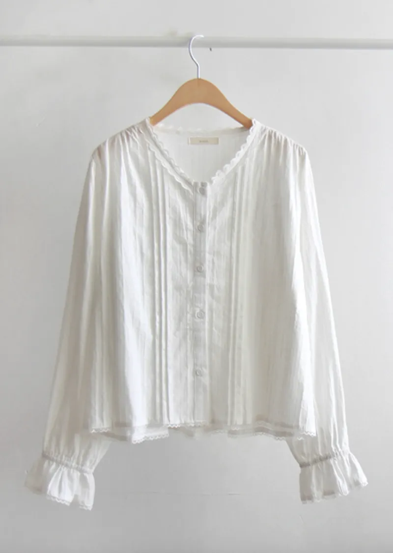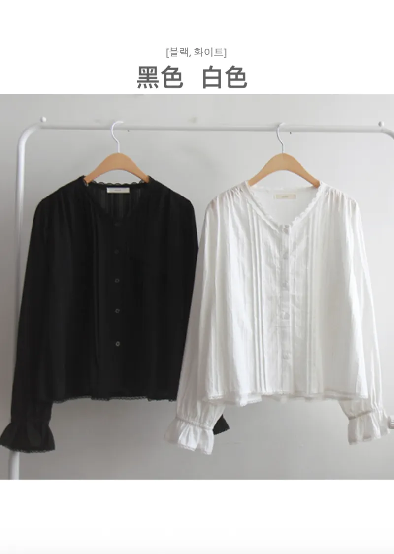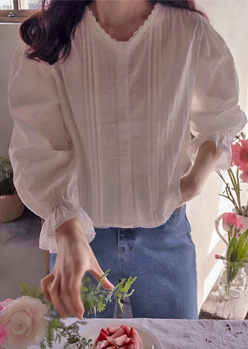 【袖帶設計】【領口精美,飾以波浪蕾絲的可愛上衣】【蕾絲裝飾盡顯精緻優雅】【蕾絲領口優雅迷人上衣】【褶襉設計,精緻優雅】