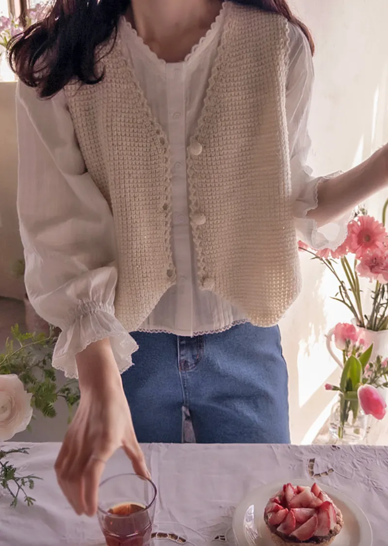 精緻優雅蕾絲波浪領褶襉排扣上衣