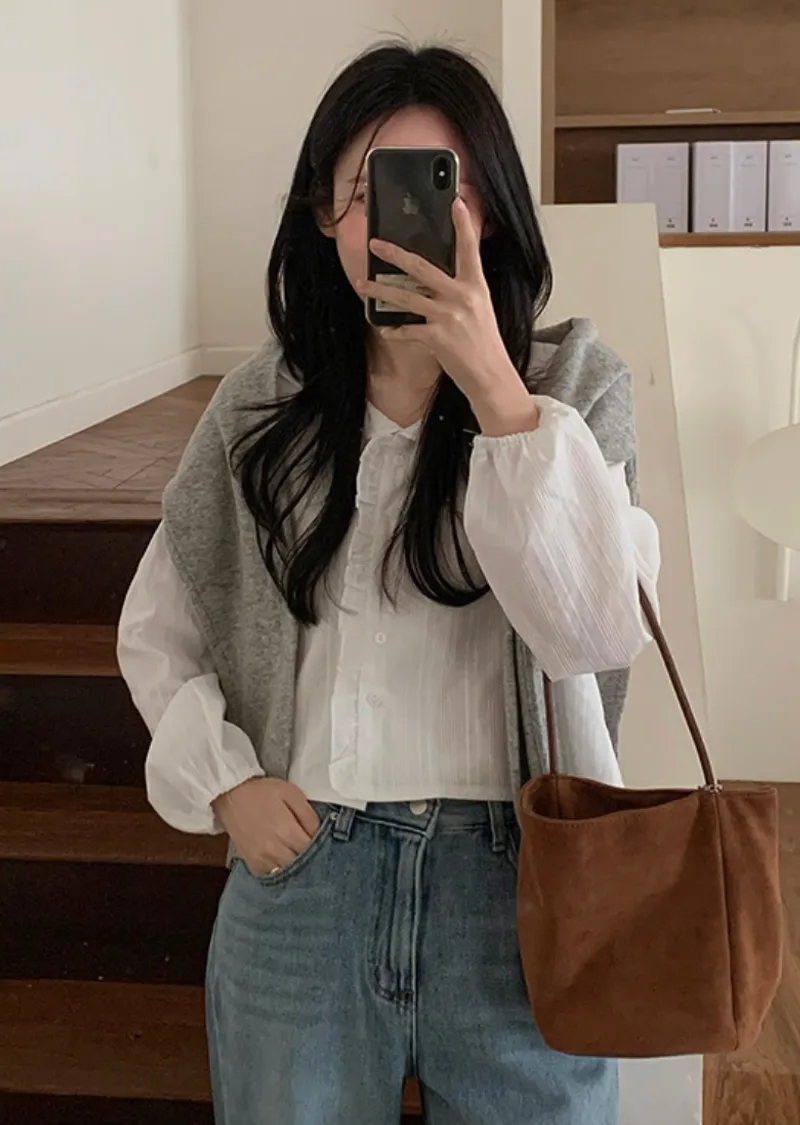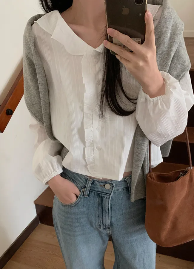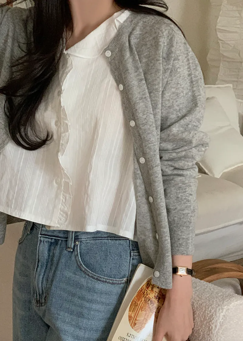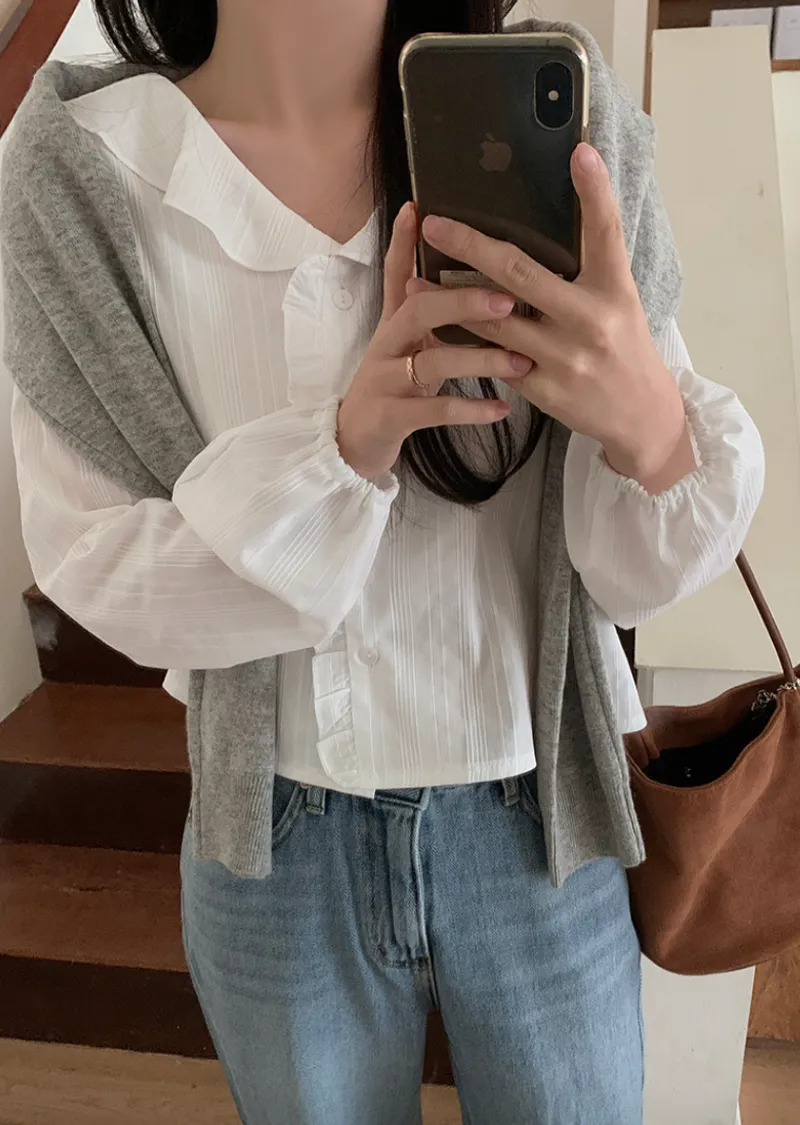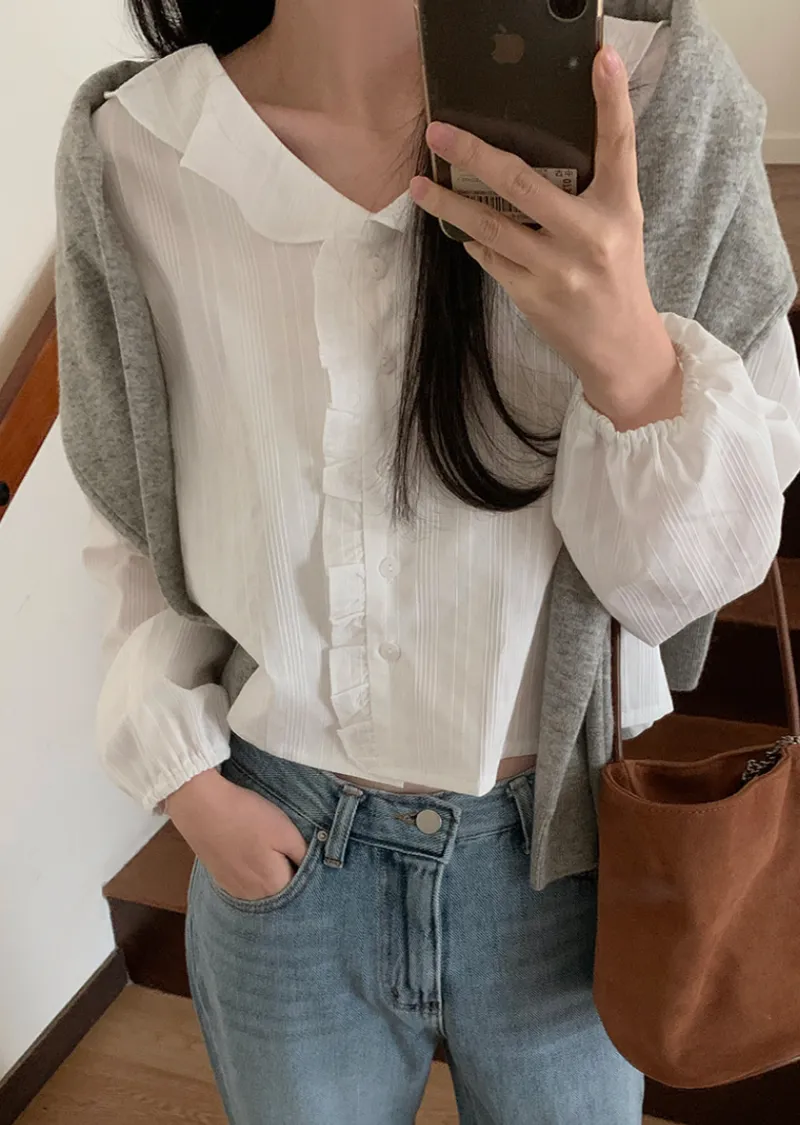 甜美荷葉摺邊領口柔和紋理排扣上衣