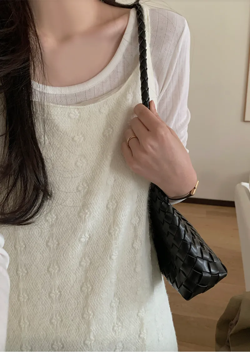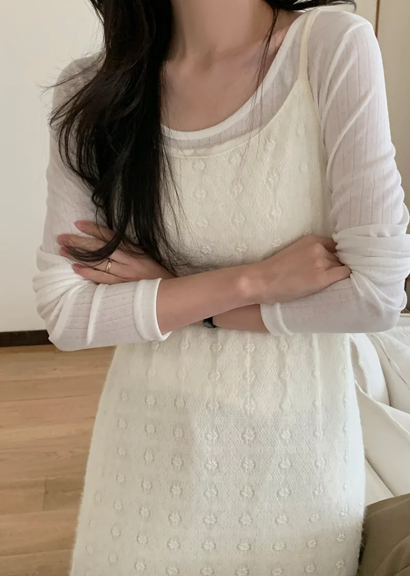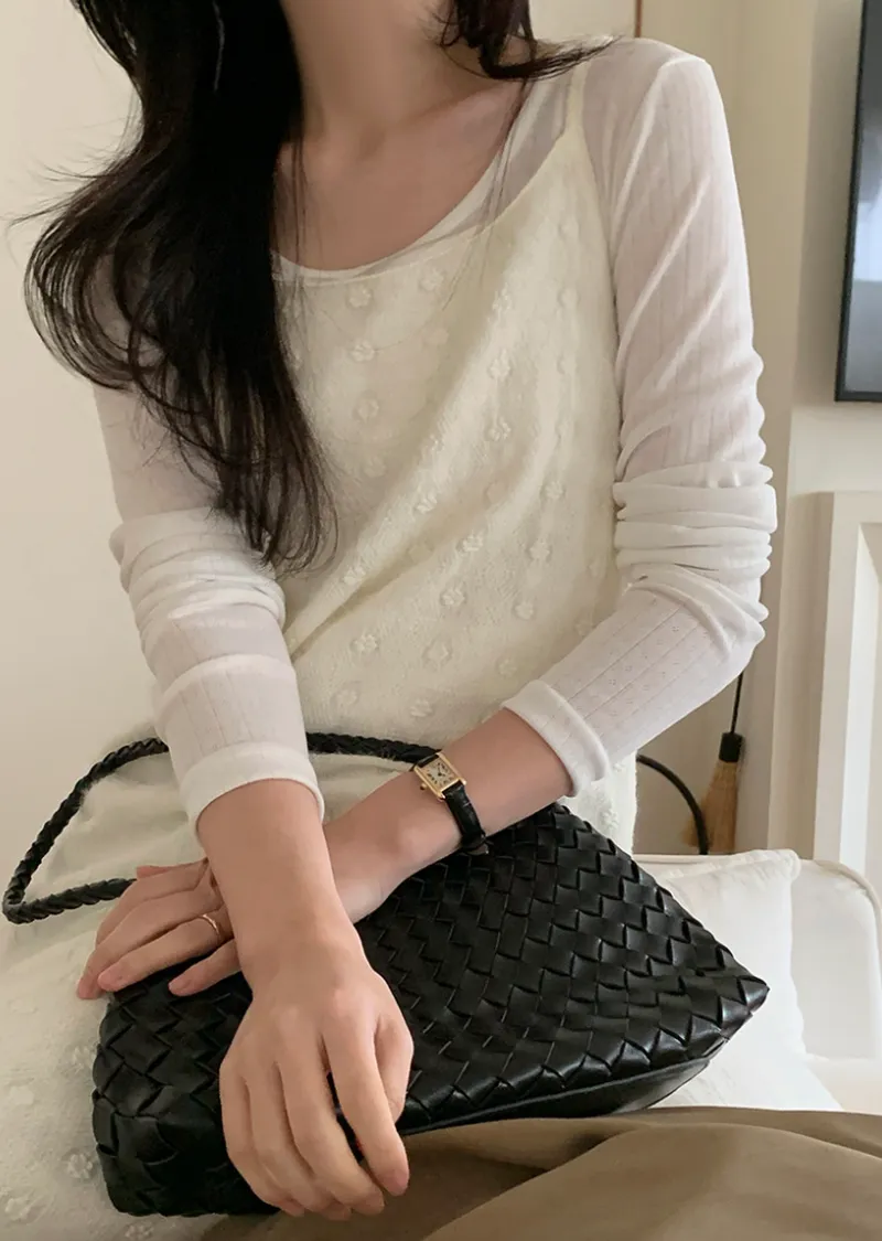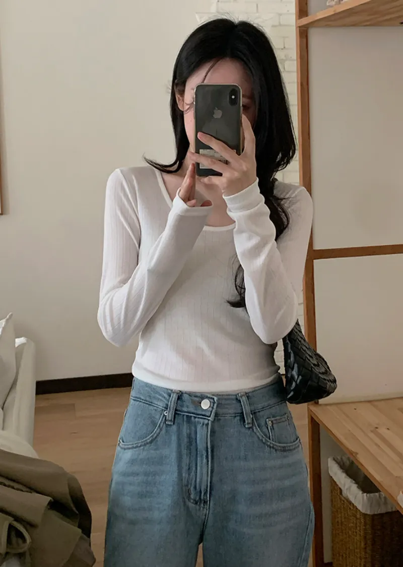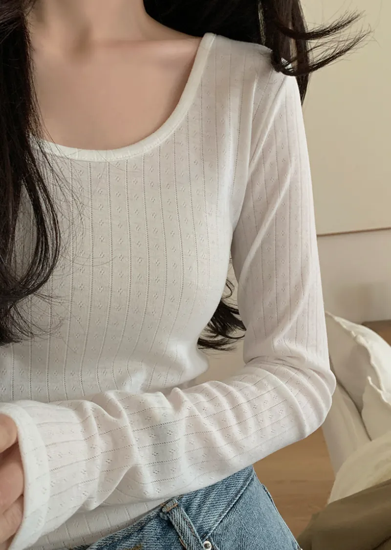 材質:90% 聚酯纖維 + 10% 氨綸。這款可愛的打孔上衣!豎紋打孔圖案為布料增添了一絲少女氣息♡修身剪裁搭配深U領,凸顯纖細的上半身線條。袖長剛好遮住手背 ,更顯纖細感。修身的版型 ,無論是作為內搭還是單穿,都能根據季節變換,非常百搭,強烈推薦入手:)