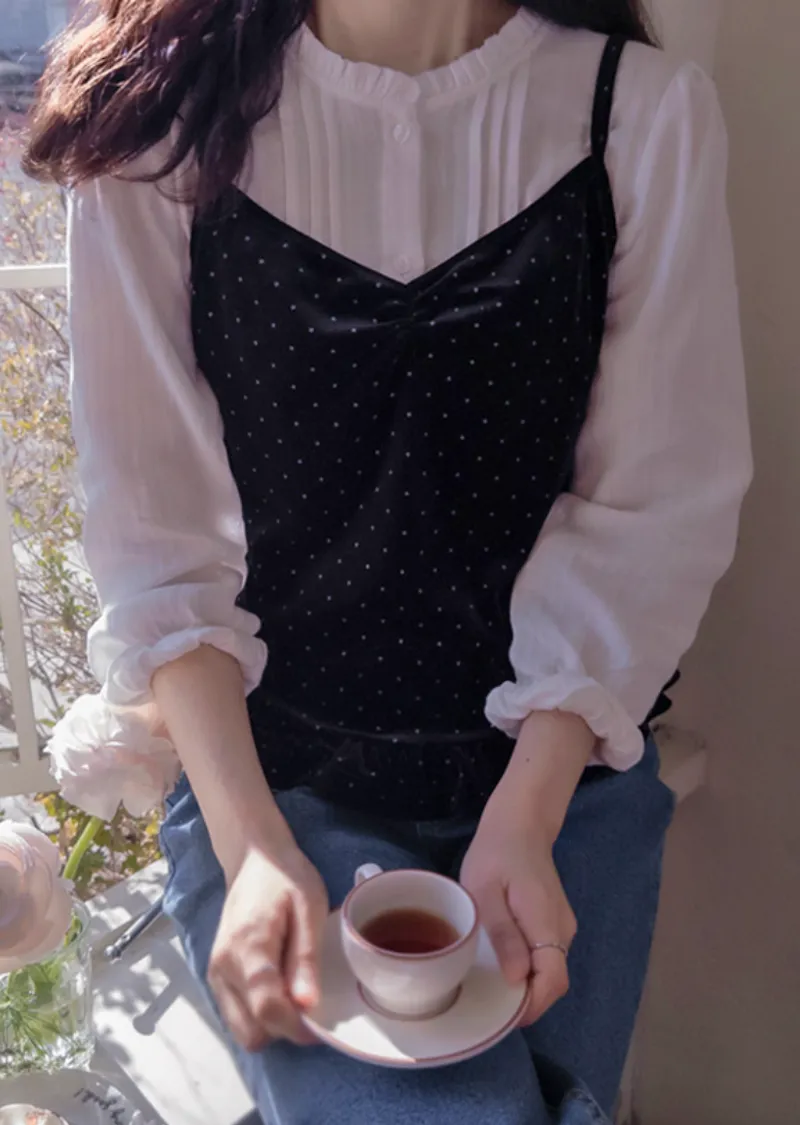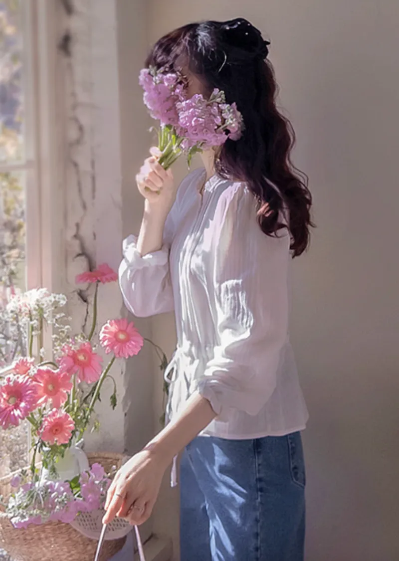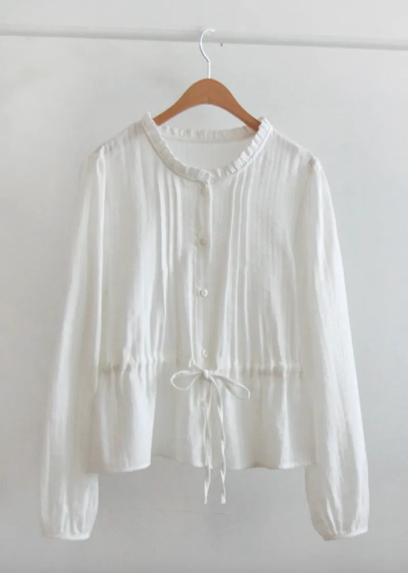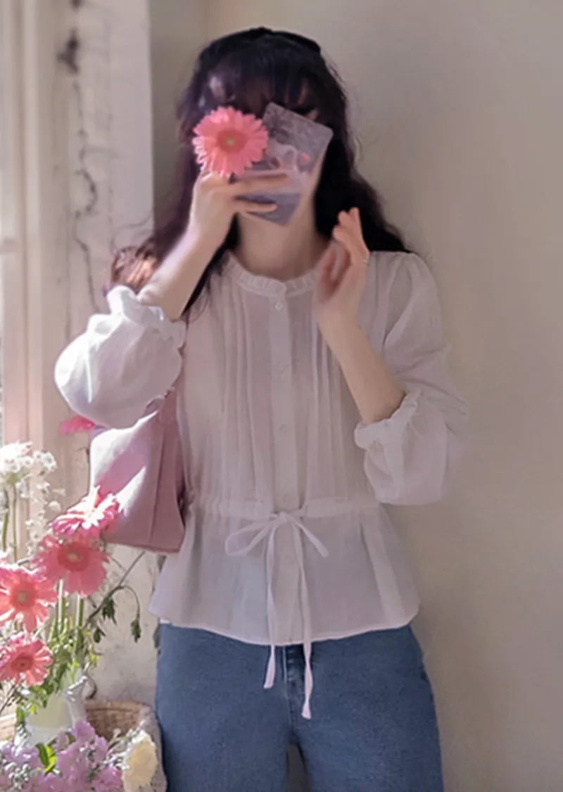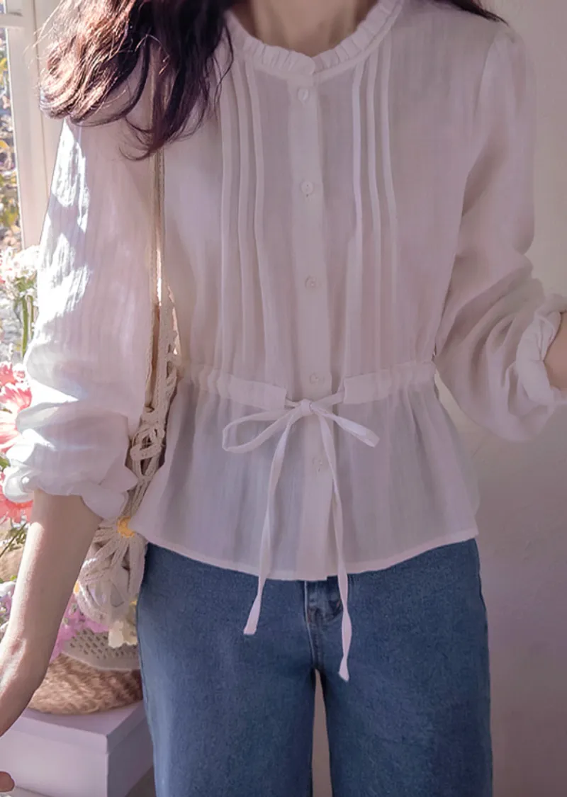 優雅領口褶皺腰綁帶褶襉設計排扣上衣