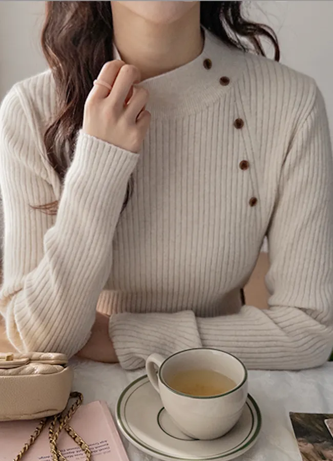 感性半領羅紋修身線條點綴鈕扣裝飾針織上衣