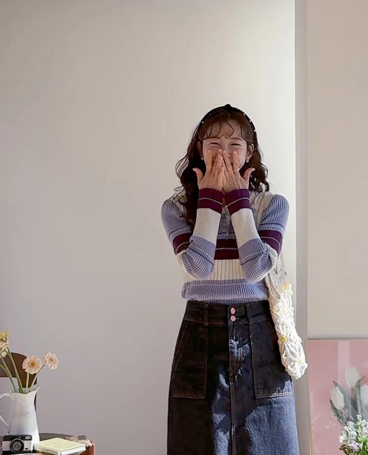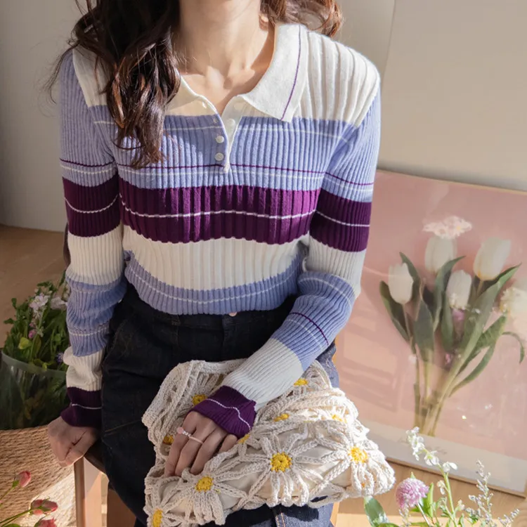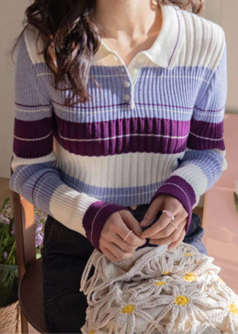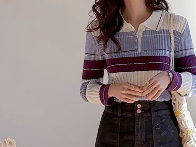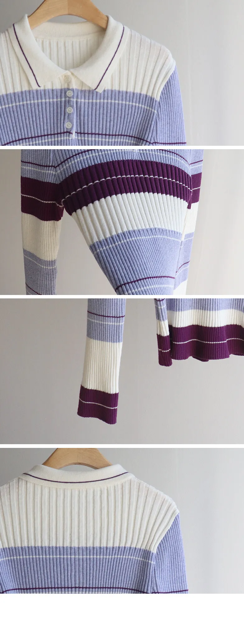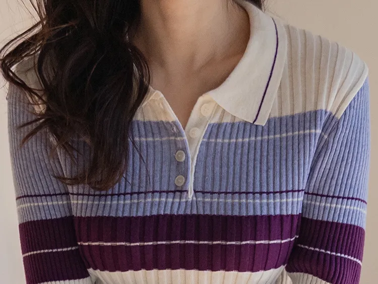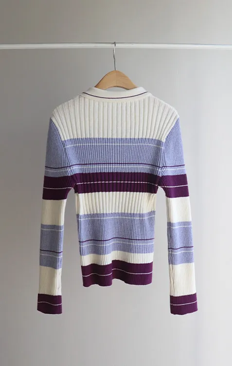 【配色針織衫,增添獨特韻味♥】【豎條紋羅紋勾勒纖細上身線條】【別緻的配色設計,打造獨特造型】【採用彈性氨綸面料,穿著舒適】