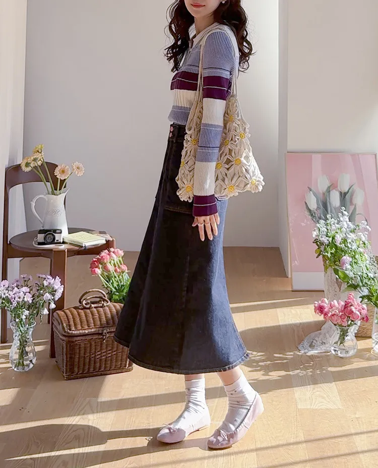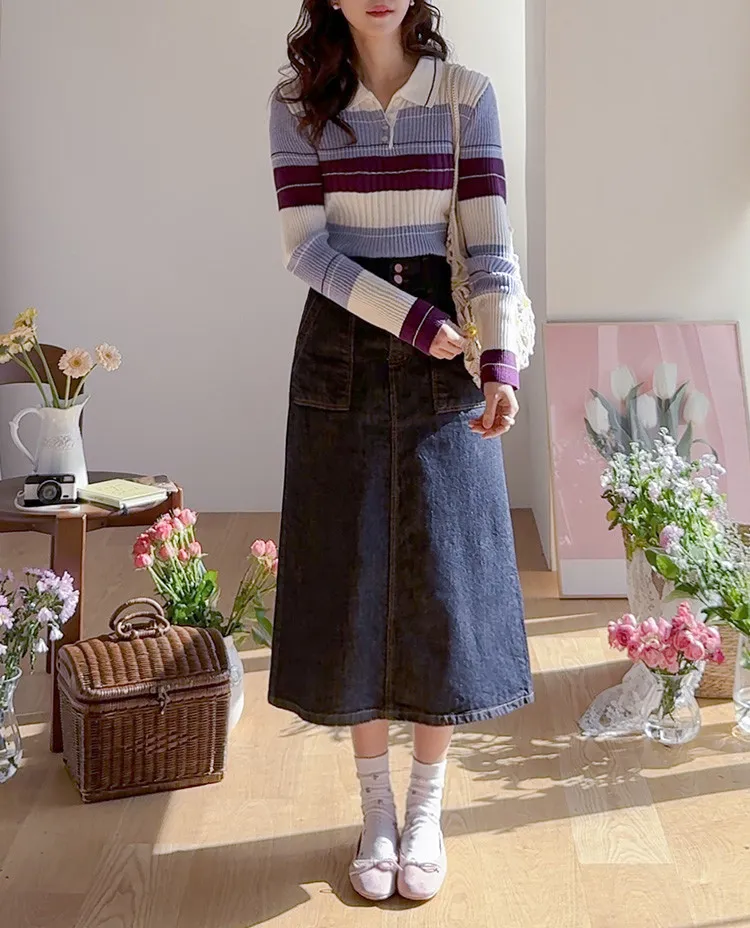舒適雙扣A字剪裁後開衩牛仔中長裙