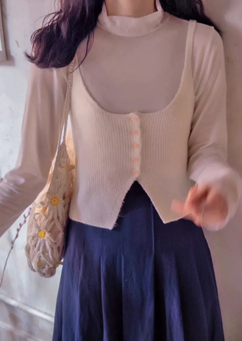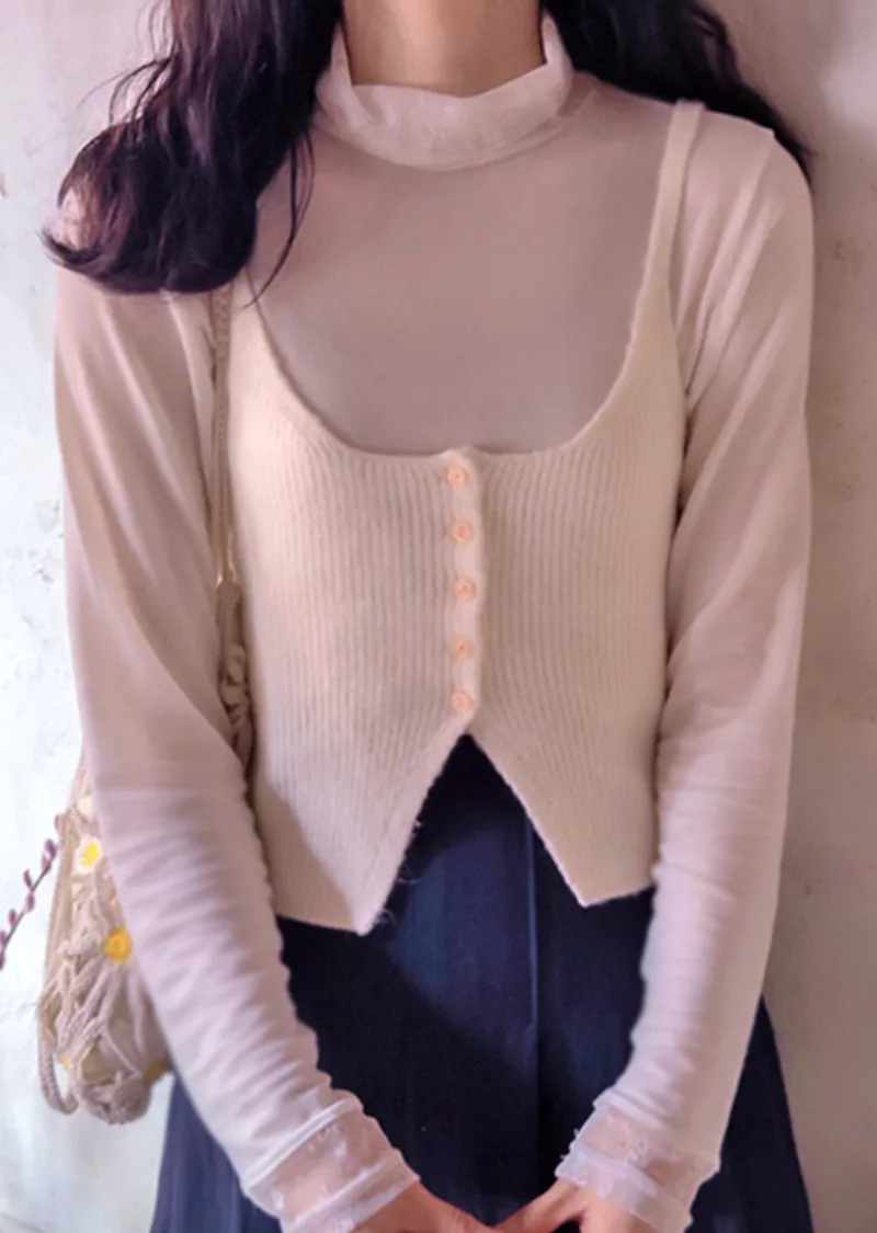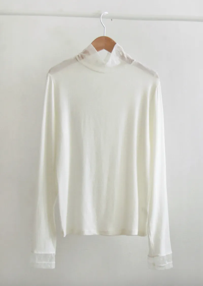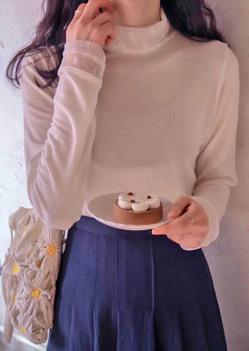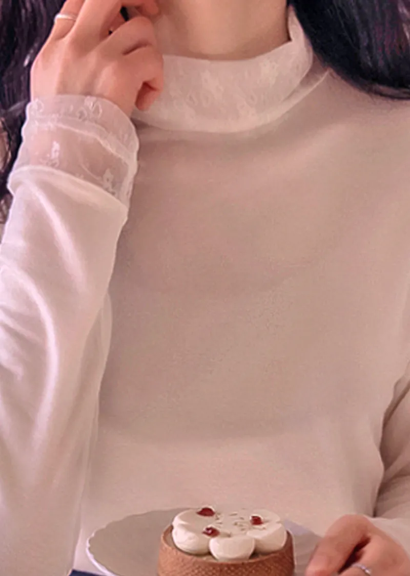 柔美領口袖末透膚蕾絲半高領可疊穿上衣