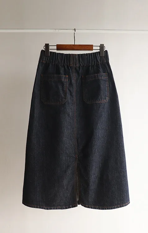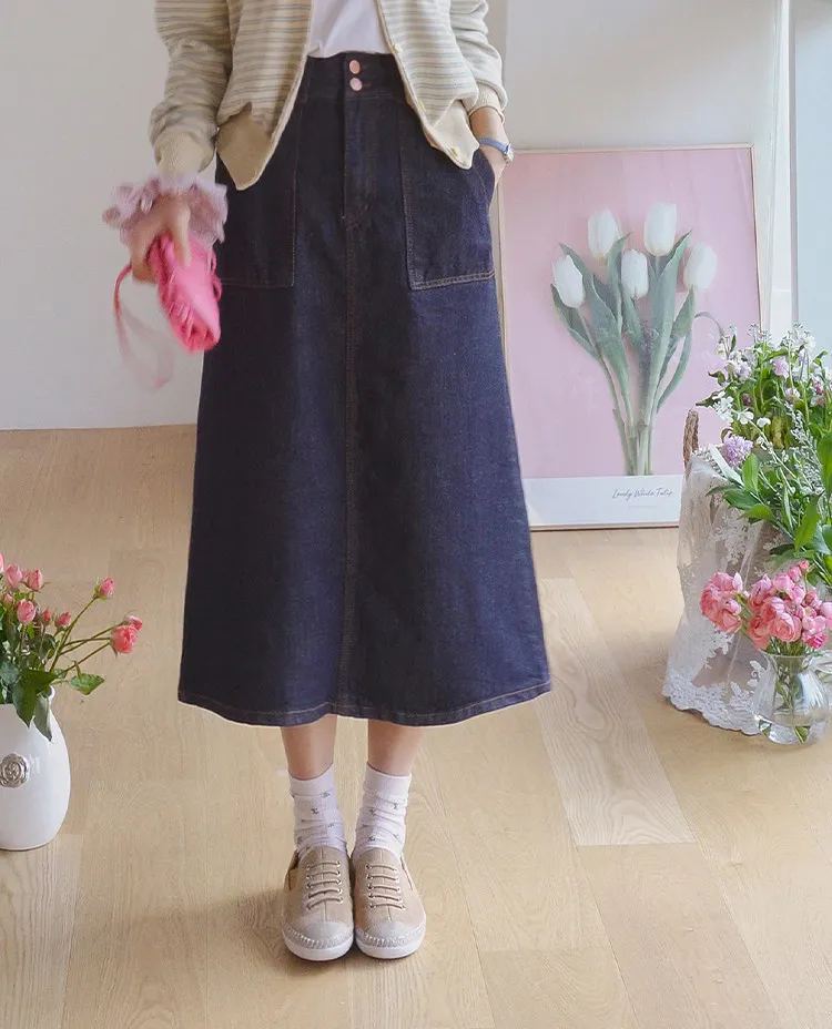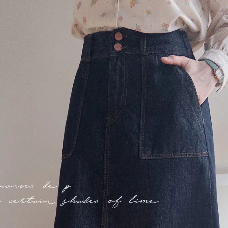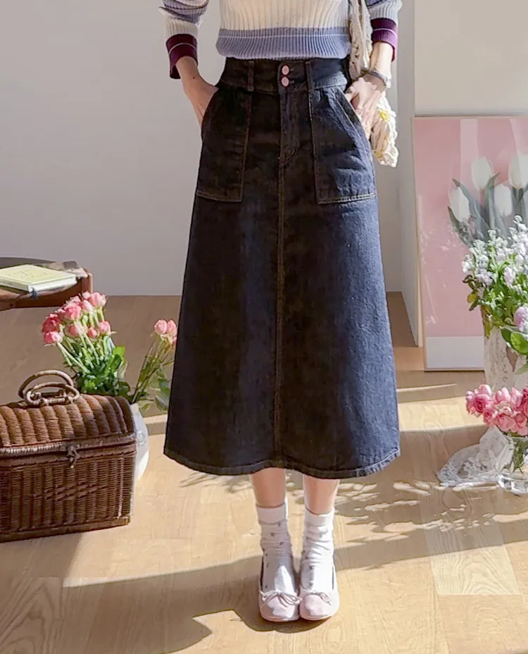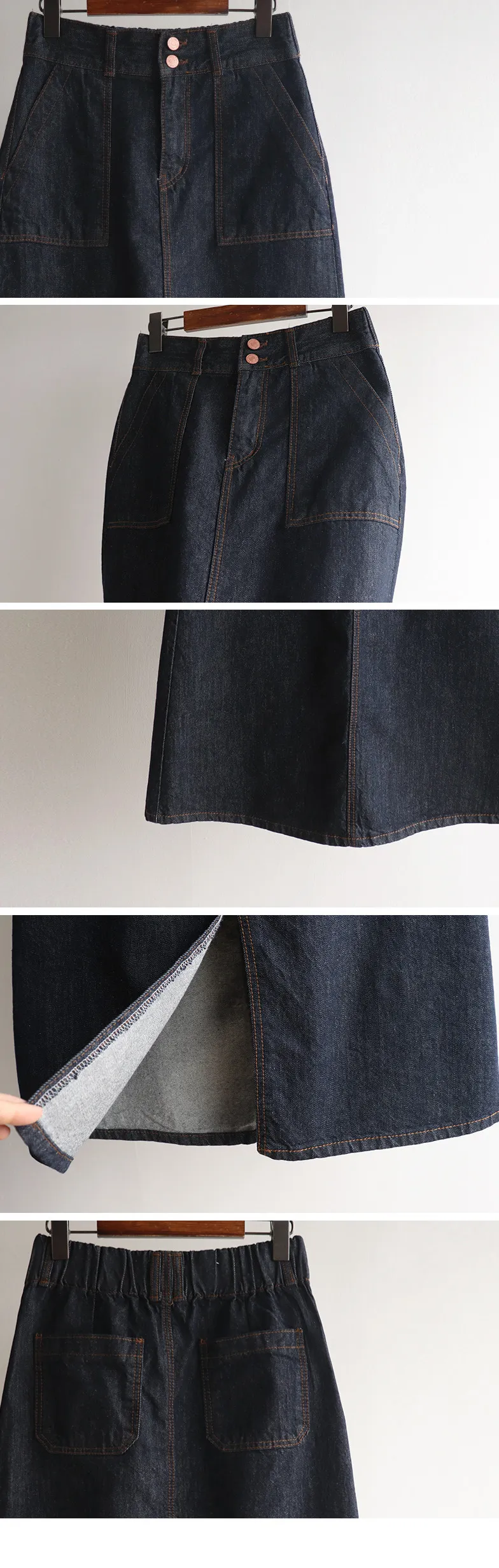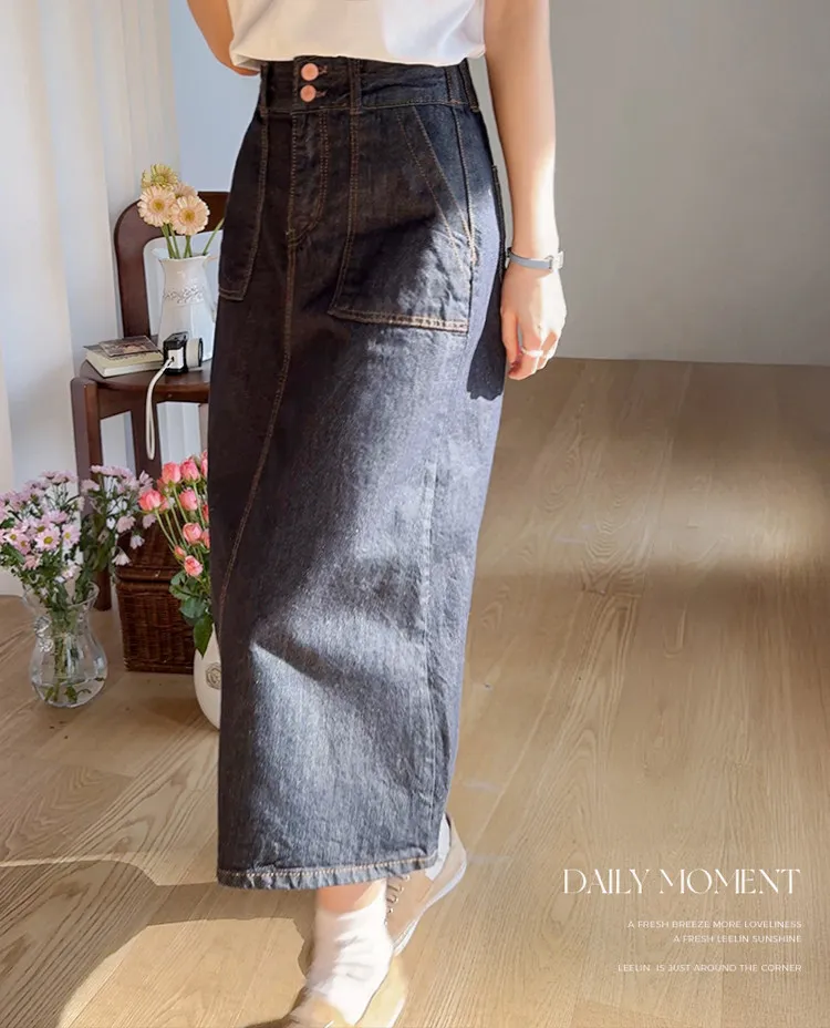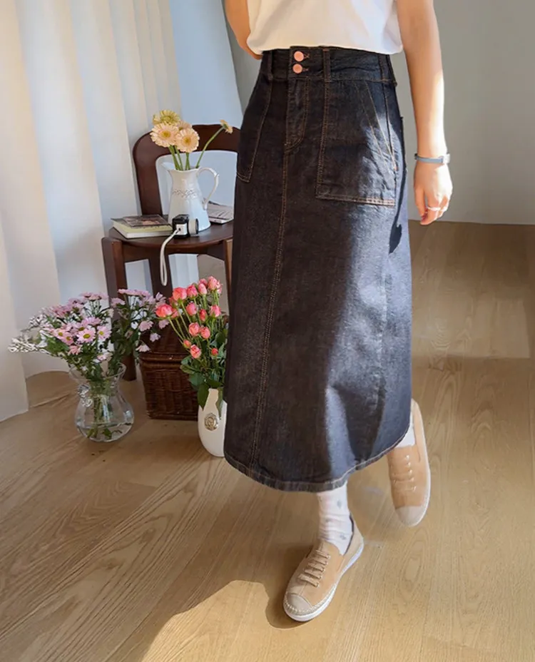 舒適雙扣A字剪裁後開衩牛仔中長裙