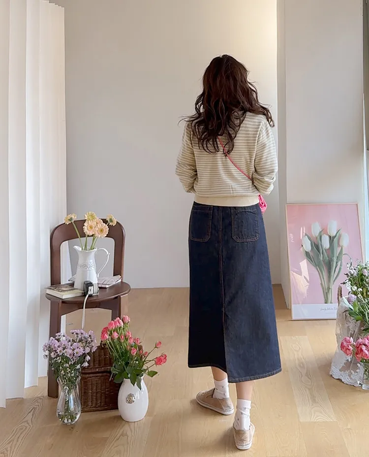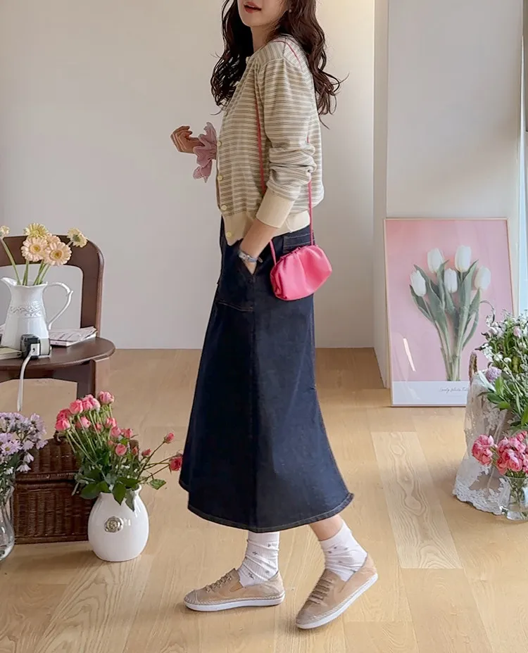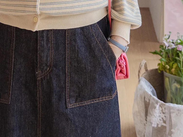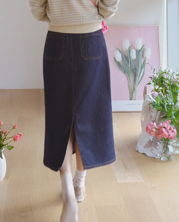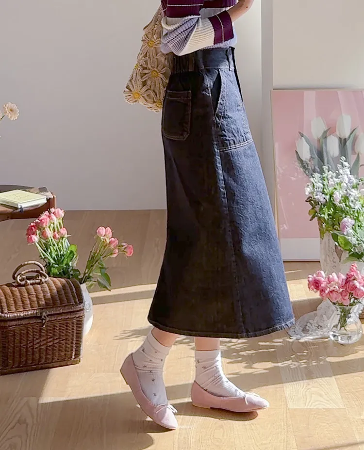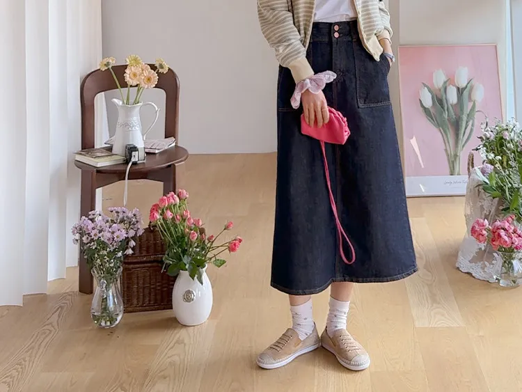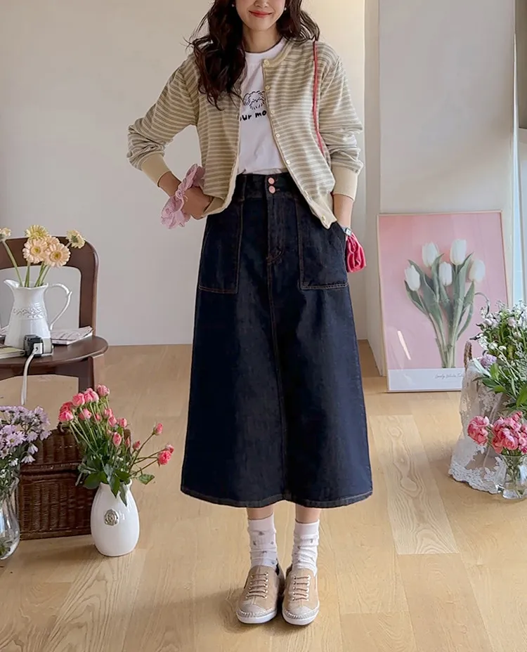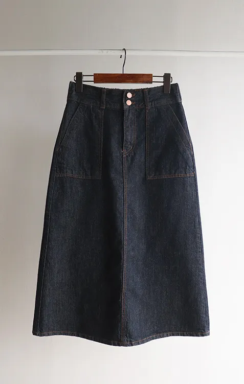 舒適雙扣A字剪裁後開衩牛仔中長裙